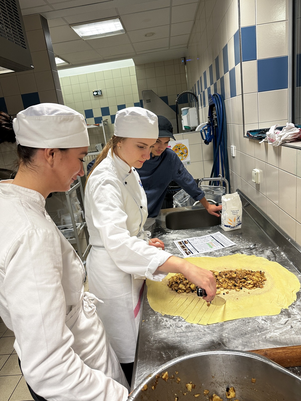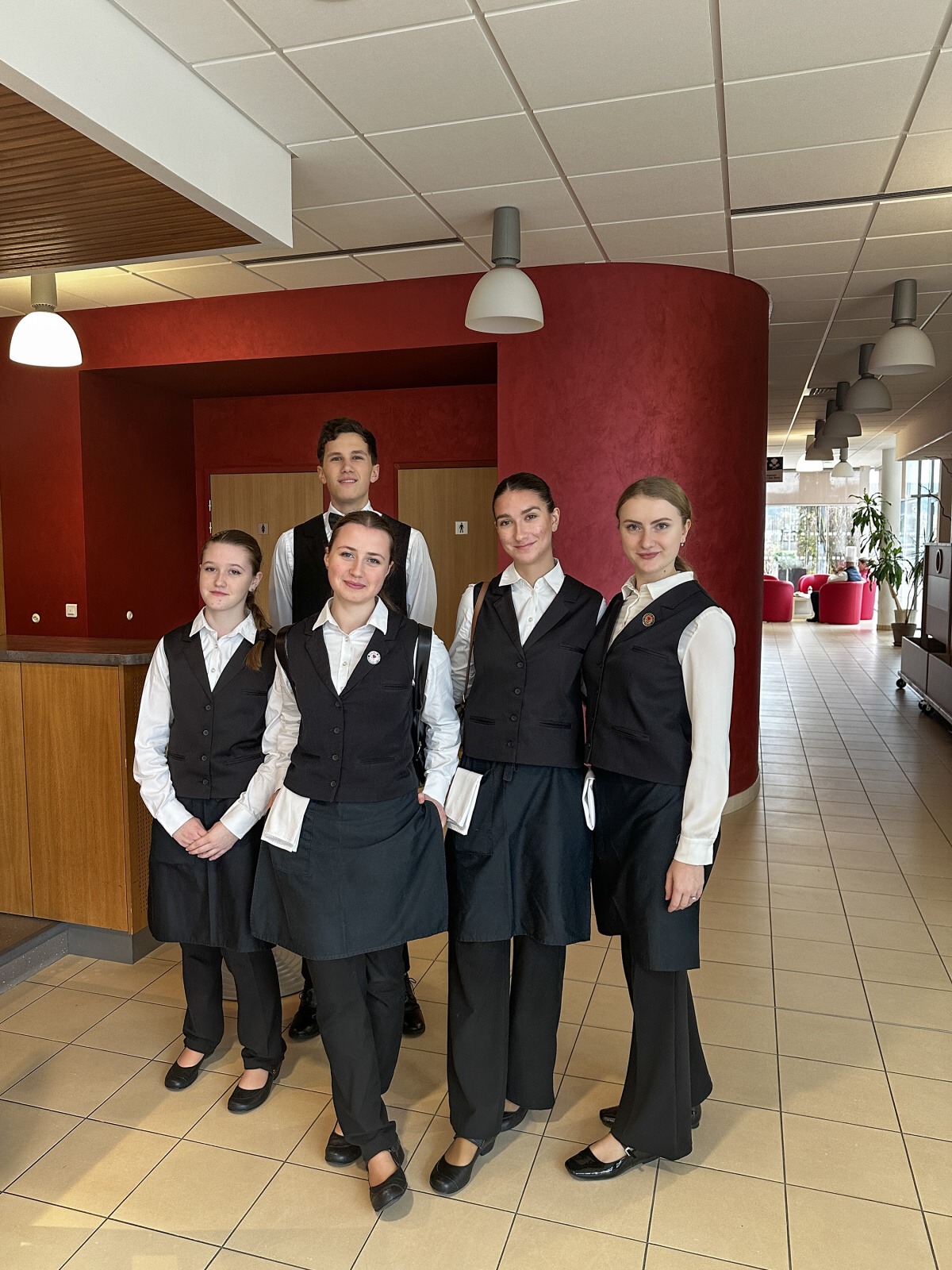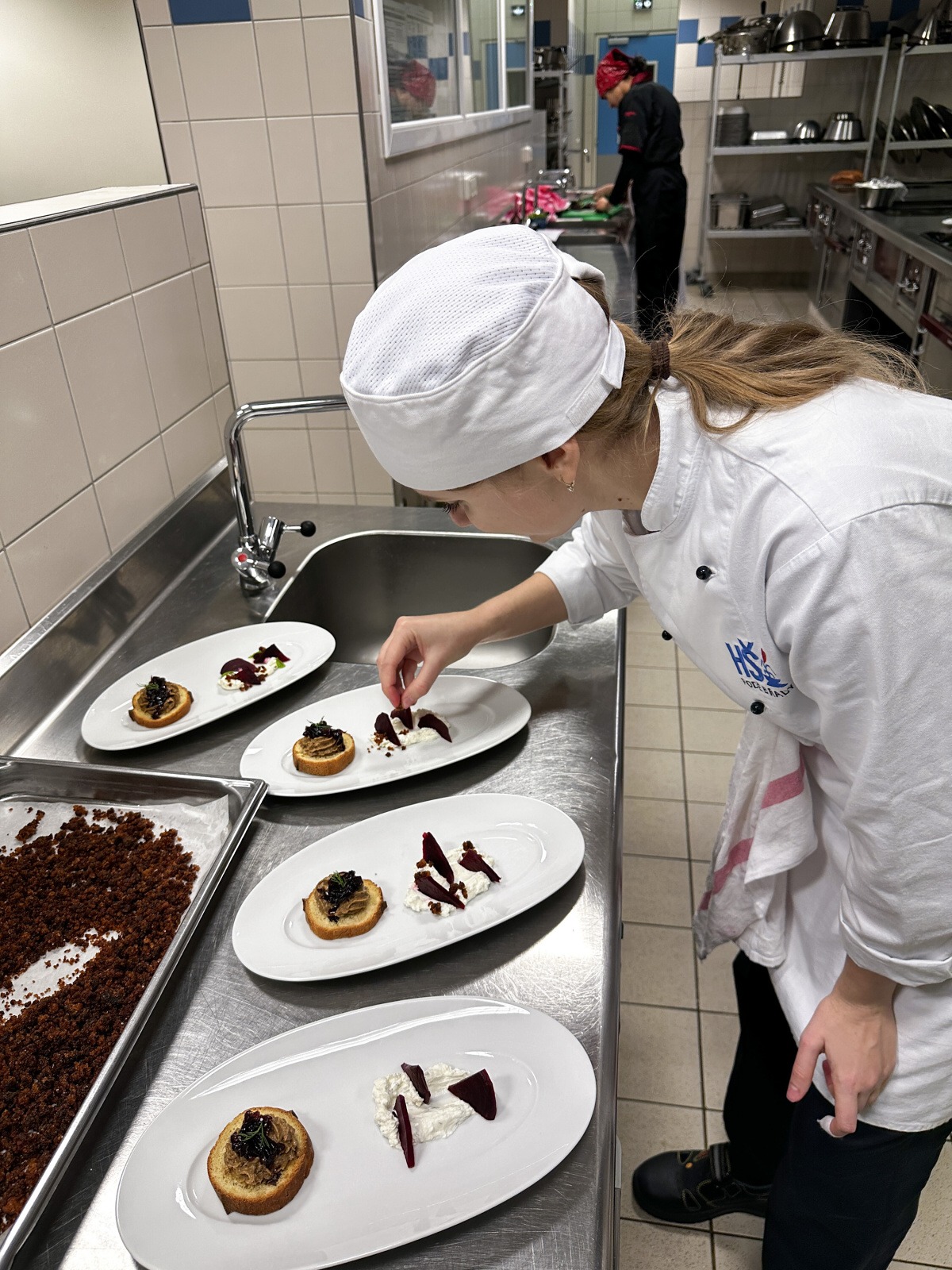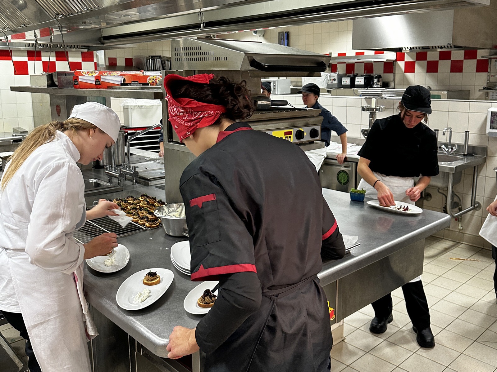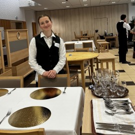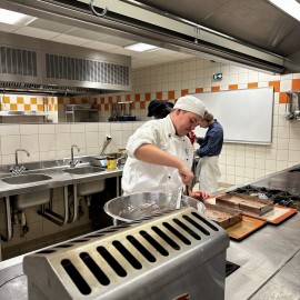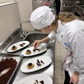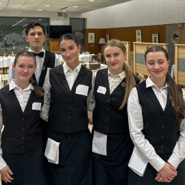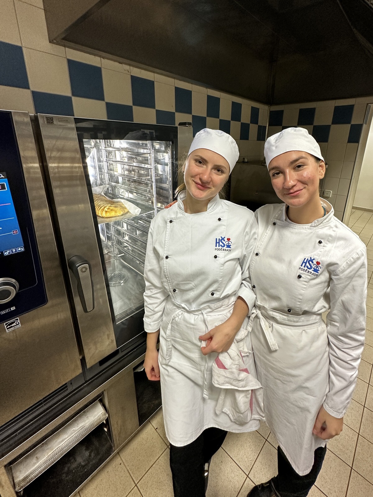 Čtvrteční ráno se naše skupina vydala na místní trhy s cílem podpořit udržitelnou gastronomii. Místní škola totiž nakupuje suroviny od lokálních dodavatelů a následně je využívá při večerním provozu restaurace. Odpoledne se tři z nás zapojili do obsluhy v restauraci a další tři pracovali v kuchyni, kde připravovali české menu. Mohli jsme si tak vyzkoušet práci s moderními technologiemi. Zážitek to určitě nebyl jen pro nás, ale i pro hosty, kteří přišli na večeři ochutnat českou kuchyni. Servírován byl hovězí vývar s játrovými knedlíčky, svíčková s karlovarským knedlíkem a jako dezert nechyběl jablečný závin přelitý vanilkovou omáčkou.