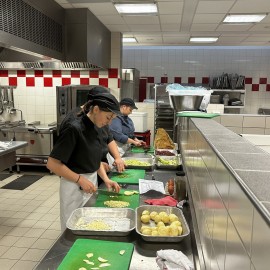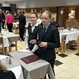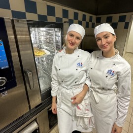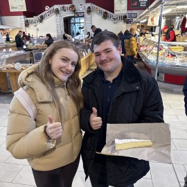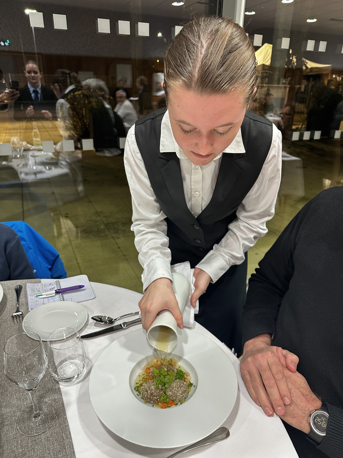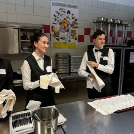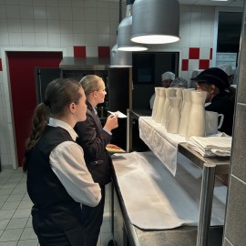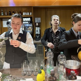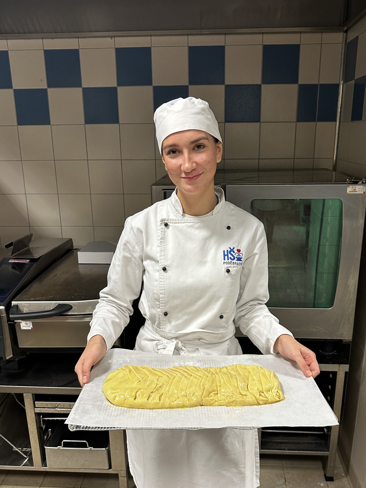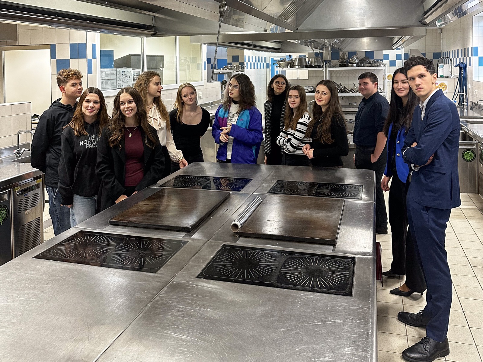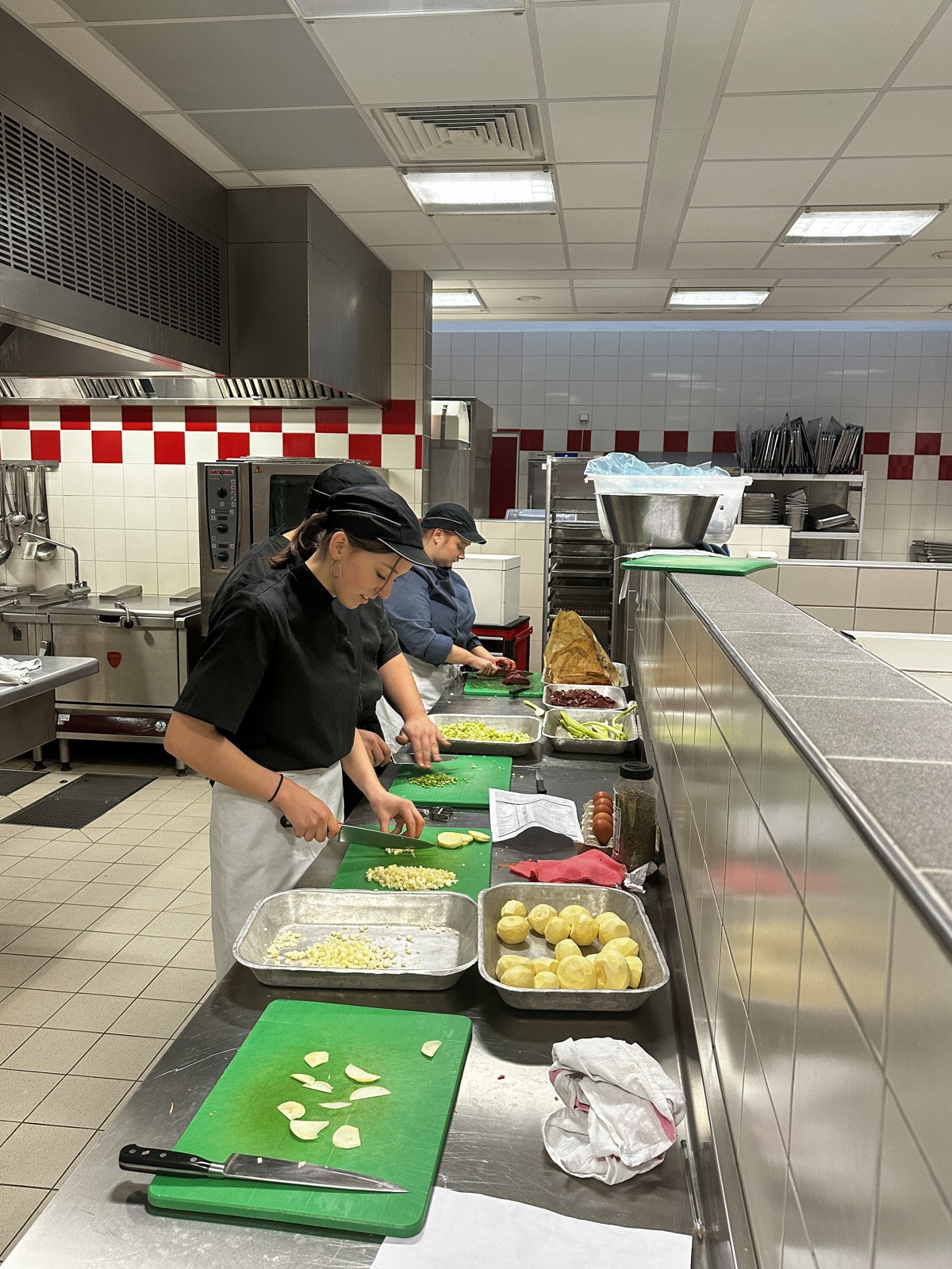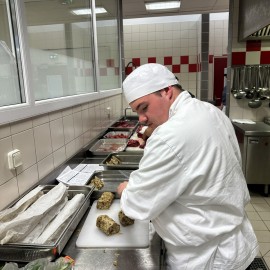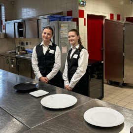 Čtvrteční ráno se naše skupina vydala na místní trhy s cílem podpořit udržitelnou gastronomii. Místní škola totiž nakupuje suroviny od lokálních dodavatelů a následně je využívá při večerním provozu restaurace. Odpoledne se tři z nás zapojili do obsluhy v restauraci a další tři pracovali v kuchyni, kde připravovali české menu. Mohli jsme si tak vyzkoušet práci s moderními technologiemi. Zážitek to určitě nebyl jen pro nás, ale i pro hosty, kteří přišli na večeři ochutnat českou kuchyni. Servírován byl hovězí vývar s játrovými knedlíčky, svíčková s karlovarským knedlíkem a jako dezert nechyběl jablečný závin přelitý vanilkovou omáčkou.