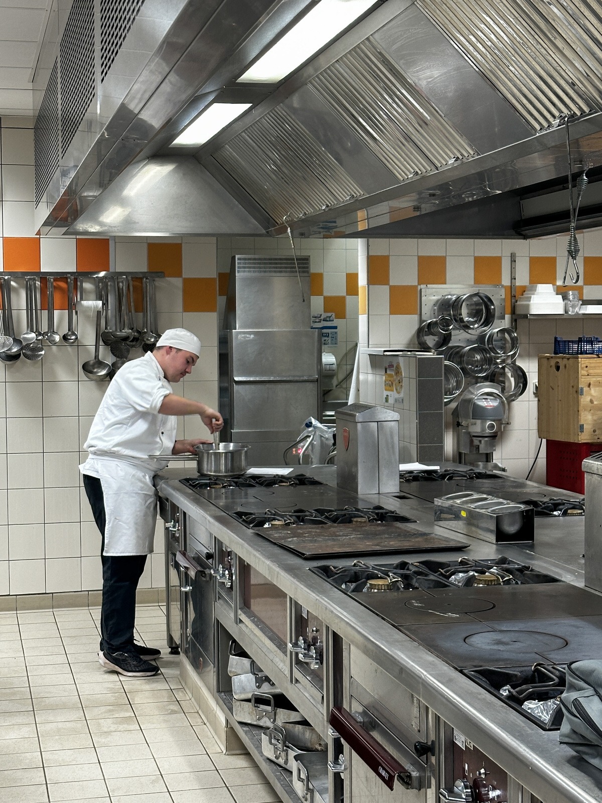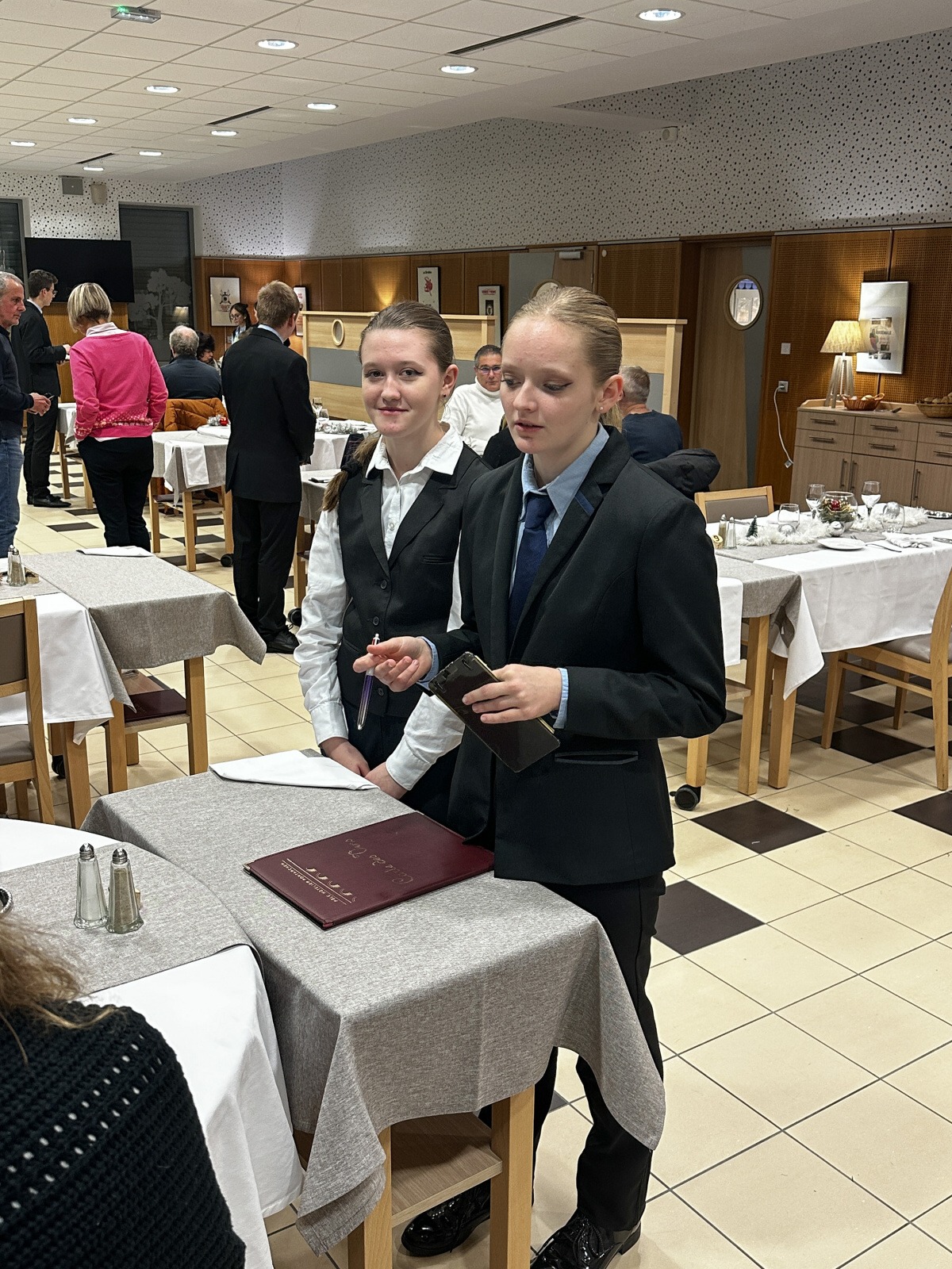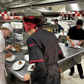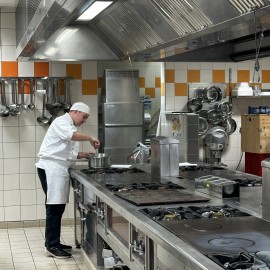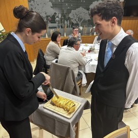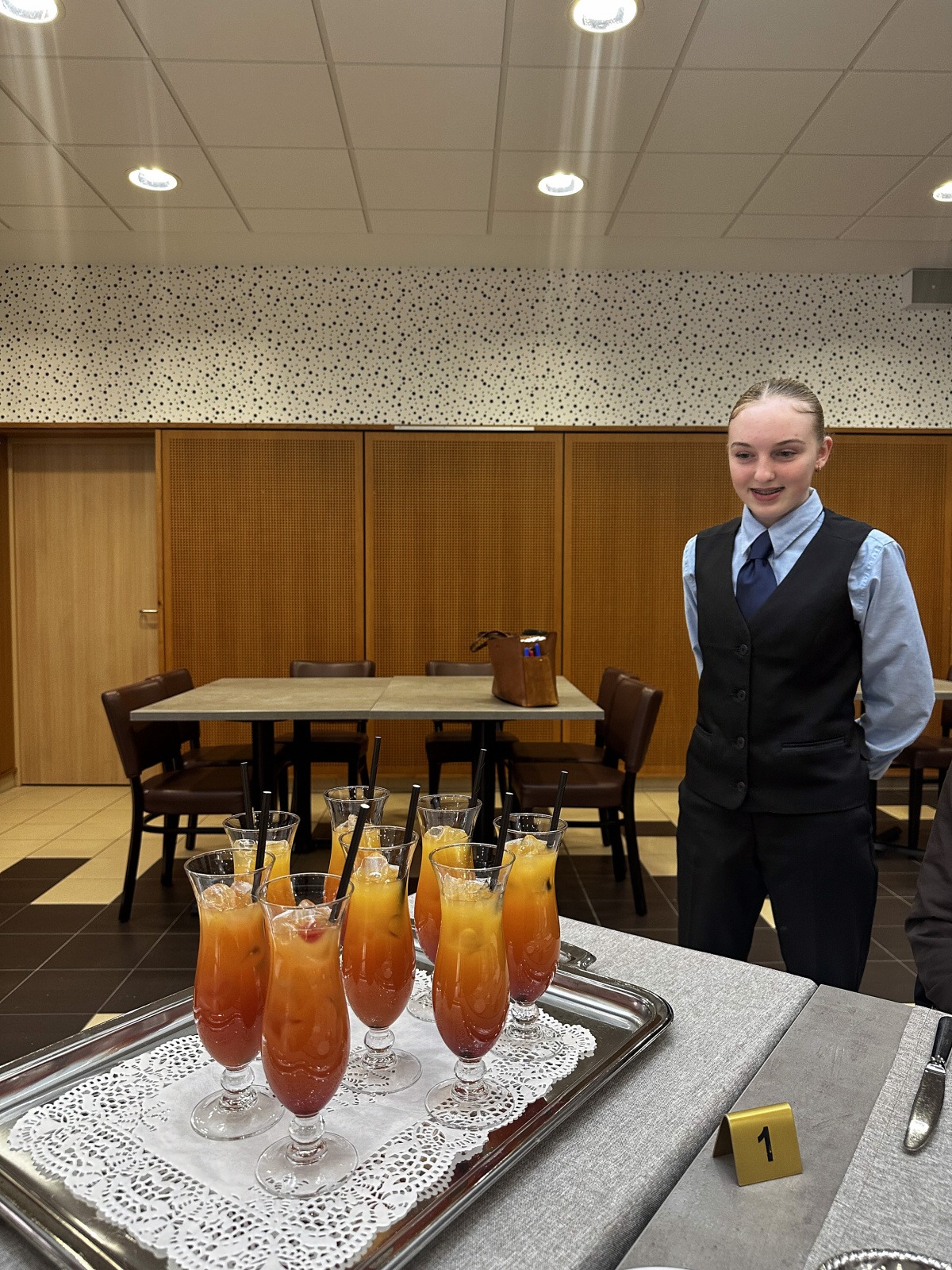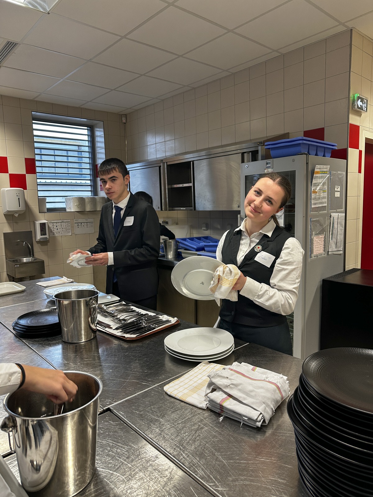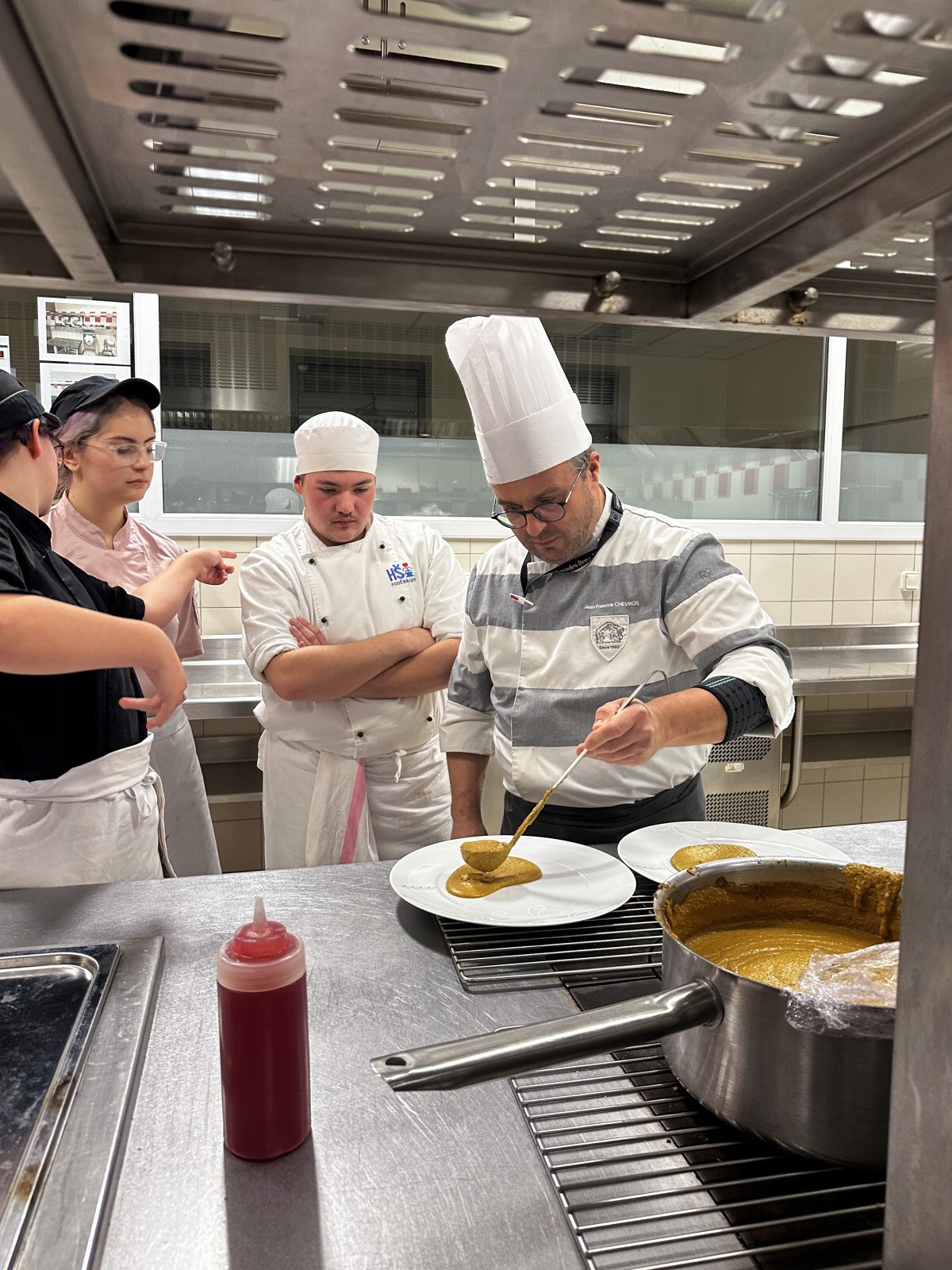 Čtvrteční ráno se naše skupina vydala na místní trhy s cílem podpořit udržitelnou gastronomii. Místní škola totiž nakupuje suroviny od lokálních dodavatelů a následně je využívá při večerním provozu restaurace. Odpoledne se tři z nás zapojili do obsluhy v restauraci a další tři pracovali v kuchyni, kde připravovali české menu. Mohli jsme si tak vyzkoušet práci s moderními technologiemi. Zážitek to určitě nebyl jen pro nás, ale i pro hosty, kteří přišli na večeři ochutnat českou kuchyni. Servírován byl hovězí vývar s játrovými knedlíčky, svíčková s karlovarským knedlíkem a jako dezert nechyběl jablečný závin přelitý vanilkovou omáčkou.