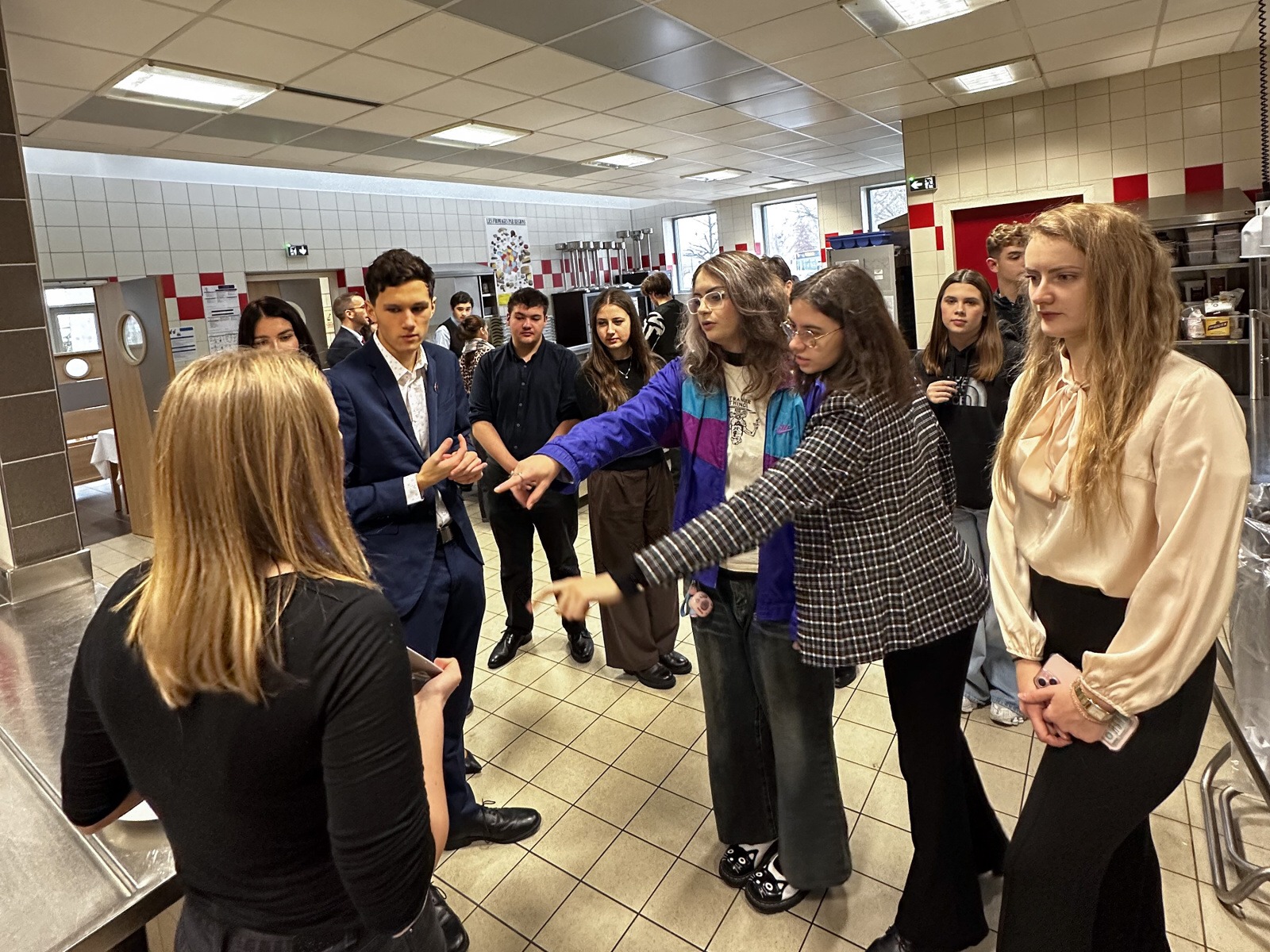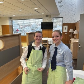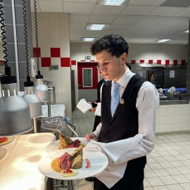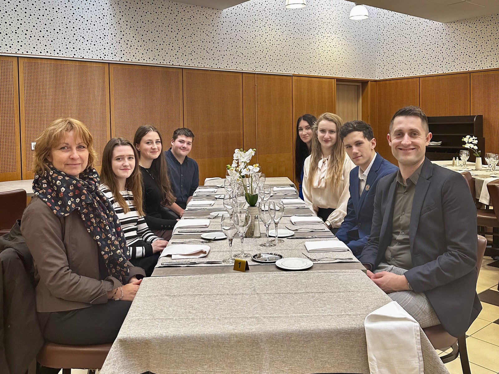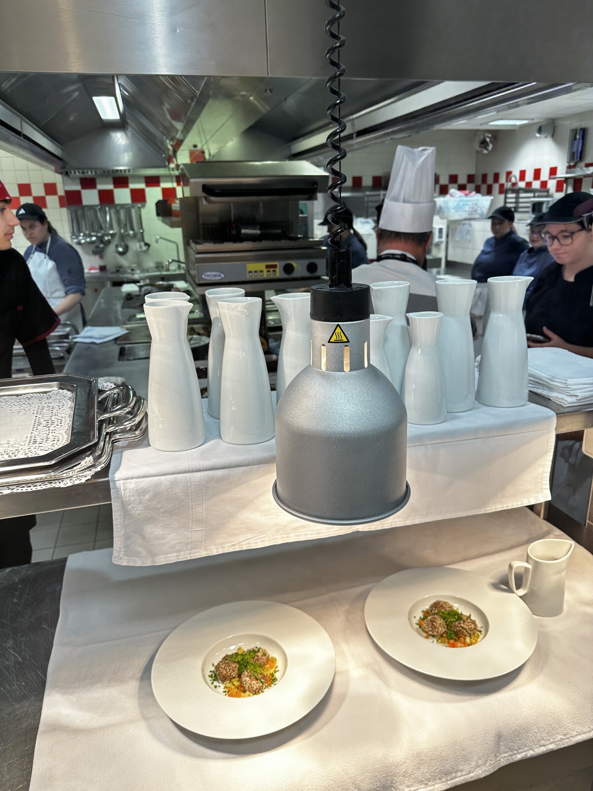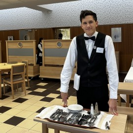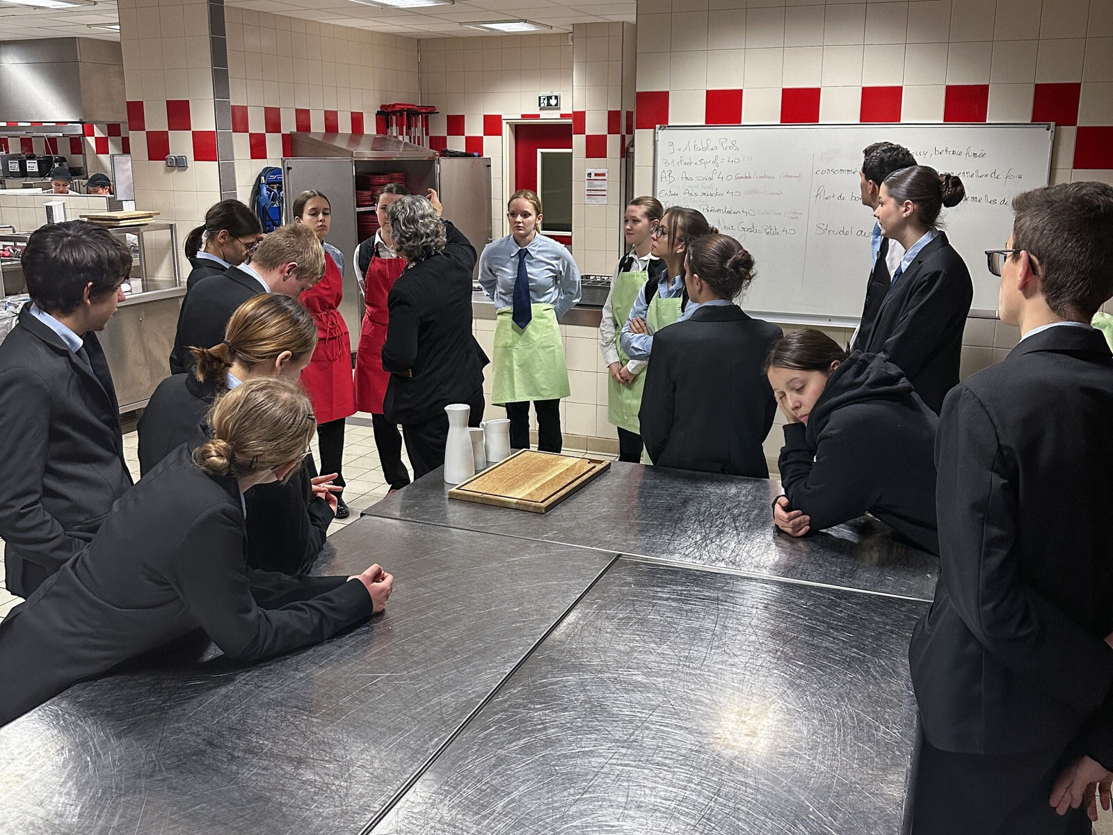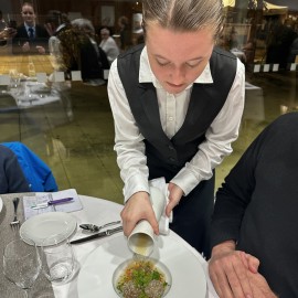 Čtvrteční ráno se naše skupina vydala na místní trhy s cílem podpořit udržitelnou gastronomii. Místní škola totiž nakupuje suroviny od lokálních dodavatelů a následně je využívá při večerním provozu restaurace. Odpoledne se tři z nás zapojili do obsluhy v restauraci a další tři pracovali v kuchyni, kde připravovali české menu. Mohli jsme si tak vyzkoušet práci s moderními technologiemi. Zážitek to určitě nebyl jen pro nás, ale i pro hosty, kteří přišli na večeři ochutnat českou kuchyni. Servírován byl hovězí vývar s játrovými knedlíčky, svíčková s karlovarským knedlíkem a jako dezert nechyběl jablečný závin přelitý vanilkovou omáčkou.