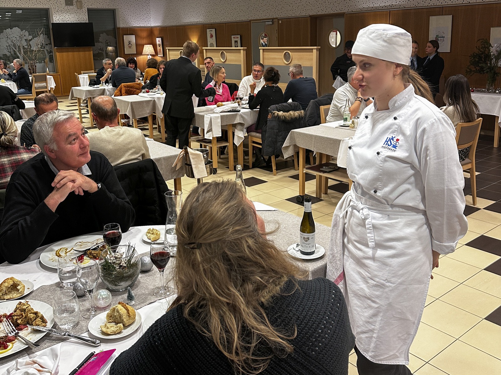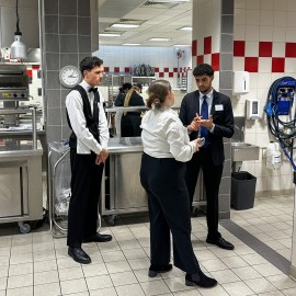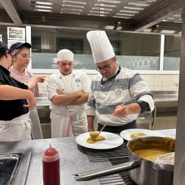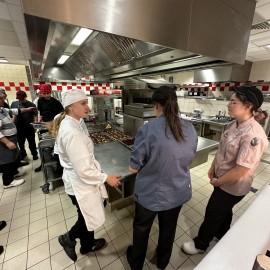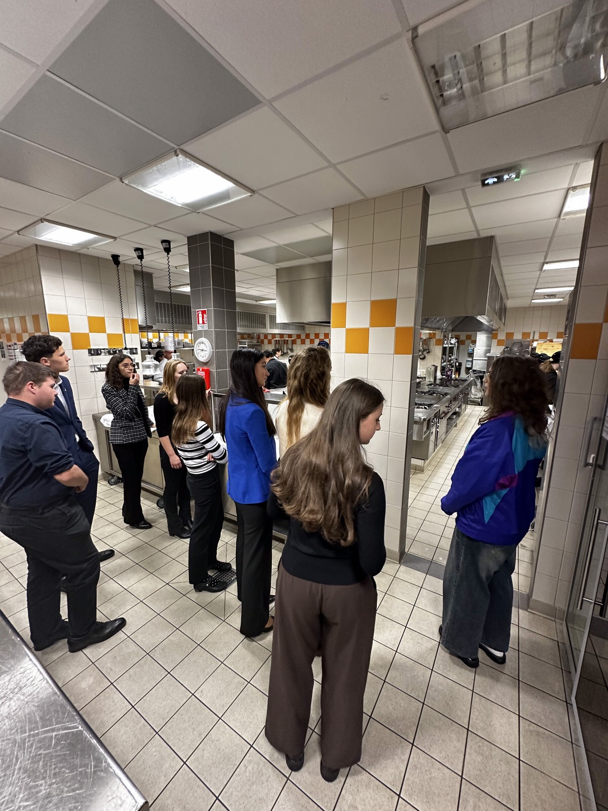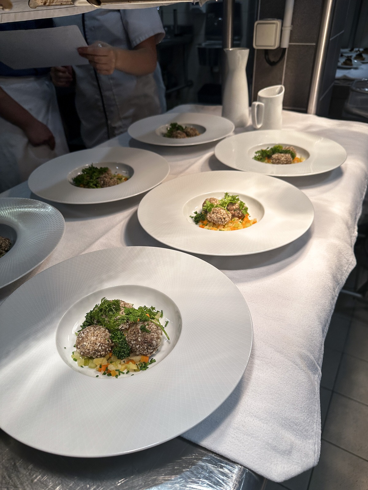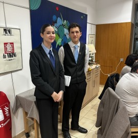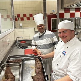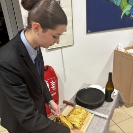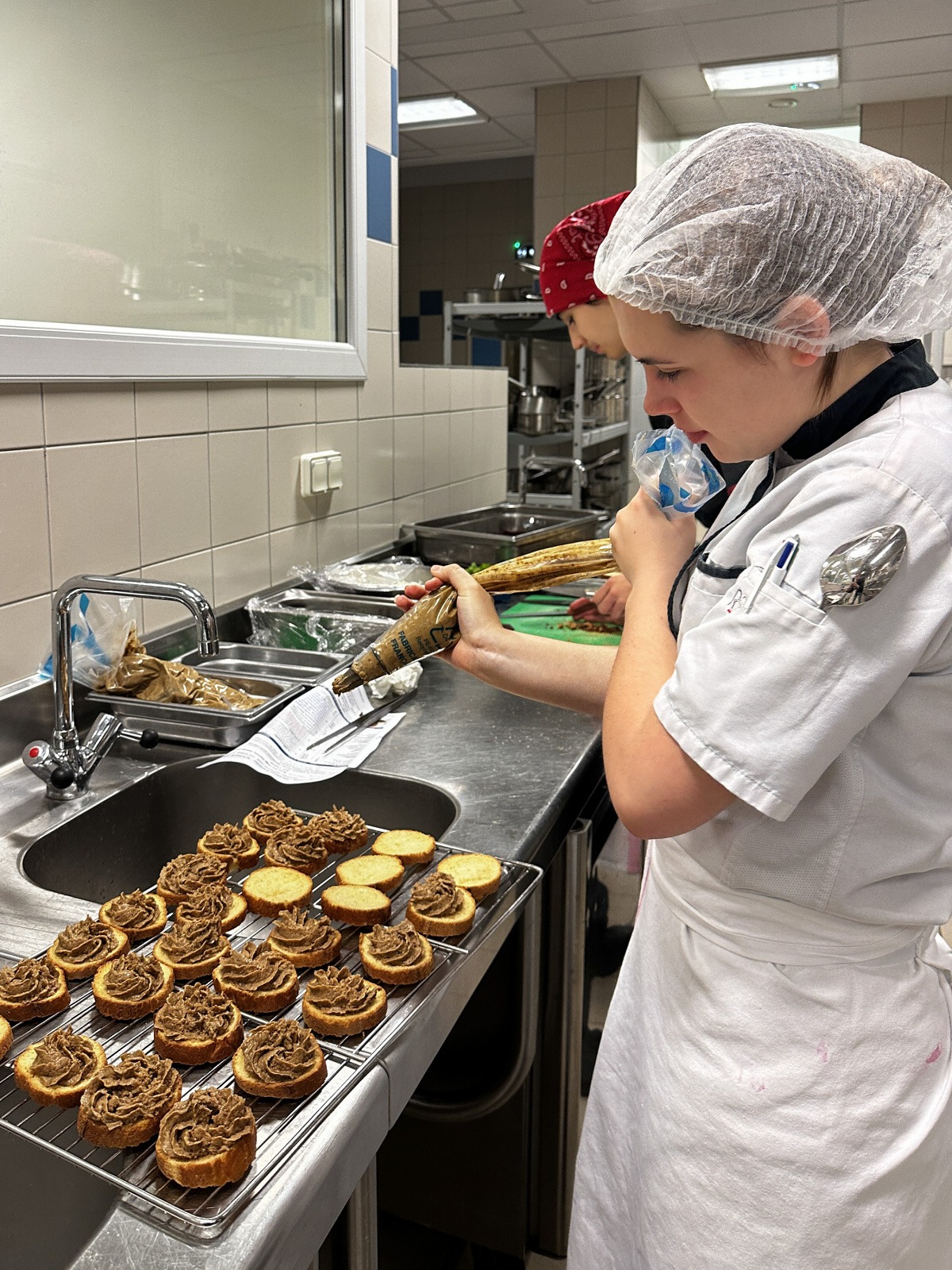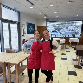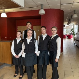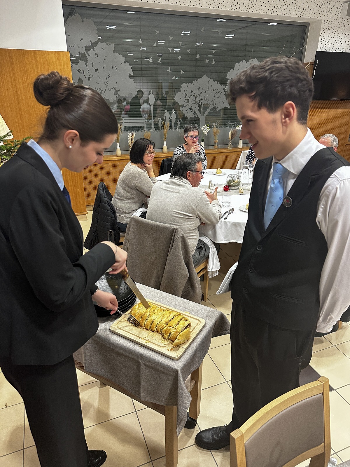 Čtvrteční ráno se naše skupina vydala na místní trhy s cílem podpořit udržitelnou gastronomii. Místní škola totiž nakupuje suroviny od lokálních dodavatelů a následně je využívá při večerním provozu restaurace. Odpoledne se tři z nás zapojili do obsluhy v restauraci a další tři pracovali v kuchyni, kde připravovali české menu. Mohli jsme si tak vyzkoušet práci s moderními technologiemi. Zážitek to určitě nebyl jen pro nás, ale i pro hosty, kteří přišli na večeři ochutnat českou kuchyni. Servírován byl hovězí vývar s játrovými knedlíčky, svíčková s karlovarským knedlíkem a jako dezert nechyběl jablečný závin přelitý vanilkovou omáčkou.