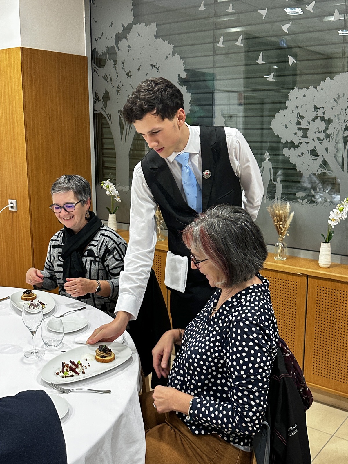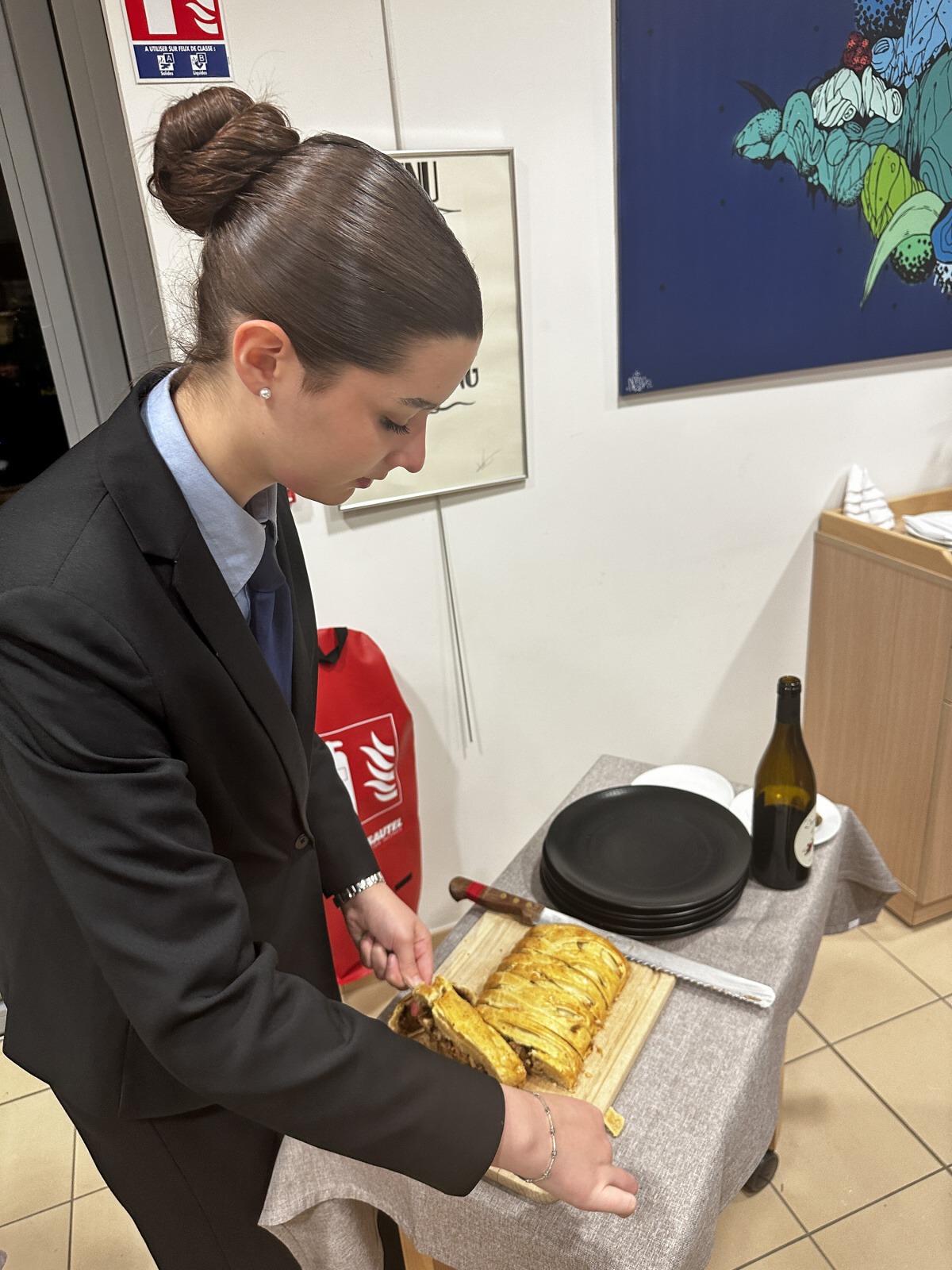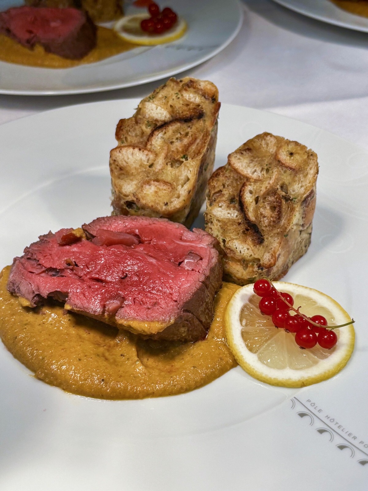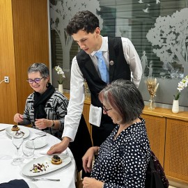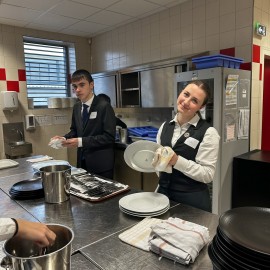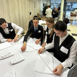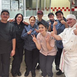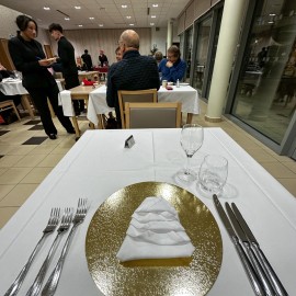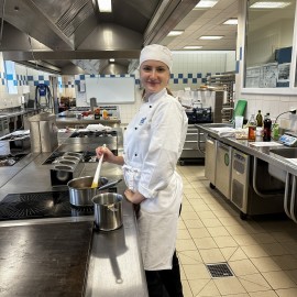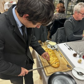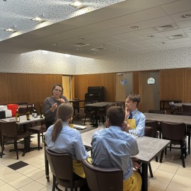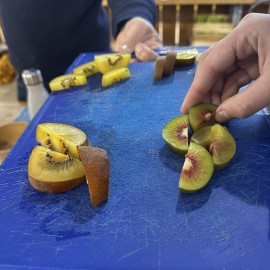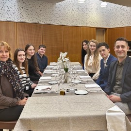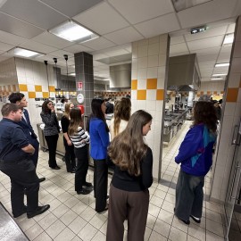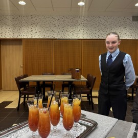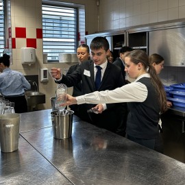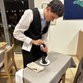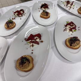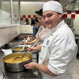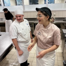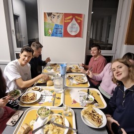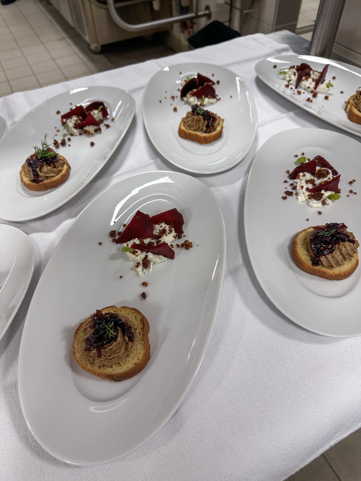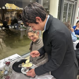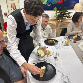 Čtvrteční ráno se naše skupina vydala na místní trhy s cílem podpořit udržitelnou gastronomii. Místní škola totiž nakupuje suroviny od lokálních dodavatelů a následně je využívá při večerním provozu restaurace. Odpoledne se tři z nás zapojili do obsluhy v restauraci a další tři pracovali v kuchyni, kde připravovali české menu. Mohli jsme si tak vyzkoušet práci s moderními technologiemi. Zážitek to určitě nebyl jen pro nás, ale i pro hosty, kteří přišli na večeři ochutnat českou kuchyni. Servírován byl hovězí vývar s játrovými knedlíčky, svíčková s karlovarským knedlíkem a jako dezert nechyběl jablečný závin přelitý vanilkovou omáčkou.