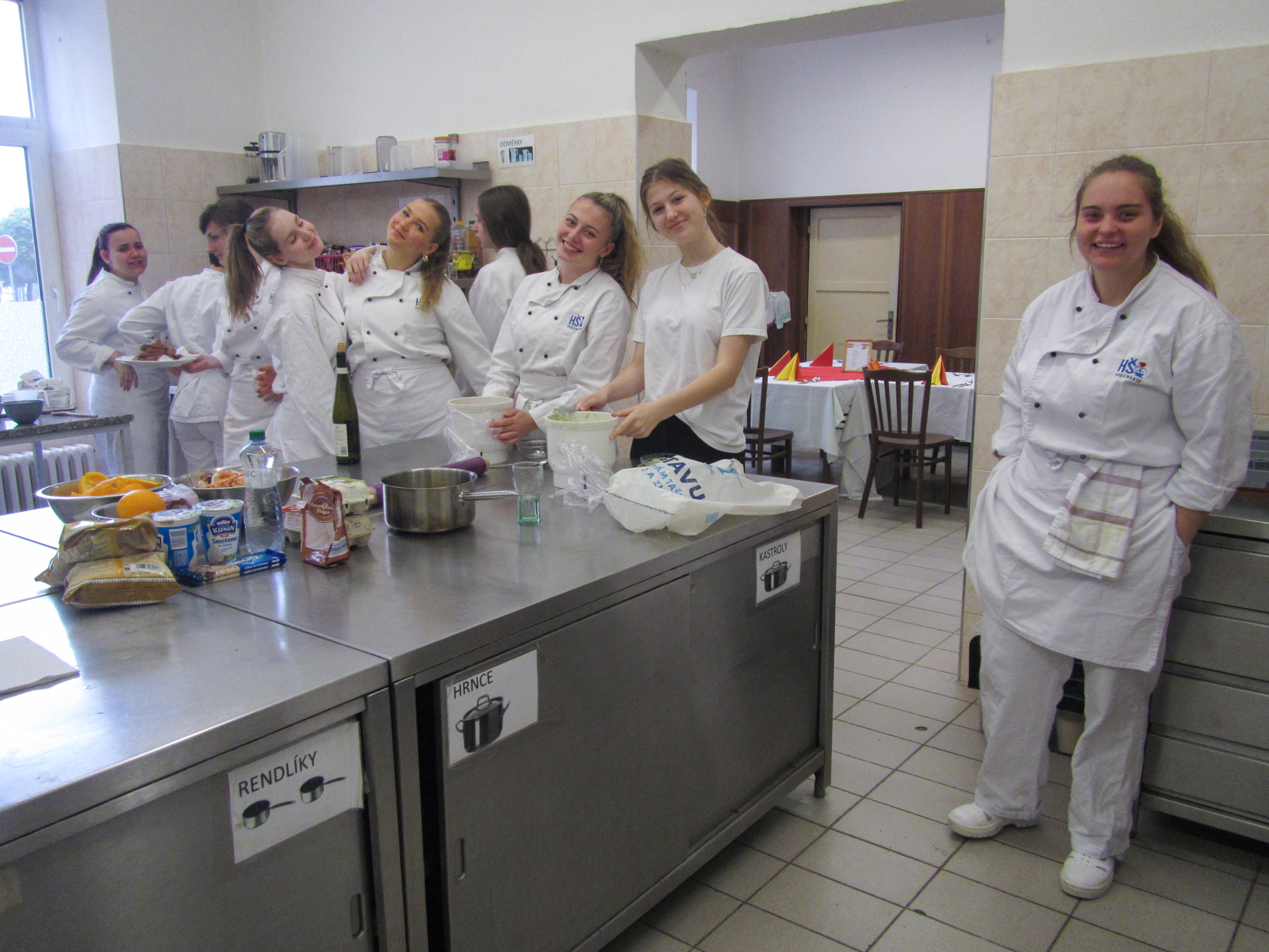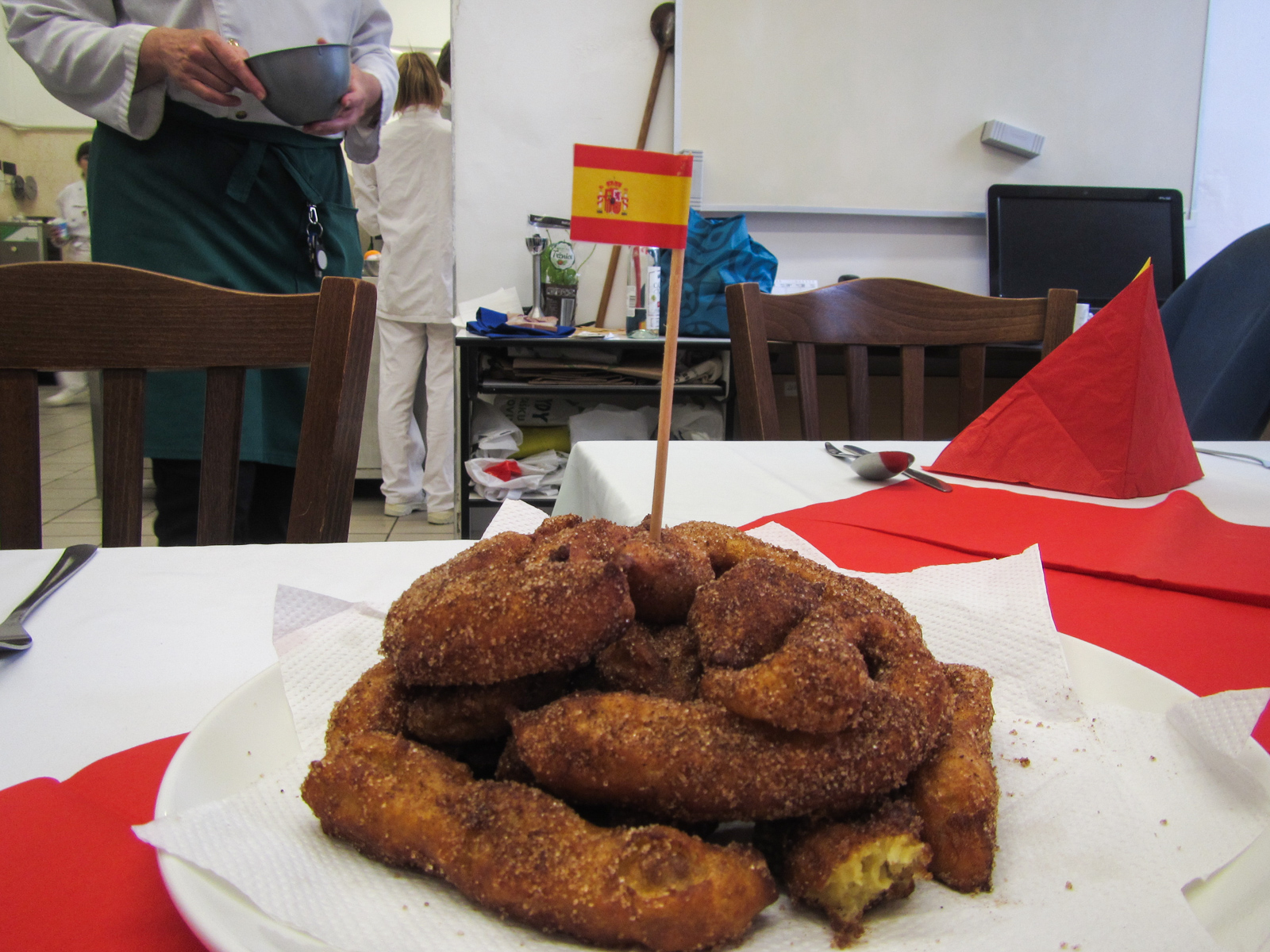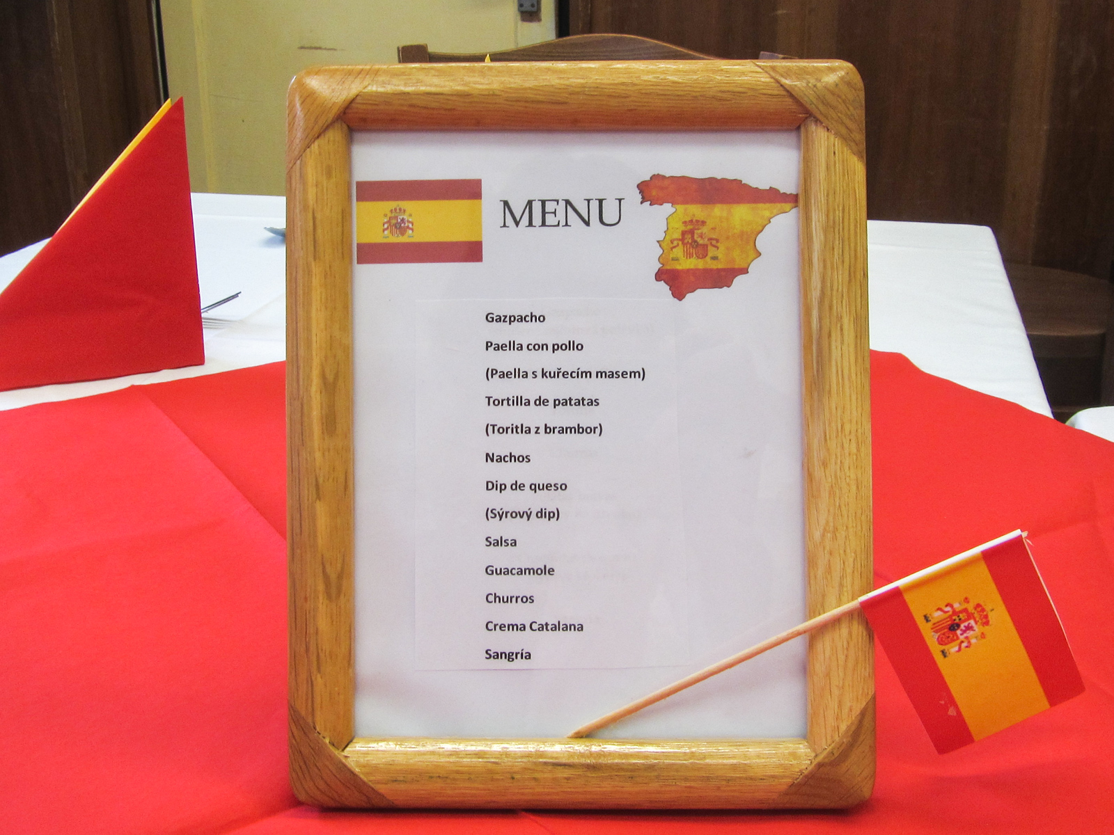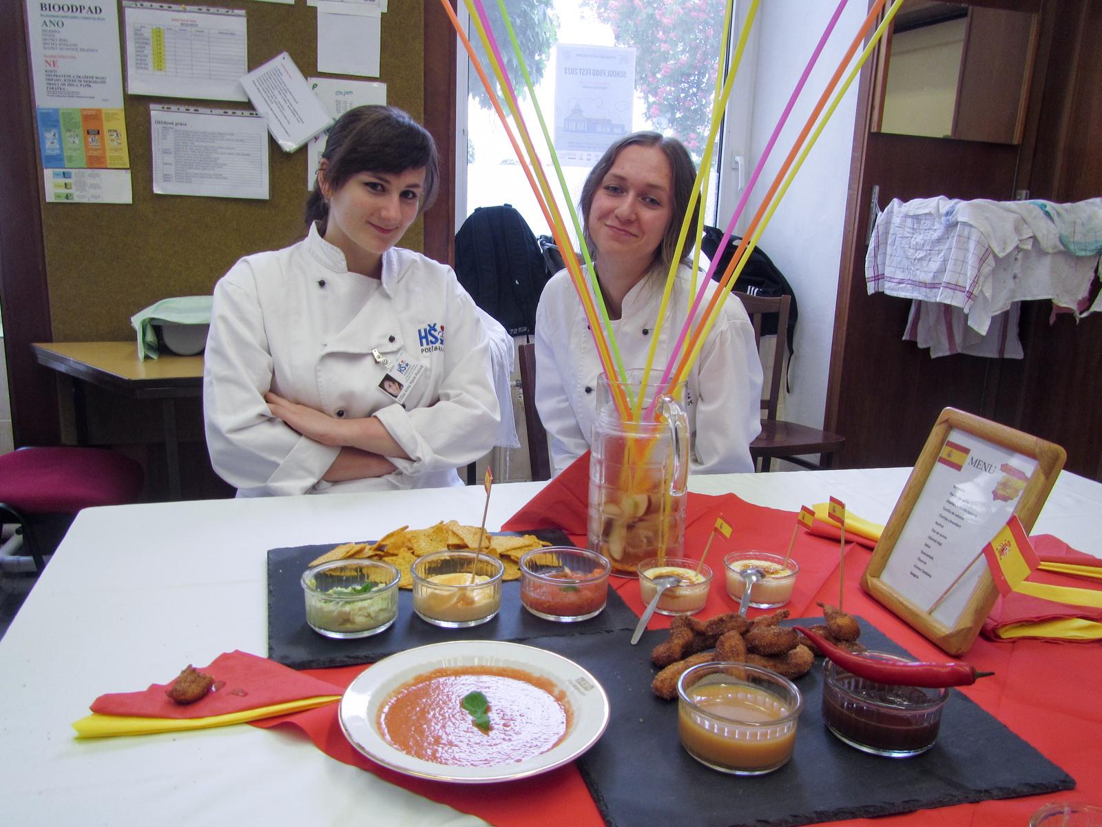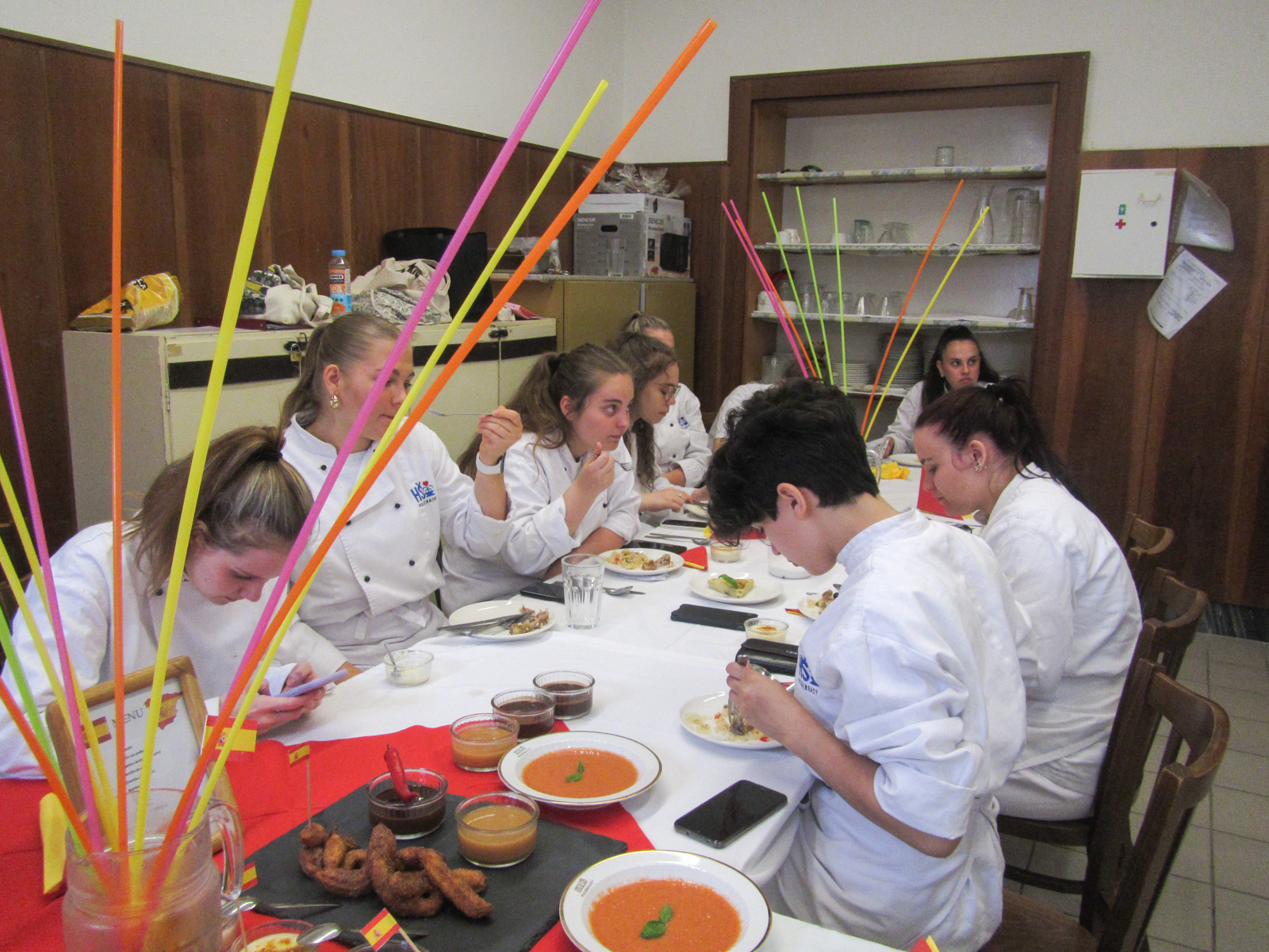 Clase de cocina espaňola – hodina španělského vaření s 2.D se opět nesla v rytmu temperamentní hudby, tance a přípravy typických pokrmů. U stolu nechyběla ani sangría, což akcentovalo jak dobrou náladu, tak rozhovory ve španělštině. Podávalo se gazpacho, paella, tortilla espaňola clásica, z Mexika k nám zabloudily nachos a tři fantastické dipy, flambovala se crema catalana, podávaly churros s karamelem a s naprosto úžasnou salsou z čokolády a chilli.