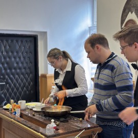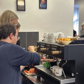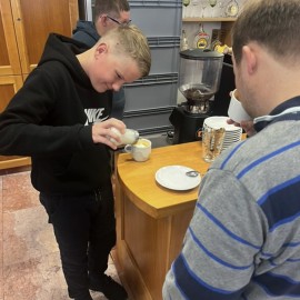 Celý den se nesl ve vůni čerstvě namleté kávy a flambování. Na úvod se děti dozvěděly zajímavosti o původu kávy, o jejích druzích a pražení. Povídání o světě kávy opět vedla zkušená baristka a absolventka baristického kurzu na naší škole. Poté přišla na řadu samotná příprava kávy, nejprve espressa a pak i cappuccina. Samozřejmě nechyběl ani oblíbený latte art.