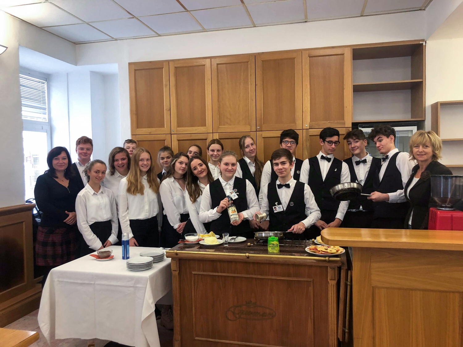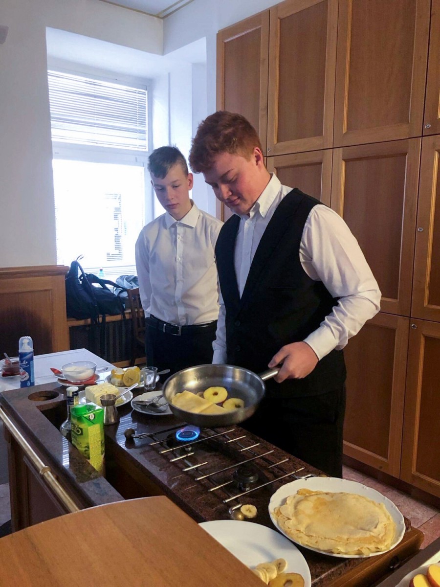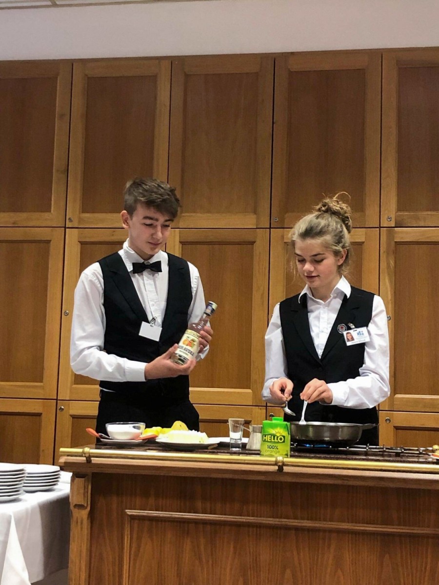 Ve čtvrtek 7. listopadu 2019 jsme se v rámci předmětu technika obsluhy a služeb rozhodli ukázat našim kolegům z Německa způsob přípravy palačinek před hostem flambováním. Flambovali jsme v koktejlu z pomerančové šťávy a meruňkovice.