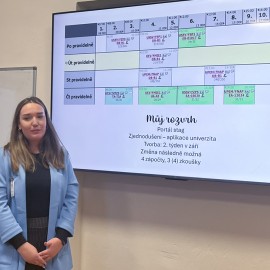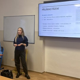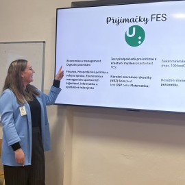 Další pražskou školou byla Univerzita Karlova. Eliška Sýkorová čtvrtým ročníkům představila obor Komunikační studia se specializací Žurnalistika.