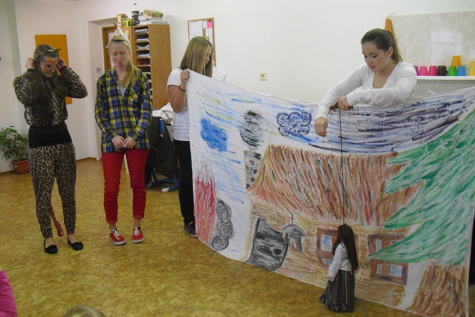 V pátek 10. 10. 2014 jsme po poslední ranní zkoušce vyrazili do Speciální školy v Poděbradech. Čím méně kroků nám zbývalo ke škole, tím více stoupala nervozita. Po uvítání jednou paní učitelkou jsme dostali k dispozici třídu k přípravě naší scény. Za pár minut jsme byli připraveni. Děti už seděly na svých místech a my začali prvním dějstvím. Děti tleskaly, smály se, obdivovaly loutky a poznávaly zvířátka. I přes občasnou improvizaci a pár přeřeknutí jsme to zvládli a děti nás odměnily velkým potleskem. Bylo hezké vidět, jakou radost dětem udělalo naše malé divadlo.