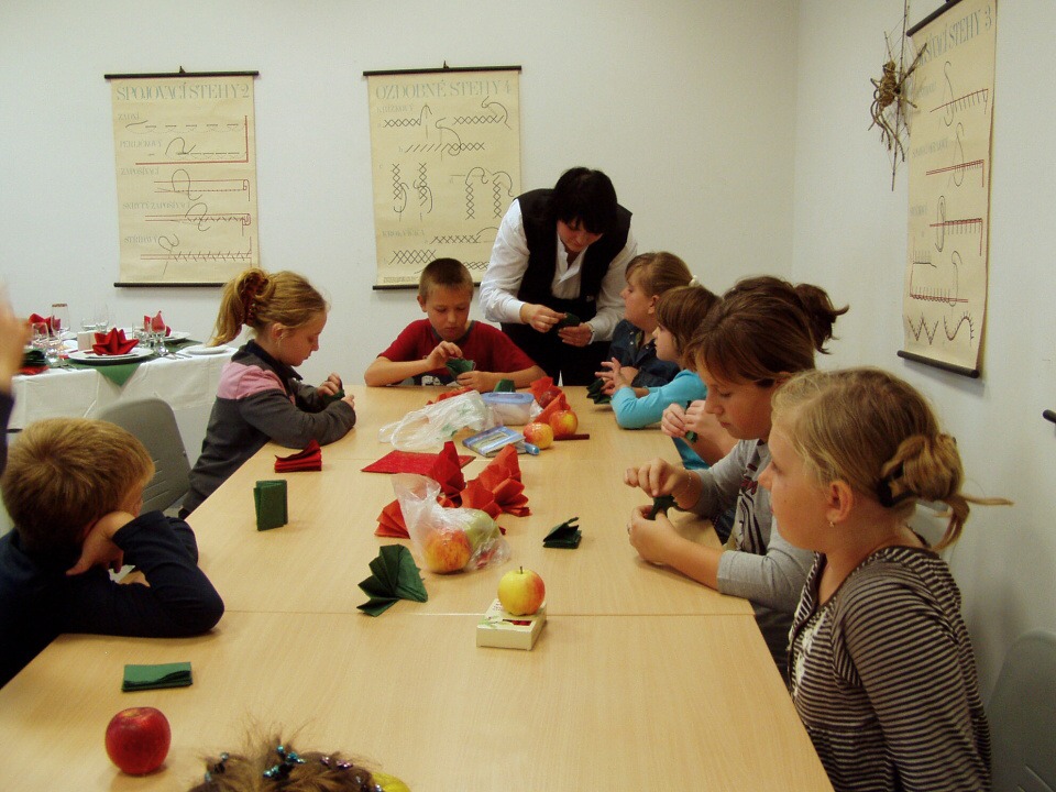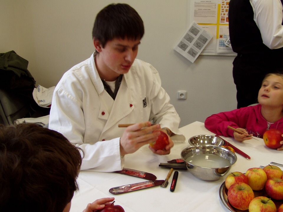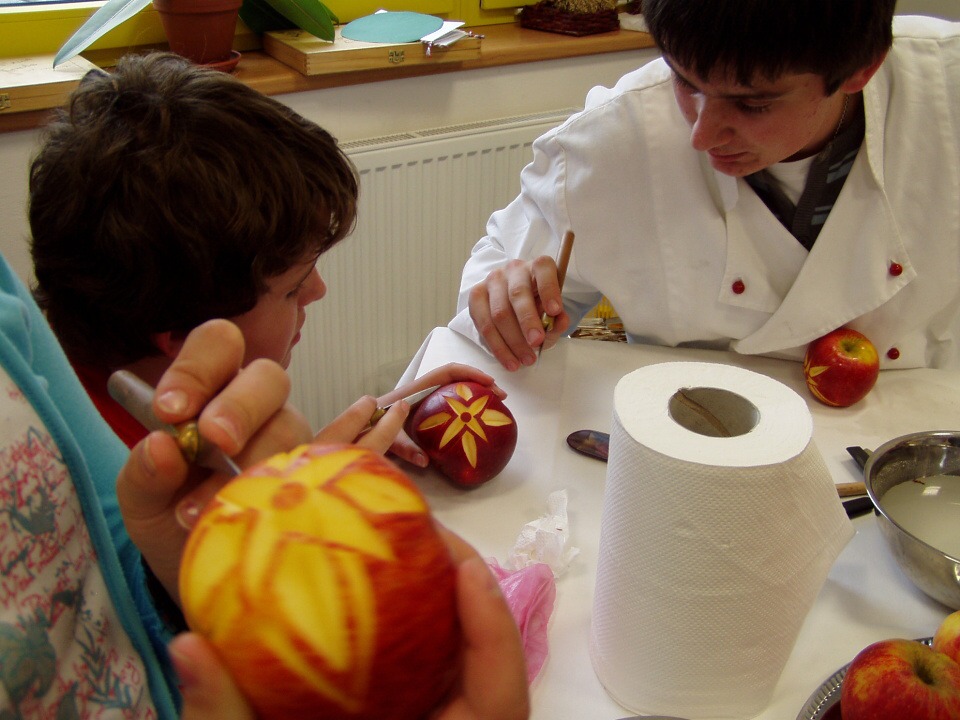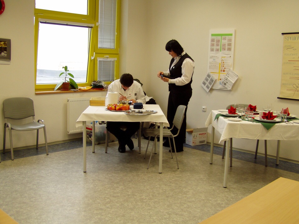 Základní škola Kopidlno požádala naši školu, aby dva studenti předvedli žákům v kroužku vaření ukázku dovedností techniky obsluhy. Dne 3. 11. 2010 pro mě a Jana Krčmaříka přijel zástupce školy, který nás odvezl do Kopidlna. Byla jsem mile překvapena moderním vybavením cvičné kuchyně, která sousedí s jídelnou. Tam jsme se také sešli. Než děti přišly, prostřela jsem tabuli laděnou do vánoční atmosféry, aby měly inspiraci pro svůj Štědrý večer. Této prezentace se zúčastnilo patnáct dětí. Ty jsme rozdělili do dvou skupin. Honza s pěti nadšenci vyřezal jablíčka, do kterých zapíchl svíčku a dozdobil smrkovými větvičkami. Domů si tak děti odnesly překrásný vlastnoručně vyrobený svícínek. Já jsem zbylým deseti „kuchařským elévům“ na prostřené tabuli ukázala základy stolování a také, pro zpestření, nějaký speciální inventář jako je rybí příbor, kleště na raky, překládací příbory, sklenky na nápoje a další. Potom jsem je naučila skládat do různých tvarů papírové ubrousky , které si mohli taktéž odnést. Poté se různě prostřídali, aby si každý vyzkoušel všechno a zároveň se nikdo nenudil. Děti odcházely nadšené a už plánovaly, jak všechno na Vánoce připraví.
