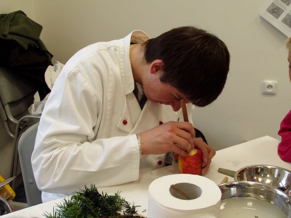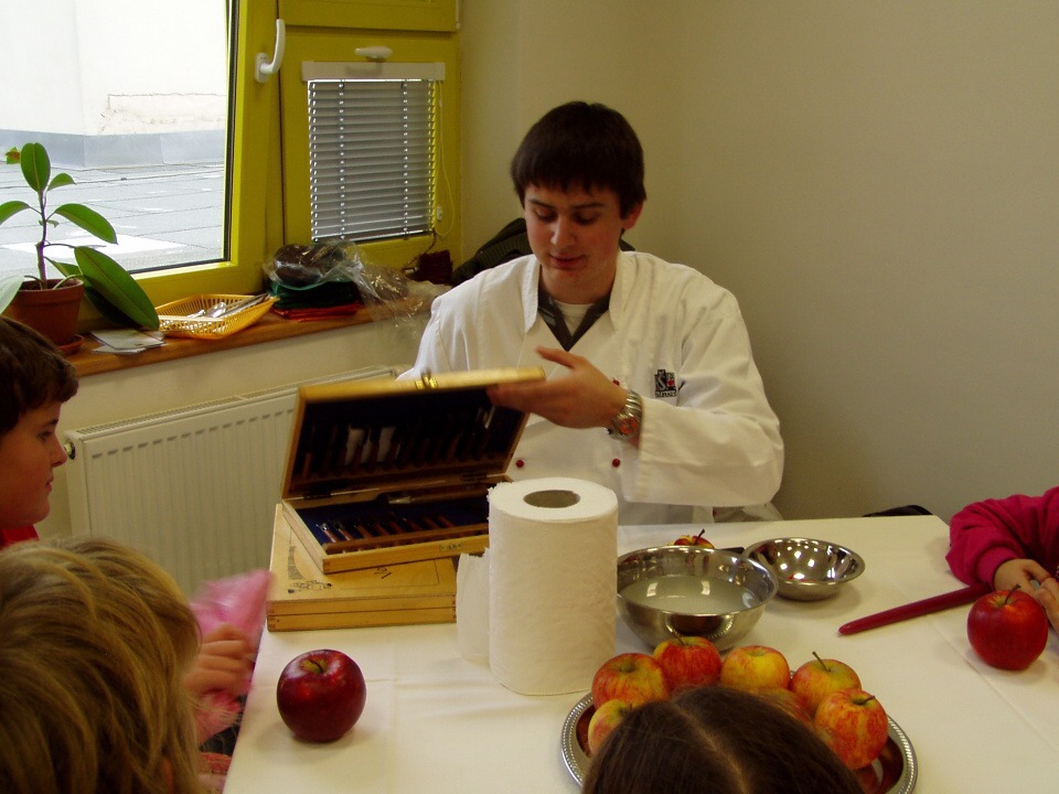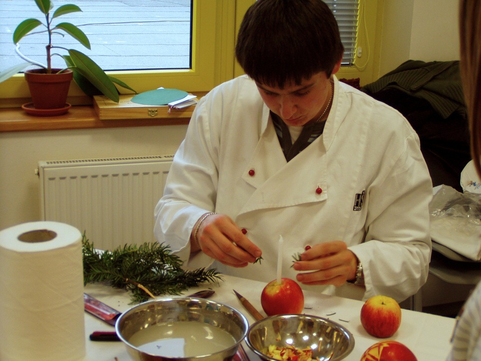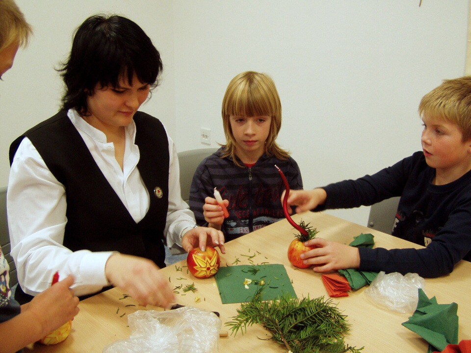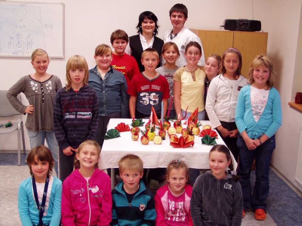 Základní škola Kopidlno požádala naši školu, aby dva studenti předvedli žákům v kroužku vaření ukázku dovedností techniky obsluhy. Dne 3. 11. 2010 pro mě a Jana Krčmaříka přijel zástupce školy, který nás odvezl do Kopidlna. Byla jsem mile překvapena moderním vybavením cvičné kuchyně, která sousedí s jídelnou. Tam jsme se také sešli. Než děti přišly, prostřela jsem tabuli laděnou do vánoční atmosféry, aby měly inspiraci pro svůj Štědrý večer. Této prezentace se zúčastnilo patnáct dětí. Ty jsme rozdělili do dvou skupin. Honza s pěti nadšenci vyřezal jablíčka, do kterých zapíchl svíčku a dozdobil smrkovými větvičkami. Domů si tak děti odnesly překrásný vlastnoručně vyrobený svícínek. Já jsem zbylým deseti „kuchařským elévům“ na prostřené tabuli ukázala základy stolování a také, pro zpestření, nějaký speciální inventář jako je rybí příbor, kleště na raky, překládací příbory, sklenky na nápoje a další. Potom jsem je naučila skládat do různých tvarů papírové ubrousky , které si mohli taktéž odnést. Poté se různě prostřídali, aby si každý vyzkoušel všechno a zároveň se nikdo nenudil. Děti odcházely nadšené a už plánovaly, jak všechno na Vánoce připraví.