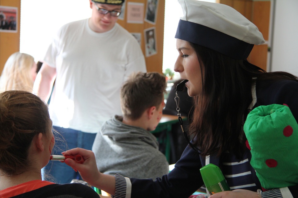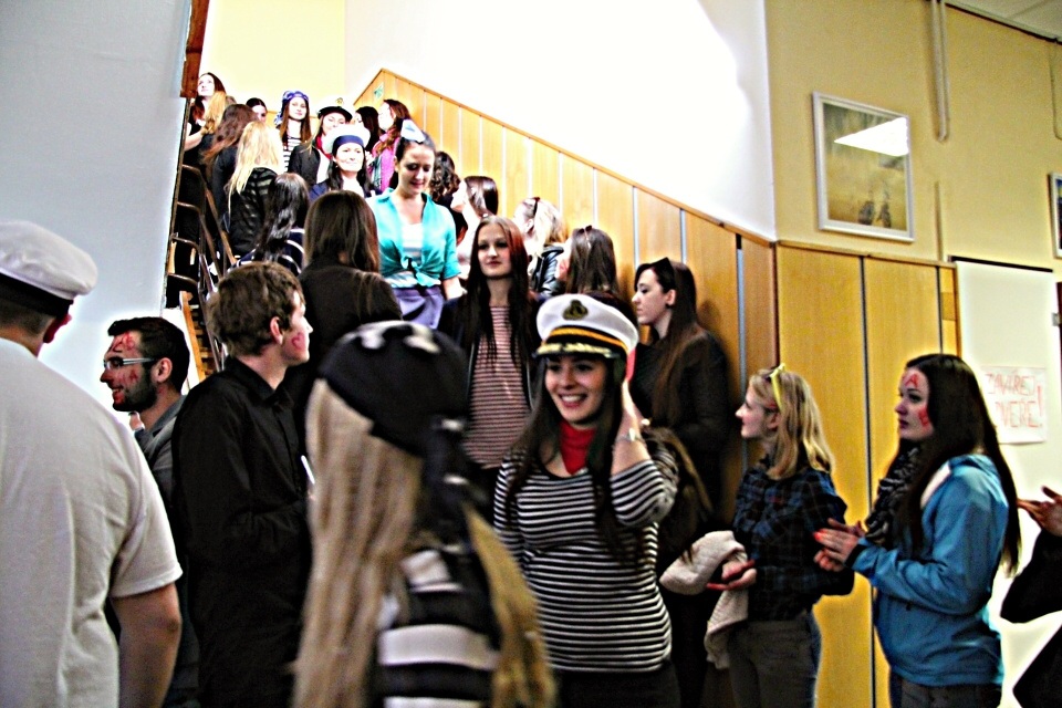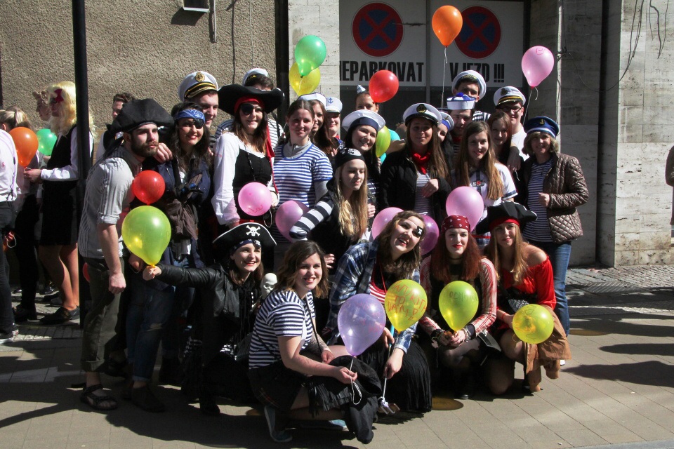 Celá škola se shromáždila před školou a mohly začít studentské oslavy, a to poděbradský Majáles, pořádaný studenty naší školy.