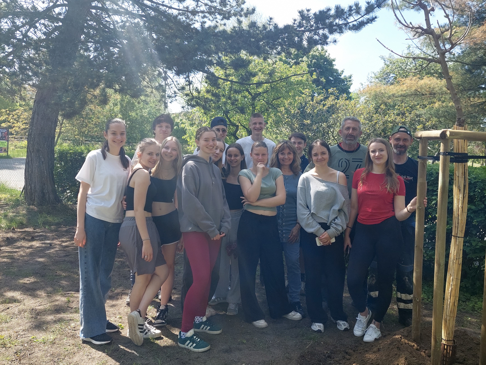 Učebnice jsme tentokrát vyměnili za lopaty a pustili se do práce. Každý z nás měl možnost přiložit ruku k dílu – od vykopání jámy, přes samotné zasazení stromu, až po přidání dřevěných tyčí, které nyní slouží jako opora. Překvapilo nás, jak fyzicky náročné sázení stromu může být, ale zvládli jsme to s chutí a úsměvem.