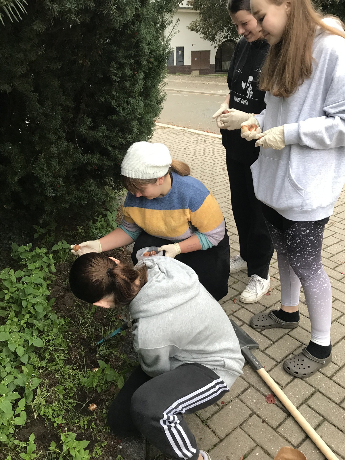 V úterý 18. 10. 2022 jsme v rámci projektu 72 hodin vysázeli s paní učitelkou Valentovou cibulky tulipánů. K „základu“ našeho stálého sázecího týmu se ale přidaly i žákyně prvního ročníku, a tak se nás nakonec sešlo kolem deseti.