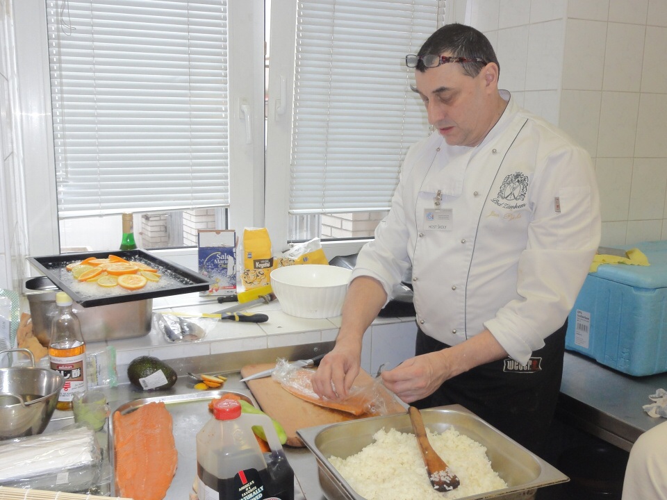 Třetí den byl pro nás všechny vrcholem gastronomického zážitku. Čekala nás příprava asijské kuchyně a mořských plodů. Po příchodu do kuchyně nás hned přivítali živí humři, krevety, olihně a další mořské potvůrky. Vyzkoušeli jsme si, jak se správně otvírá ústřice. Kdo chtěl, mohl i ochutnat. Čistili jsme a kuchali ryby, připravovali krevety á la tempura, dim sum s mletým masem, špízy yakitory, Barma-křupané olihně, pečenou rybu dorádu s fenyklovou krustou a jarní závitky z kuřecího masa. Všechno jídlo bylo vynikající.