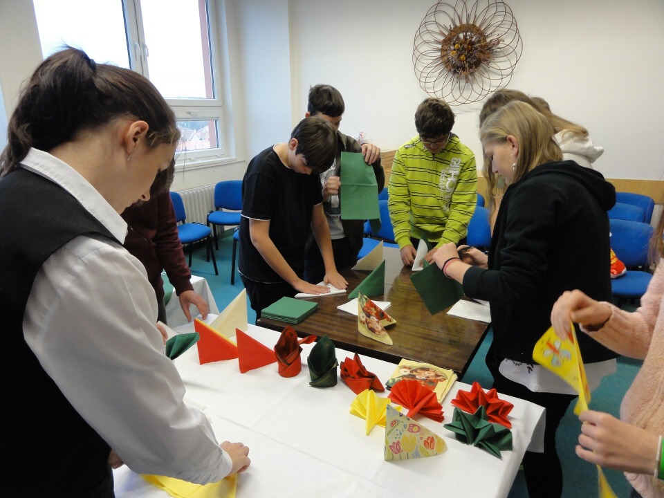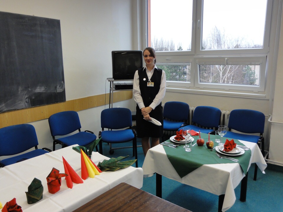 Dne 6. prosince 2013 jsme navštívily místní základní školu, abychom i zde žákům 8. tříd předvedly zajímavé činnosti, kterým se mohou na naší škole naučit. V předvánočním čase jsme si vybraly ukázku vánočně laděného stolu, příborů vhodných ke konzumaci jednotlivých štědrovečerních jídel a přípravu tematické dekorace. Den byl pro nás velmi náročný, protože jsme prováděly ukázky postupně pro 2 třídy vždy po 2 hodinách. Žáci byli pozorní, přesto bylo zapotřebí našeho plného soustředění na práci, a v této situaci jsme si uvědomily, jak náročná je práce učitele.