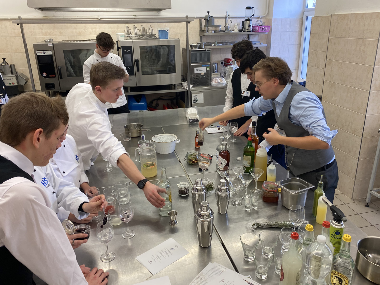 Ve středu 29. 11. 2023 se u nás ve škole uskutečnil workshop od hotelu Chateau Mcely. Žáci se mohli podívat na přípravu a servis tříchodového menu, ale také zkusit namíchat tři drinky z nealkoholického ginu, vodky a rumu. Celá akce přitom byla komentována šéfkuchařem Janem Štěrbou, sous chefem Jakubem Motákem a F&B managerem Michalem Hrčkulákem. Žáci se tedy při této příležitosti podívali pod čepec jedné z nejlepších restaurací v České republice.