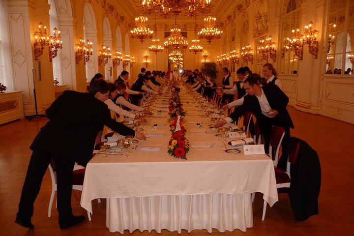 Ihned po příjezdu jsme se s chutí pustily do přípravných prací. Odměnou za to nám byla výborná večeře. Po krátkém zkoušení nástupů jsme byli připraveni na příchod prezidentských párů. Po projevech obou prezidentů a poslechnutí hymny České a Portugalské republiky byla zahájena obsluha, která probíhala bezproblémově. Dovolím si říct, že byla jednodušší než náš banket.
