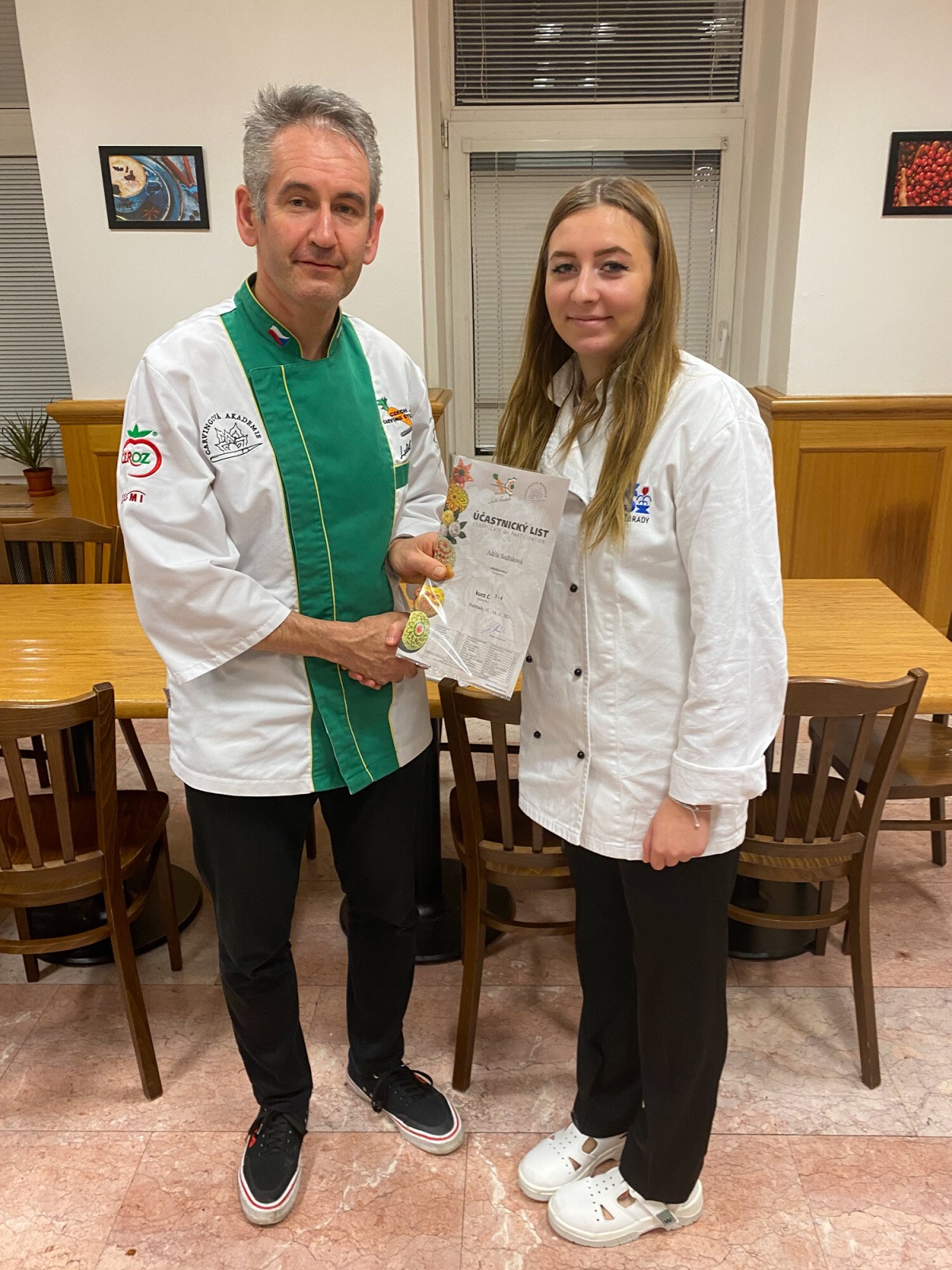 Na konci kurzu jsme soutěžili o to, kdo vyřeže za 45 minut nejhezčí jablko, vyfotili jsme se s našimi výrobky a obdrželi jsme certifikáty z kurzu.