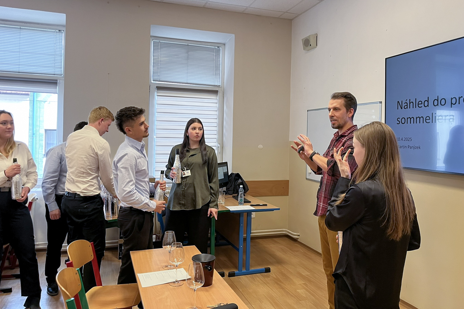 Dne 10. 4. 2025 se u nás ve škole uskutečnila přednáška o sommeliérství pro budoucí hotelové manažery, tedy studenty se specializací Hotel Management.