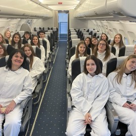 Nejprve jsme navštívili Czech Aviation Training Centre, které patří mezi unikátní výcviková centra v Evropě. Přijíždí sem piloti, letušky a stevardi z celého světa, aby absolvovali odborný výcvik a pravidelné přezkoušení. Dozvěděli jsme se mnoho informací o přípravě leteckých posádek, bezpečnostních postupech i řešení krizových situací. Součástí programu byla také praktická ukázka evakuace z letadla, při které jsme si vyzkoušeli skluz po nafukovací evakuační skluzavce.