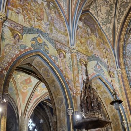 Obdivovali jsme krásný výhled na významné pražské památky – Kongresové centrum, Nuselský most, Žižkovskou věž, porodnici a kostel u sv. Apolináře, Pražský hrad, Petřín i kostel Zvěstování Panny Marie Na Trávníčku. Nejdůležitější zastávkou na Vyšehradě byl však Vyšehradský hřbitov se Slavínem, kde jsou pochovány nejvýznamnější osobnosti českého národa. Závěr vyšehradské části exkurze patřil chrámu sv. Petra a Pavla, který nás okouzlil nádhernými malbami, vitrážemi a nezaměnitelnou atmosférou.
