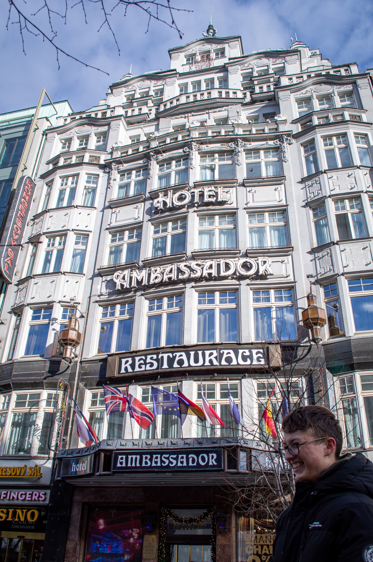 Od Obecního domu jsme se přesunuli k hotelu Paříž, kde jsme mohli na sebe prvorepublikovou atmosféru nechat přímo dýchnout, šli jsme se totiž podívat přímo dovnitř hotelu. Hned vedle se nacházel hotel Grand Bohemia, ze kterého je nyní luxusní pětihvězdičkový hotel. Poté následovala krátká pauza na kávu a kubistický věneček v domě U Černé Madony. Další klasicistní stavbou na trase bylo Stavovské divadlo, vedle kterého se nachází Karolinum.