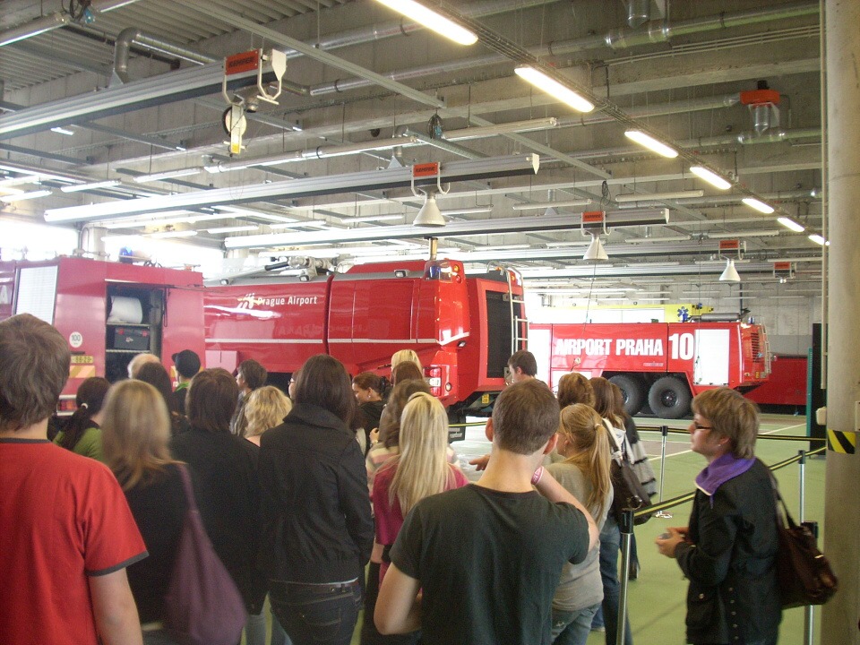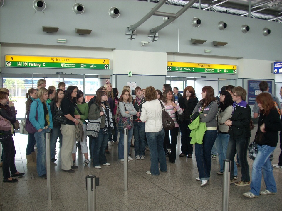 Dne 11. května jsme se třídy 3.B a 3.C vydali pod dozorem paních učitelek Drobné a Valentové na odbornou exkurzi pražského letiště Ruzyně. Prohlídku Terminálu 3 jsme začali úderem desáté hodiny ranní, pod vedením „leteckého profesora“ Kamila Břemka. Tento sympatický pán, nás provedl celou Ruzyní, rozpovídal se o svých zážitcích ze svého mládí, kde všude létal, v kolika letech poprvé usedl za kokpit letadla. Museli jsme pro kontrolu projít bezpečnostním rámem, abychom neměli u sebe předměty, které nejsou v souladu s bezpečnostními předpisy letiště, a také nás seznámil s letištní hasičskou zbrojnici. Požádali jsme hasiče, jestli by nám mohli ukázat sjezd po tyči. Od hasičů jsme odcházeli spokojení, protože nám toto přání splnili. Následující okamžiky jsme strávili příjemnou projížďkou autobusem po dráze. Pan Kamil Břemek nám přesně řekl, jaké letadlo právě přilétá, kolem kterého momentálně projíždíme. Bylo na něm vidět, že má hodně zkušeností, co se týče létání. Loučil se s námi se slovy, že jestli bude mít někdo zájem o místo pilota, může si udělat kurz na motorová letadla, který stojí 60.000 Kč a částka za kurz na dopravní letadlo s částkou 1.500.000 Kč, ovšem bez nároku na vrácení peněz při nesplnění zkoušek. Následující minuty jsme absolvovali pod vedením paní učitelky Drobné, které nás postupně provedla celým letištěm. Nemohli jsme uvěřit, že celková trasa od terminálu 1 do terminálu 2 činí tři kilometry. Proto děkujeme paní učitelce Drobné, že nám umožnila tuto exkurzi, že jsme měli možnost poznat zákoutí letiště, kam se jen tak obyčejný člověk nedostane.