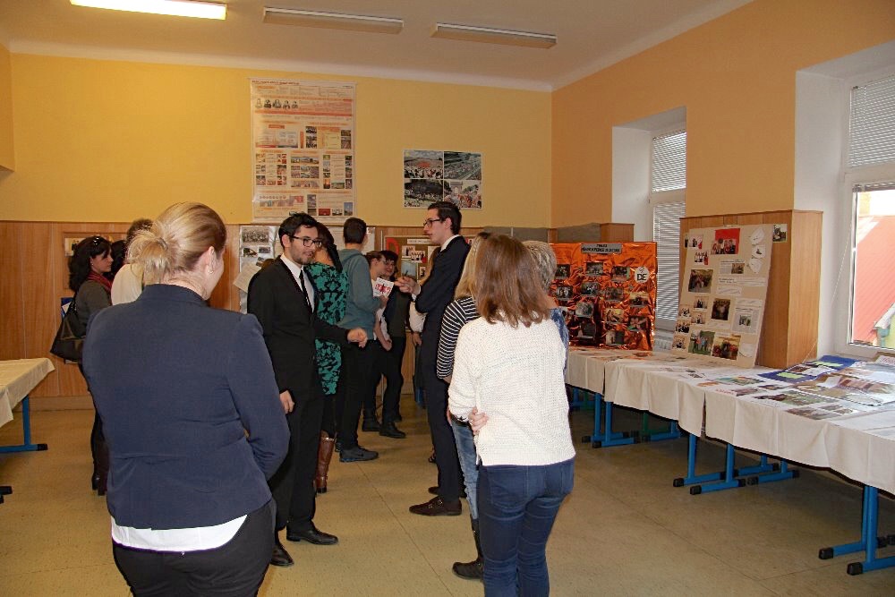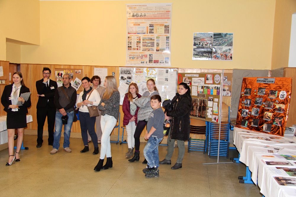 V průběhu prohlídky zavítali také do učebny věnované dobrovolnické činnosti ve druhém patře. Naše škola je zapojena do mezinárodního programu pro mládež už od roku 2002. O tomto programu, nyní zvaného DofE, vykládaly absolventky Zuzana Víznerová a Michaela Tobiášová. O informace byl velký zájem, a tak jsme končili až v půl šesté po odchodu poslední skupinky. Všichni si užili příjemné odpoledne, které bylo možno ještě osladit výbornými zákusky a flambovanými jablíčky podávanými ve školní jídelně.