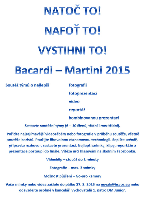 Vaše snímky nebo videa zašlete do pátku 27. 3. 2015 na novak@hsvos.eu nebo odevzdejte osobně v kanceláři vychovatelů 1. patro DM Junior.