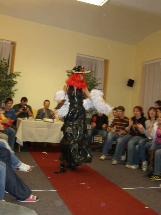 Poté přišla na řadu porota, skládající se z pana Nováka, pana Bártla a pana Pospíšila, kteří tyto modely hodnotili. Chvilka napětí při čekání na výsledky proběhla za hudby a tance našich vychovatelek a po sečtení hlasů jsme vyslechli pořadí. Na pátém místě se umístila paní Vrbenská s modelem Havajská Karkulka, na čtvrtém místě paní Znamínková s modelem PET Lady, na první medailové pozici se umístila paní Koláčná s modelem Černý hurikán, na druhém místě se umístila paní Šimáková s modelem Rudá Sonja a jako první byla oceněna paní Dohnalová s modelem Letní bouře. Všechny vychovatelky a také porotci dostali jako odměnu krásné dorty, které dívky pekly a zdobily samy.