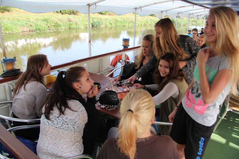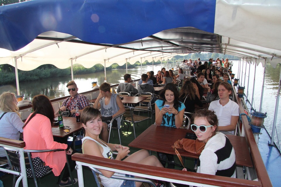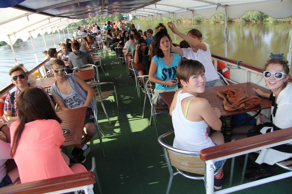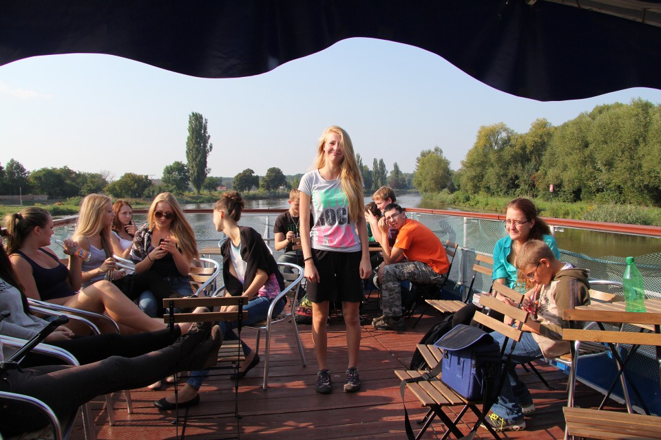 Od školy vyrazilo 51 studentů z prvních ročníků, kteří jsou ubytovaní na DM, směrem k Labi. Loď plná studentů odrazila od břehu v 16 hodin směrem k Nymburku. Studenti mohli využít místního občerstvení. Během plavby mohli studenti sledovat ráz místní krajiny a zároveň se zapojit do soutěží, které umožnili studentům se vzájemně poznávat. Dnes nám počasí, oproti předchozím dnům, skutečně přálo, bylo krásné slunečné odpoledne... tak taky začíná příběh, který zde na lodi vznikl a najdete ho na nástěnce DM. Absolutní vítězkou se stala Adélka Salačová, Tereza Hartmanová a Alenka Sitařová na druhém a třetím místě. Jednou z cen byla možnost vyzkoušet si řídit loď a pizza vlastního výběru.