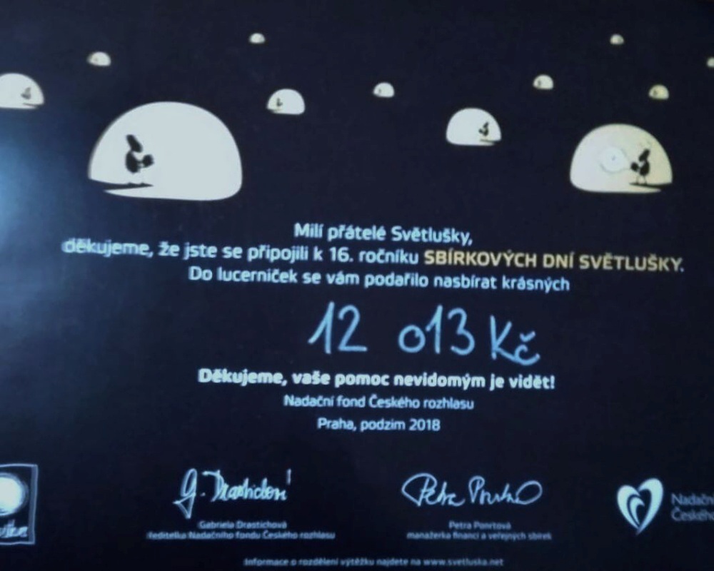 I letos se naše škola prostřednictvím Domova mládeže HŠ zapojila do sbírky pro Světlušku. Světluška je nadační fond Českého rozhlasu, který pomáhá nevidomým dětem, ale i dospělým. Sbírka probíhala od 10. září do 14. září a právě v těchto dnech jste mohli naše studenty potkávat v ulicích Poděbrad s kasičkami. Všichni se velmi snažili vybrat co nejvíce peněz pro dobrou věc. A to se jim také podařilo. Vybralo se skvělých 12 013 Kč.