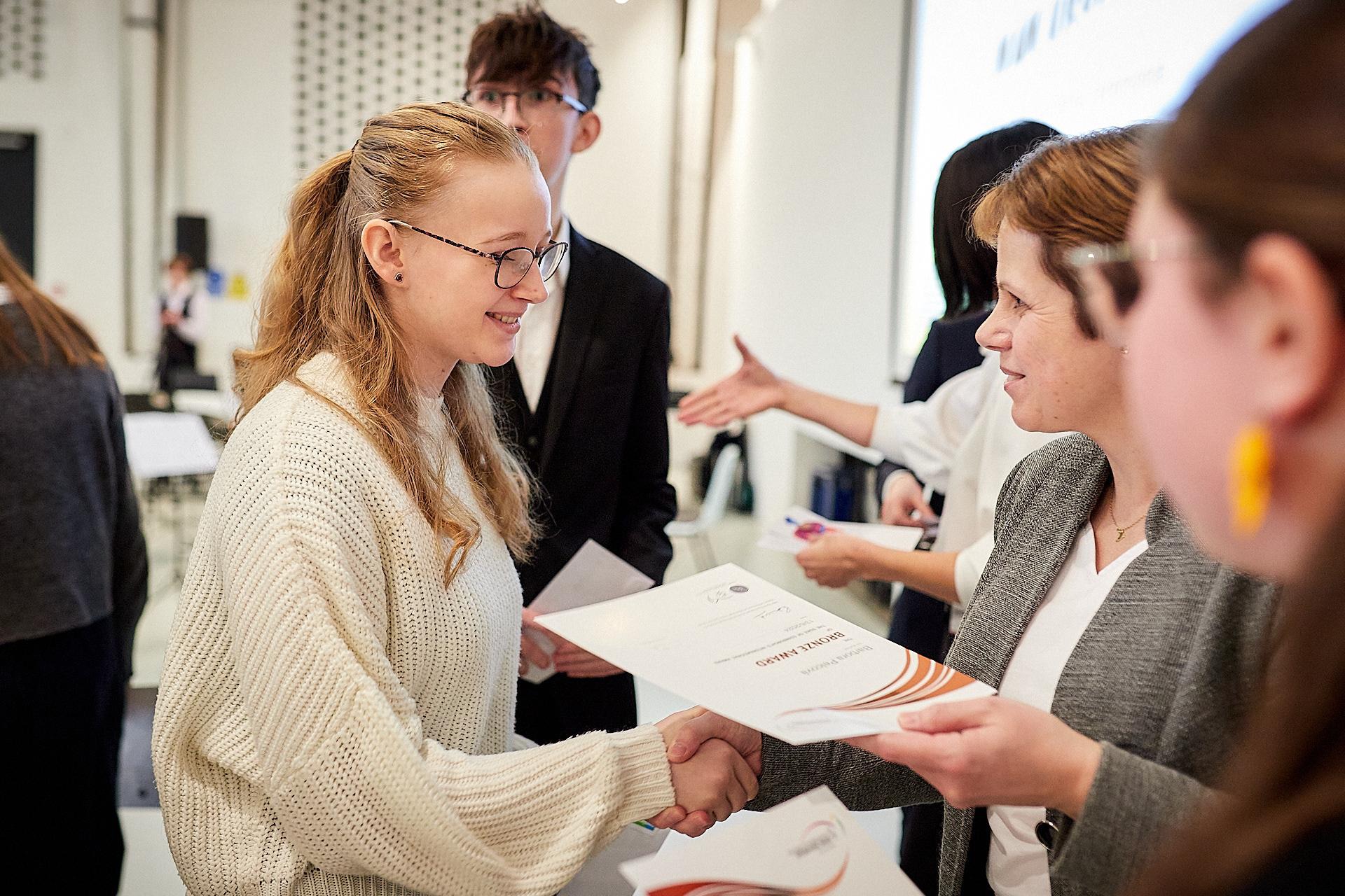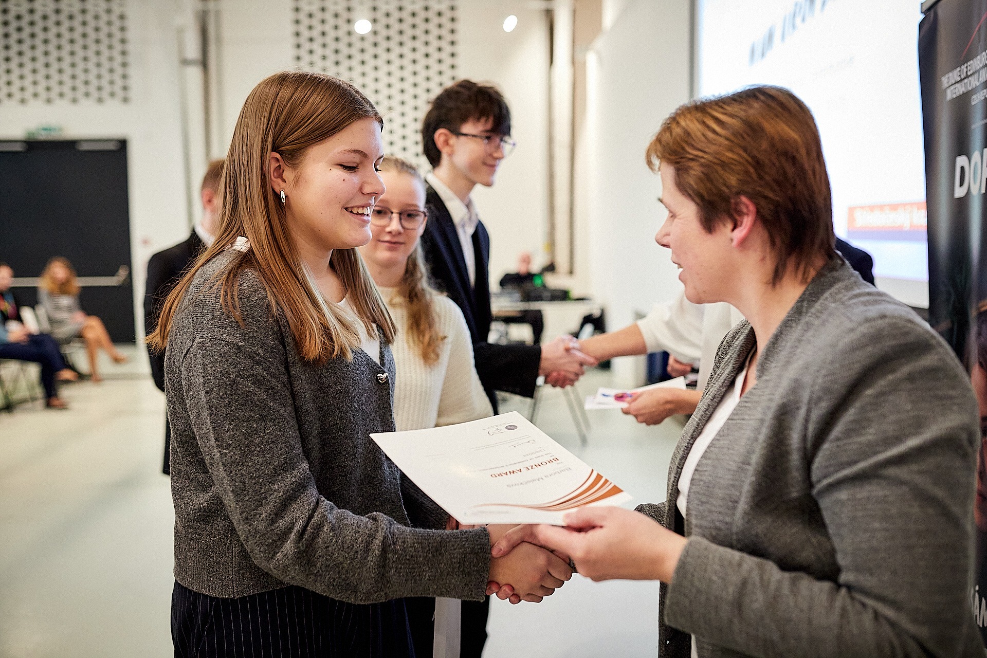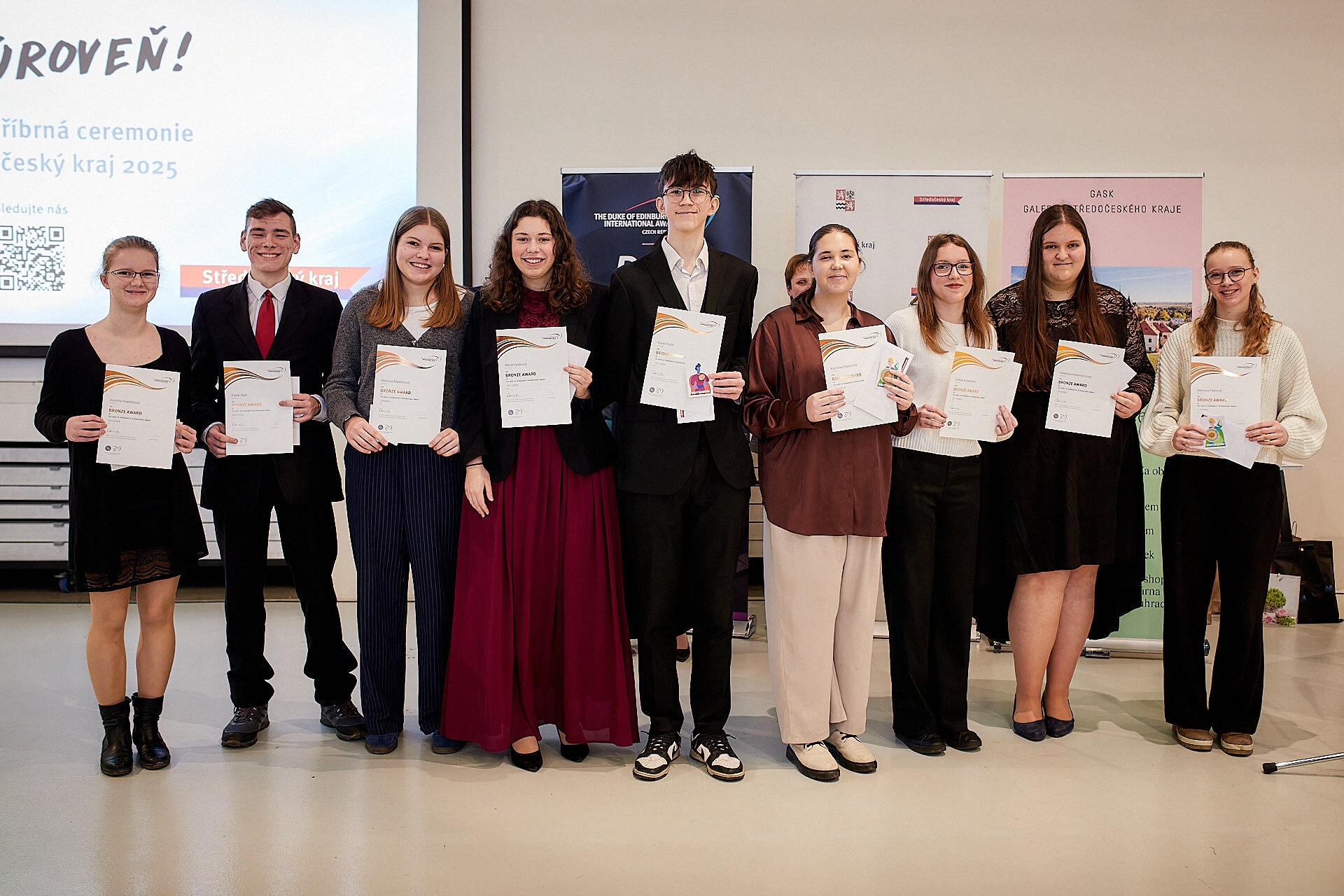 V pátek 24. ledna 2025 se v nádherných prostorách Galerie Středočeského kraje (GASK) v Kutné Hoře konala slavnostní bronzovo-stříbrná ceremonie DofE (Mezinárodní cena vévody z Edinburghu). Oceněných studentů z naší školy bylo celkem 15, 2 za stříbrnou úroveň a 13 za bronzovou. Slavnostního předávání diplomů se ale zúčastnilo pouze 10 oceněných, ostatní buď plní svoji praxi v zahraničí, nebo se nemohli dostavit z osobních důvodů. Celkově za celý Středočeský kraj si přišlo pro diplom 194 mladých lidí.