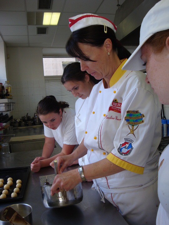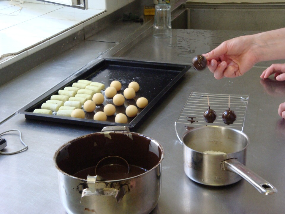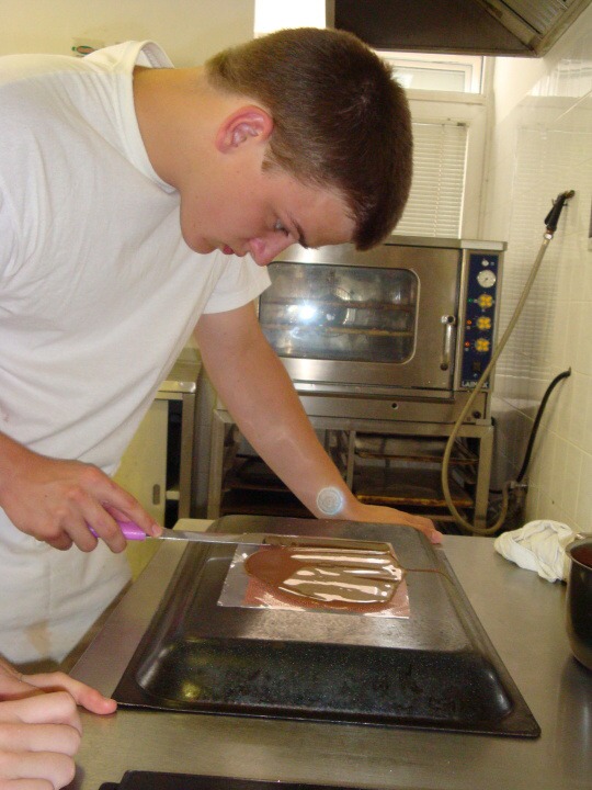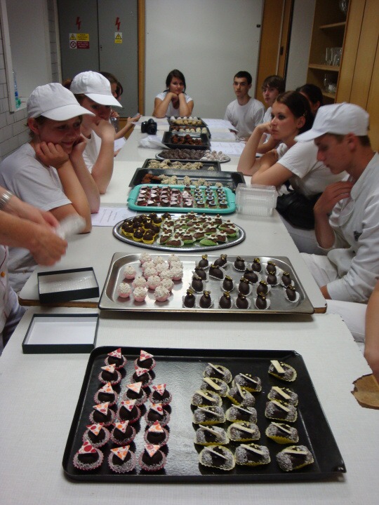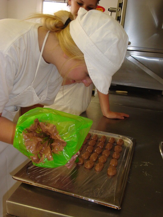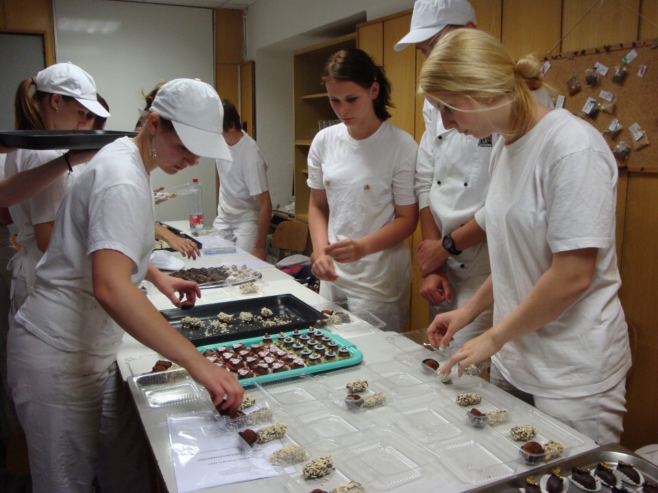 Druhá část projektu se ubírala čistě výrobně-konzumním směrem… Pod dohledem pravé odbornice ve svém oboru paní mistryně cukrářky Pavlíny Berzsiové jsme se učili tvořit čokoládové bonbónky. Vyráběli jsme pralinky všech tvarů a chutí. O většině z nich se nám do té doby mohlo jen zdát… a i když jsme byli fyzicky plně přítomni, někdo se mohl cítit jako ve snu :-)
