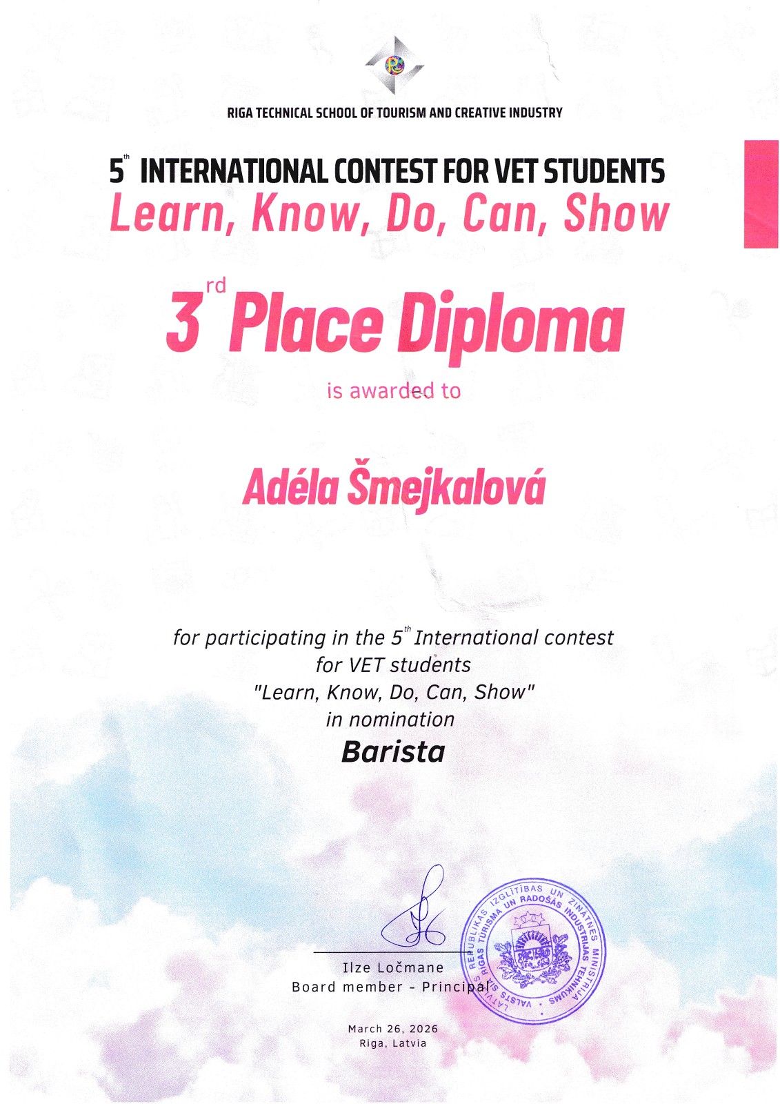 Na soutěži jsme dosáhli krásných výsledků. V kategorii restaurant service jsme se umístili na 5. místě, v baristice jsme vybojovali skvělé 3. místo a v barmanství jsme byli mezi první desítkou soutěžících. Tyto úspěchy pro nás znamenají velkou motivaci do další práce a dalšího rozvoje našich dovedností.