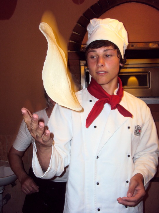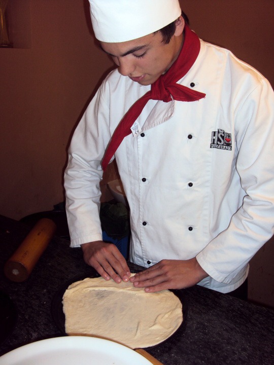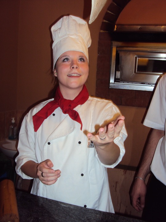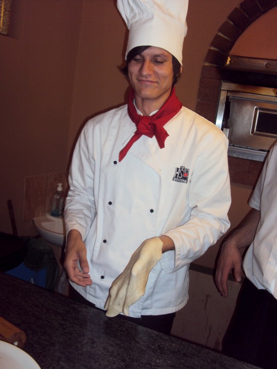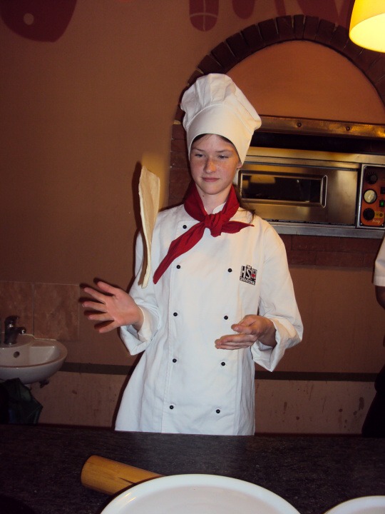 Během přípravy pizzy nám říkali, kolik a v jakém pořadí máme dávat ingredience. Také jsme si mohli vyzkoušet házení pizzy, což nebyla naše silná stránka :-) Pizza byla rychle hotová, a tak jsme se mohli s plnými žaludky dívat na další výkony našich spolužáků.