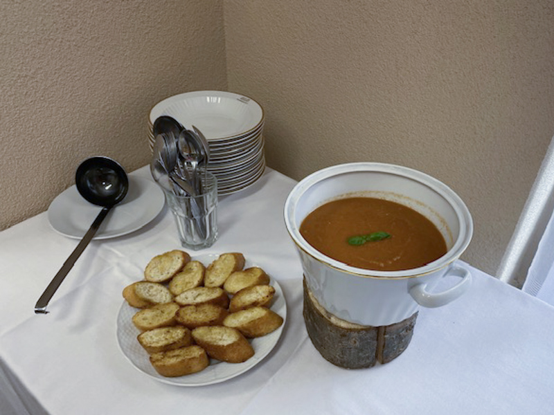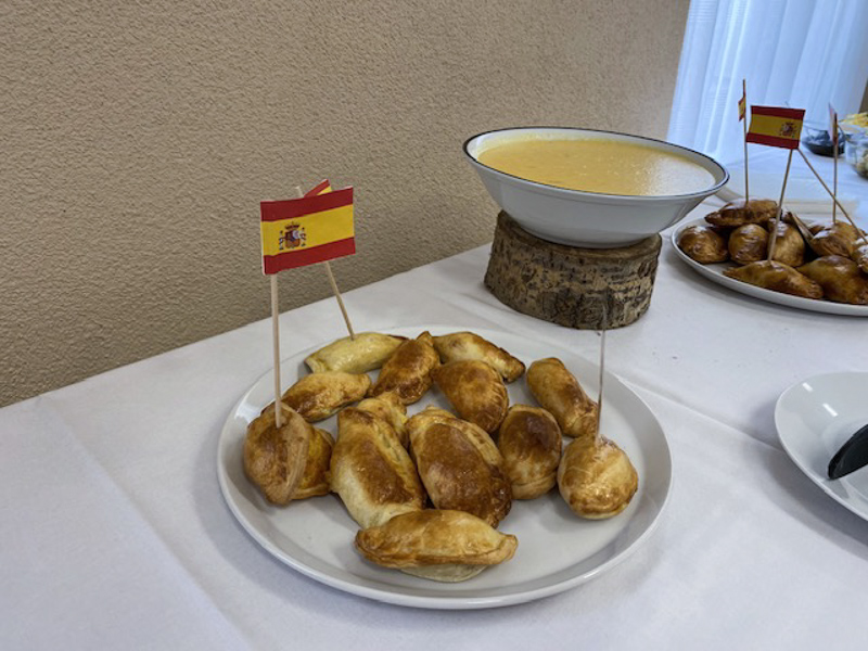 V rámci projektu Komunikace s hostem v cizím jazyce jsme připravili pro svoji třídní učitelku a španělštinářku v jedné osobě Mgr. Pavlínu Frančíkovou tradiční španělská jídla: gazpacho, studenou polévku ideální na léto, ensalada mixta a ensaladilla rusa, paella, slavný pokrm z rýže s krevetami a kuřetem, empanadillas, galicijské taštičky plněné masovou a sýrovou směsí, a churros, lahodný smažený dezert podávaný s horkou čokoládou. Samozřejmě nechyběla ani nealkoholická sangría a španělská hudba.