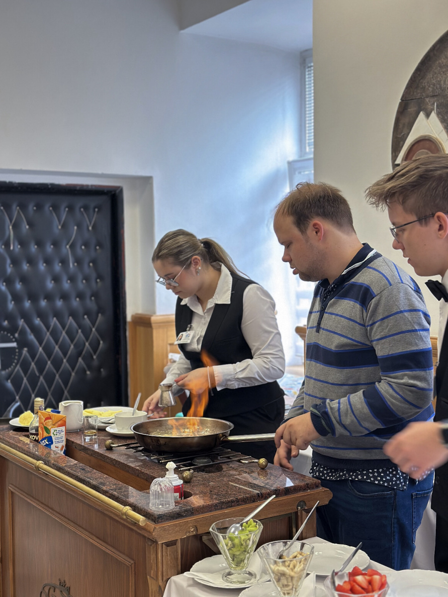 Po kávové části programu následovalo flambování palačinek. Děti se nejprve dozvěděly, co tento proces obnáší, a poté si mohly flambování samy vyzkoušet.