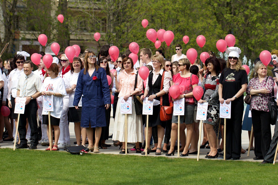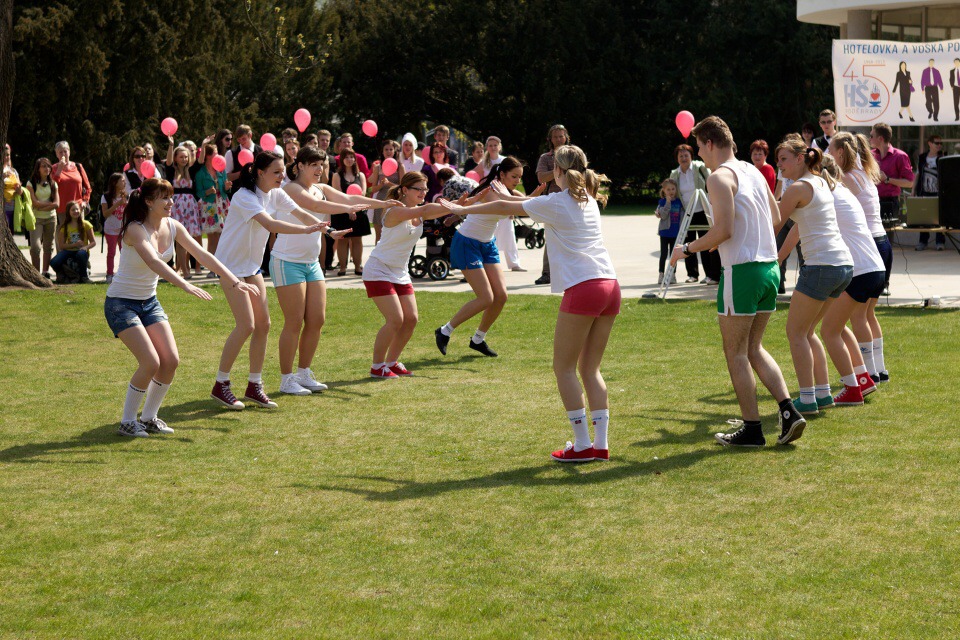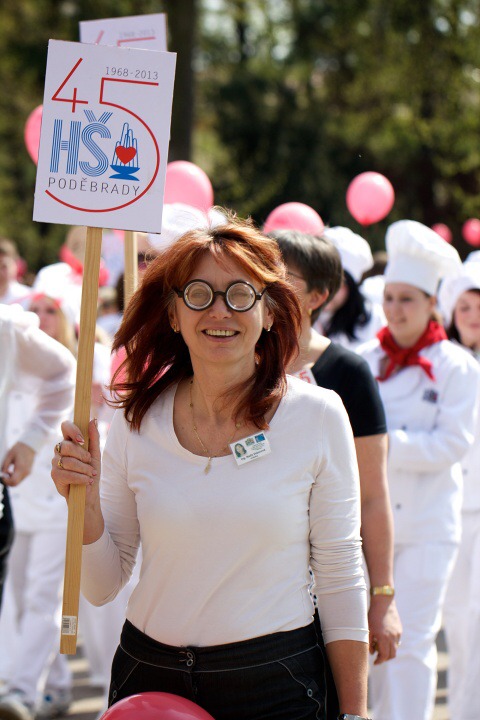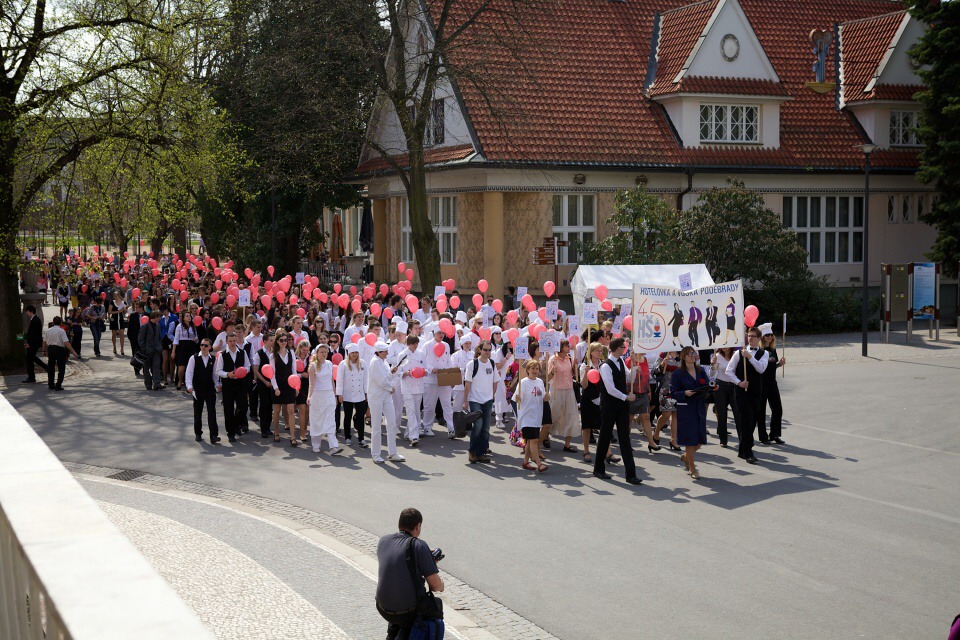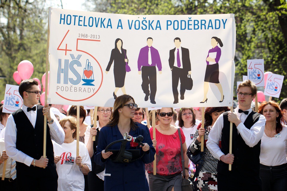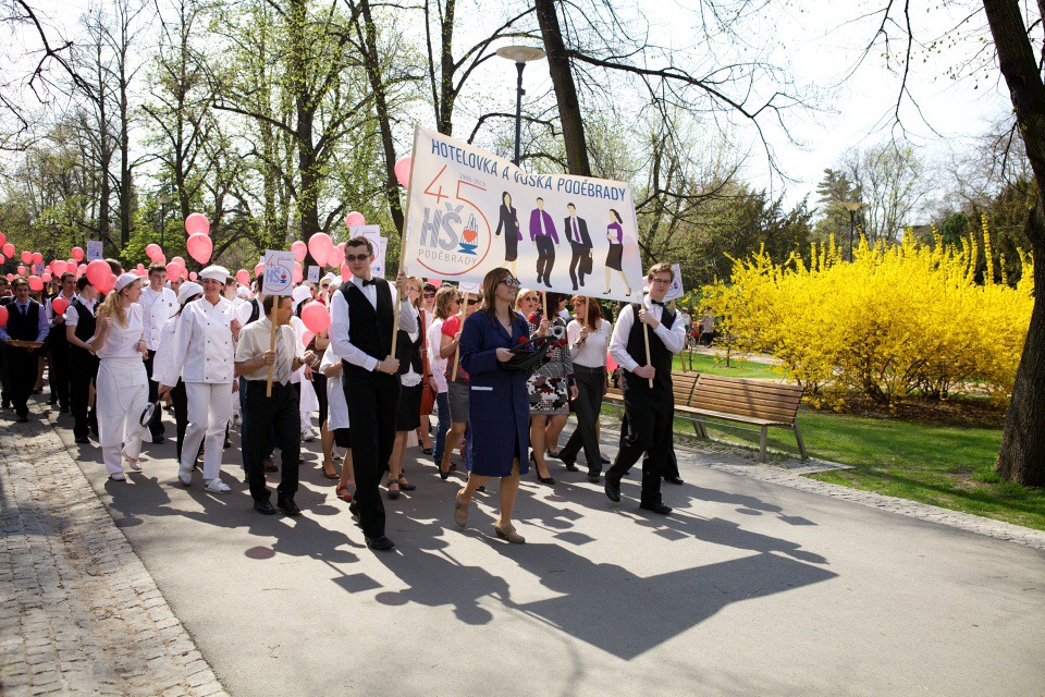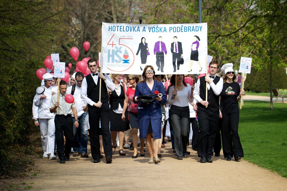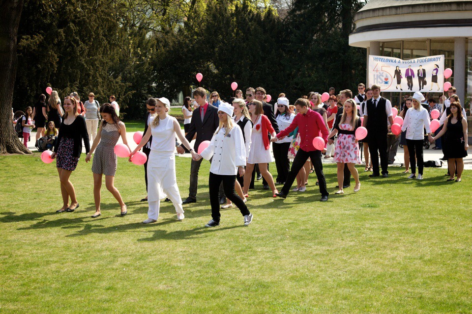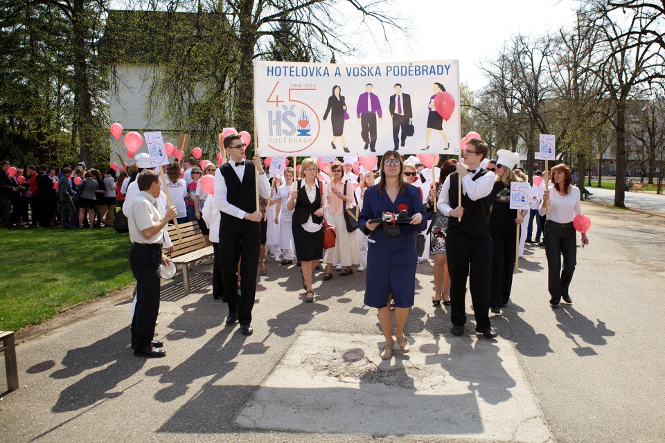 V plné síle a svěžesti si Hotelová škola Poděbrady připomenula v posledním dubnovém týdnu roku 2013 svoje pětačtyřicáté výročí založení. Narozeninová párty se opravdu nebývale vydařila. Vešlo se do ní příjemné úterní setkání bývalých a současných zaměstnanců i středeční happeningový „Retroden naruby“, ve kterém čekala na studenty nejrůznější překvapení – od ranní rozcvičky na domově mládeže až po obsluhující kantory, statečně bojující s nástrahami školní restaurace. Středa pokračovala parádním školním průvodem poděbradskou kolonádou. Nechyběly mažoretky, spartakiádní „Poupata“, několik písničkových a tanečních vystoupení a celé odpoledne vyvrcholilo nezapomenutelným hromadným vypuštěním červených balónků s vepsaným přáním… Čtvrtek patřil veselému hotelováckému víceboji na poděbradské kolonádě i večerní derniéře studentské maturantské kapely, v pátek se letošní maturanti rozloučili se školou posledním zvoněním...