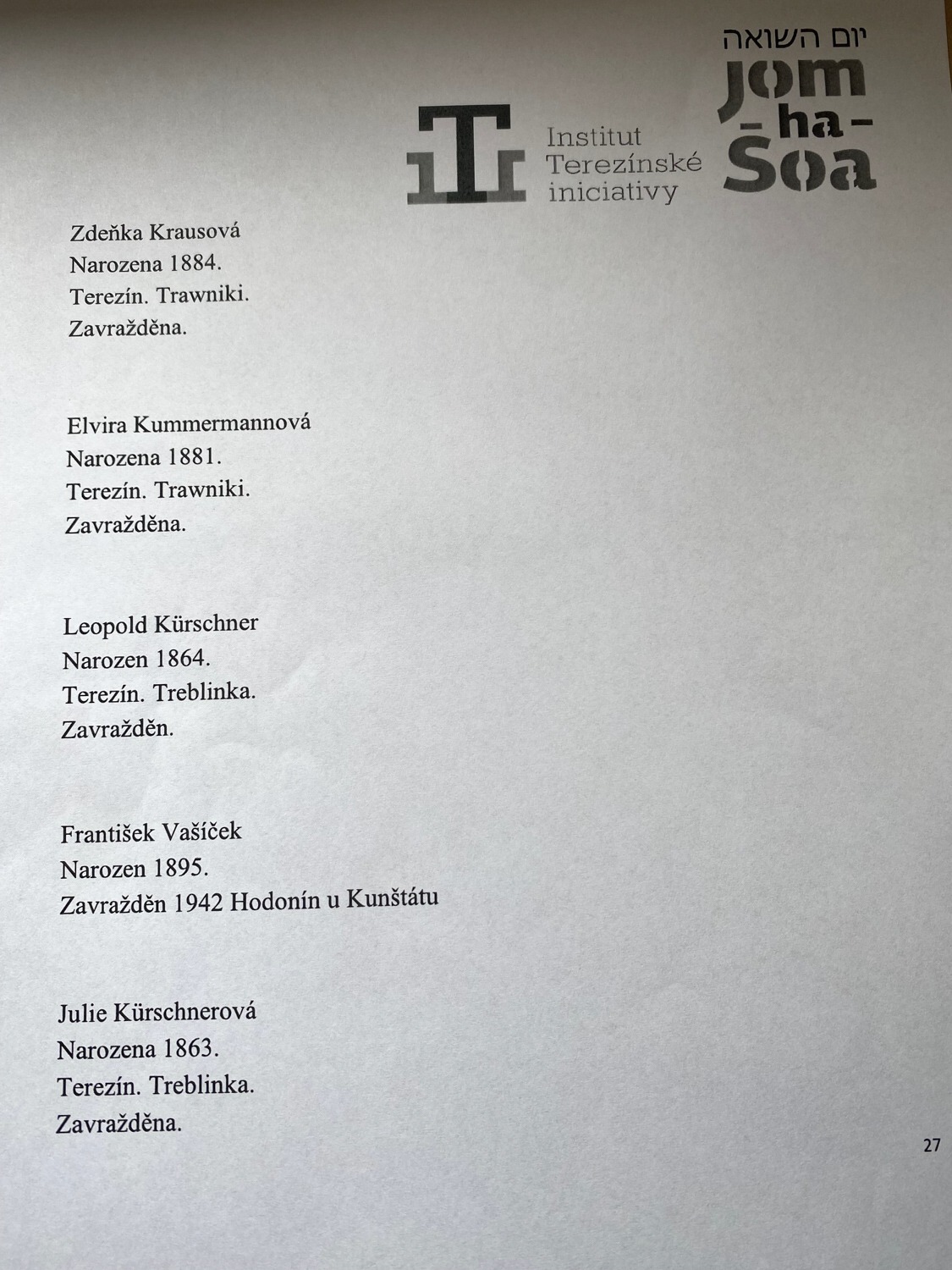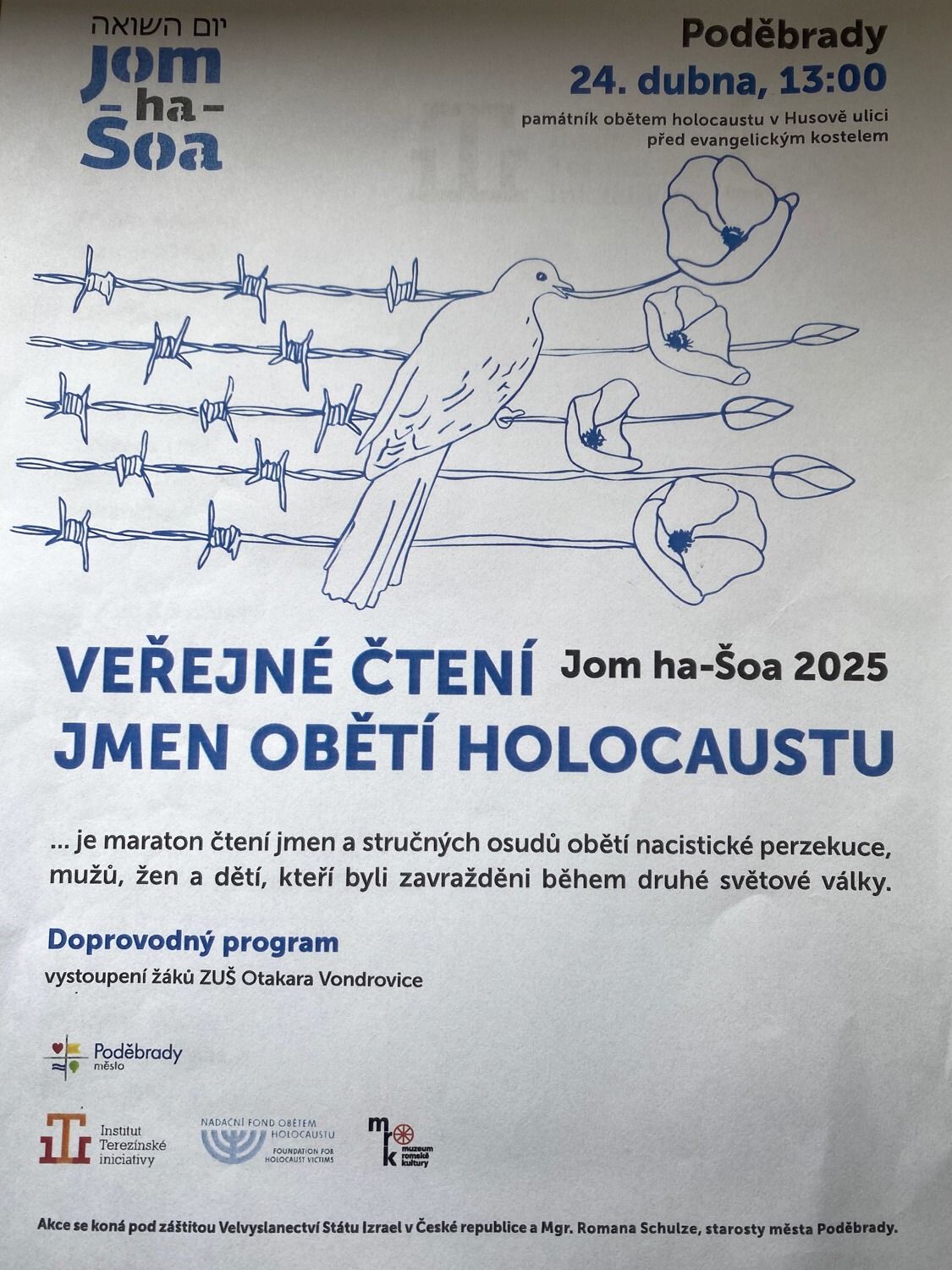 Ve čtvrtek 24. dubna 2025 jsme se zúčastnili u Památníku obětem holocaustu v Poděbradech pietní akce Jom ha-šo'a. V letošním roce se do veřejného čtení jmen obětí holocaustu zapojili kromě Hotelové školy Poděbrady i ostatní žáci a studenti poděbradských základních a středních škol. Nově byly přidány na seznamy i romské oběti holocaustu.
