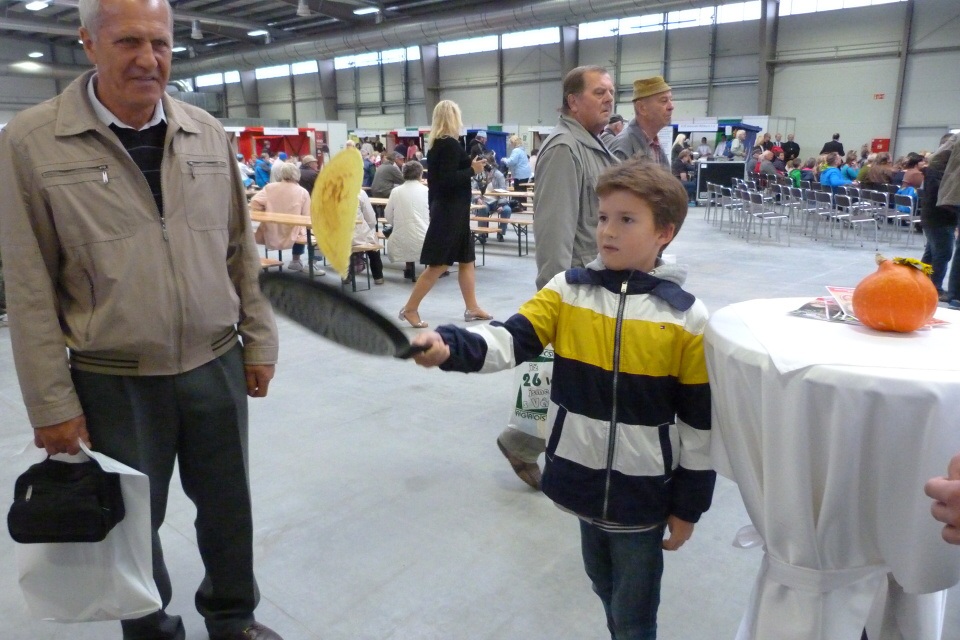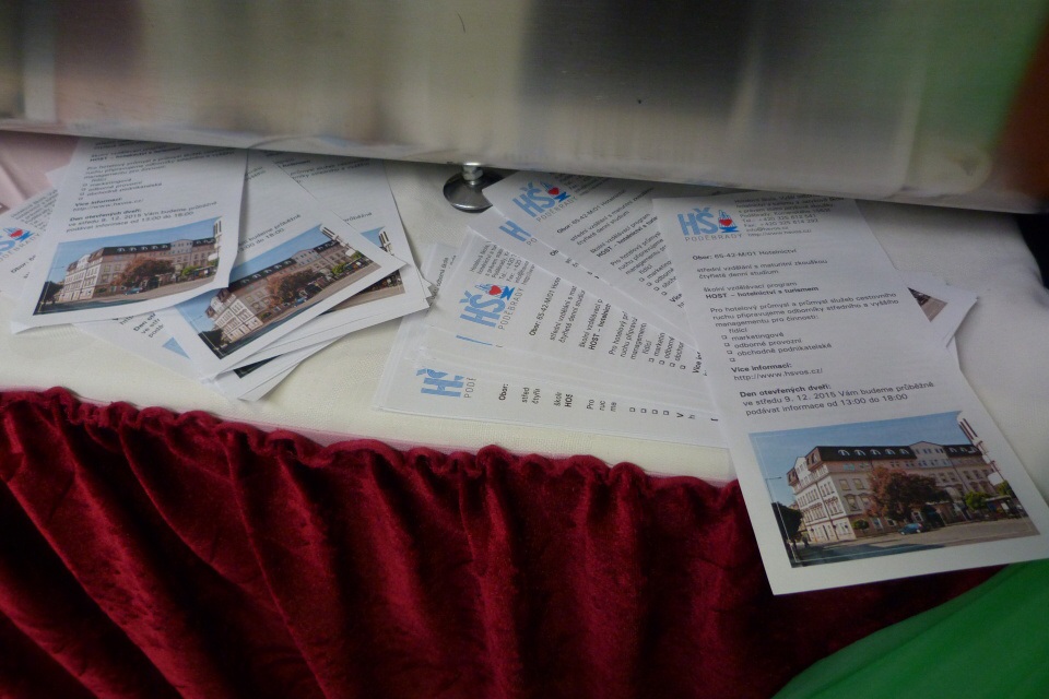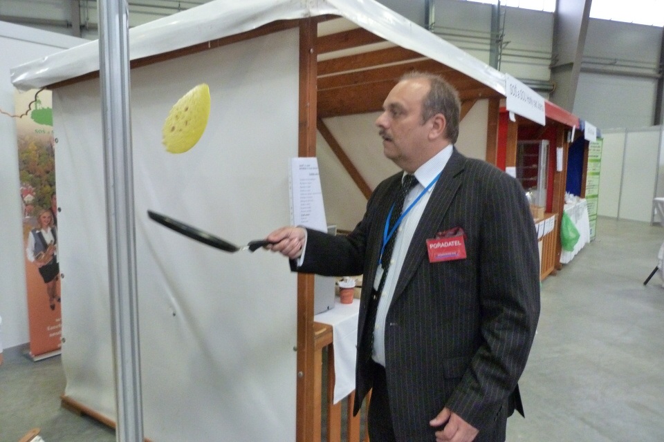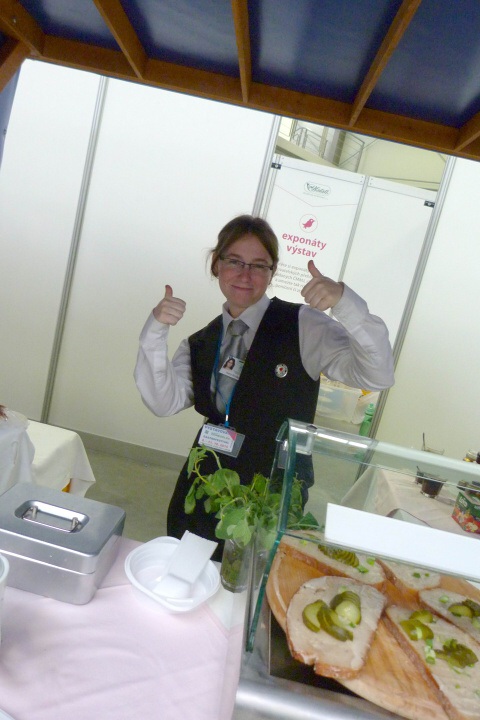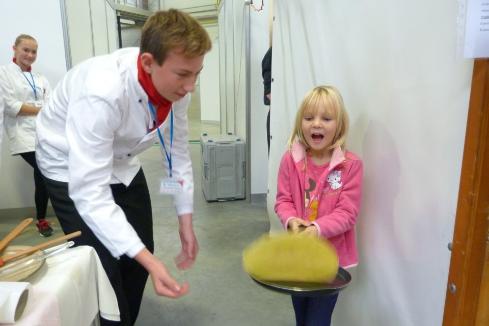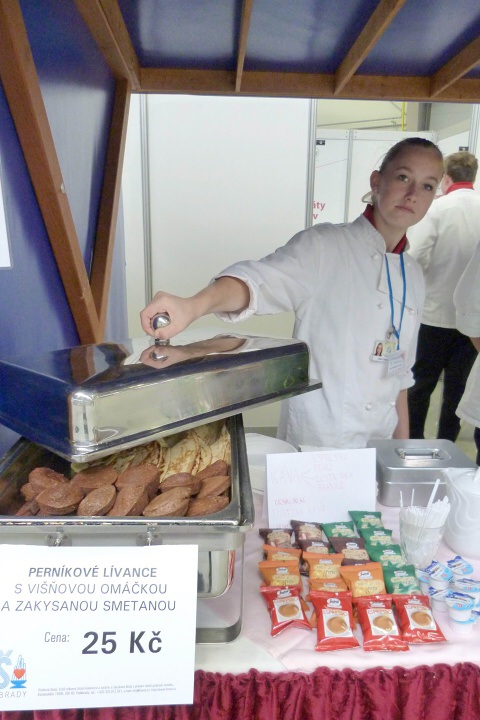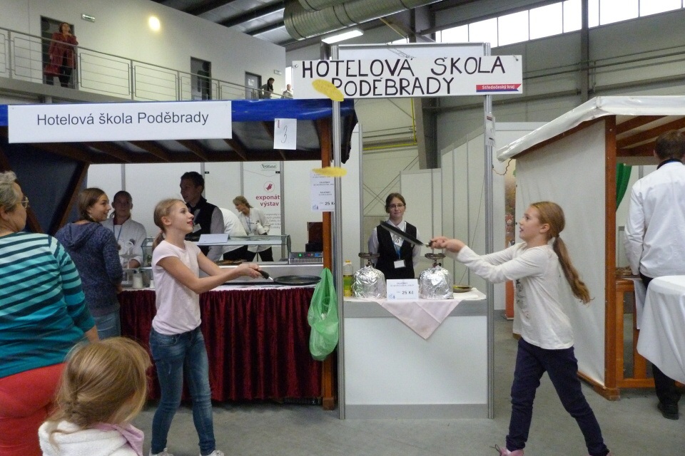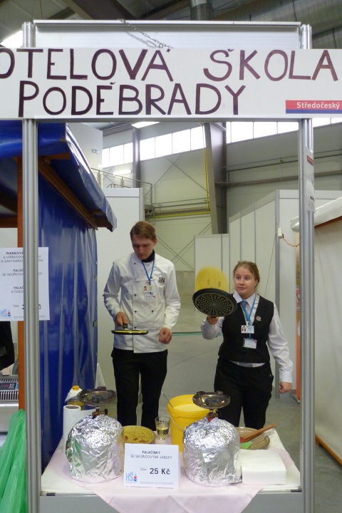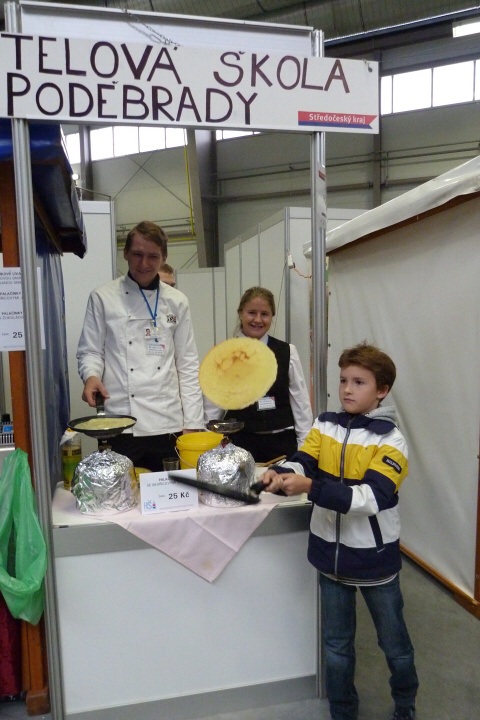 Naše škola se ve stánku prezentovala perníkovými lívanci s višňovou omáčkou a zakysanou smetanou, palačinkami se skořicovými jablky a čokoládou a domácím sádlem se škvarky. Odvážní návštěvníci výstavy si u našeho stánku vyzkoušeli házení palačinek na pánvi a děti vyzvídaly informace o naší škole. Pevně věříme, že pětiletý chlapec, který házel palačinkami na pánvi lépe než někteří z nás, bude jednou naším studentem...