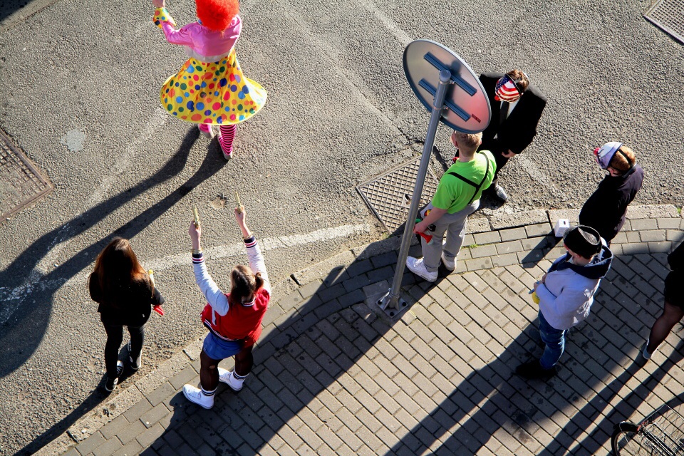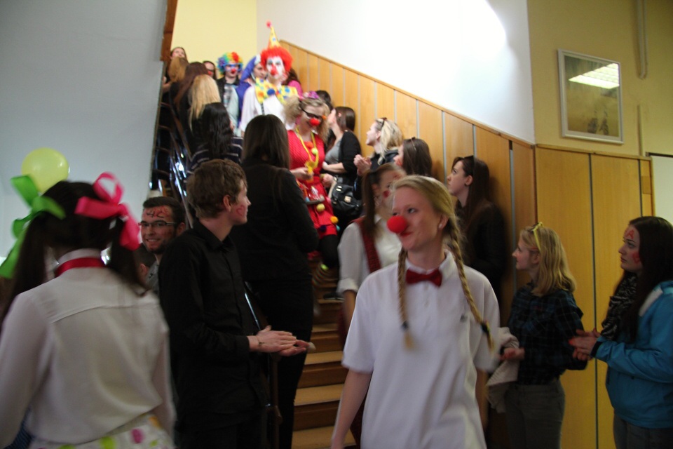V deset hodin odstartovalo samotné poslední zvonění, maturanti šli průvodem po schodech ze 4. patra až do přízemí, kde na ně čekalo symbolické vykopnutí od paní ředitelky.