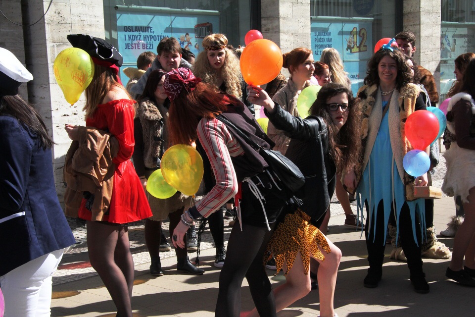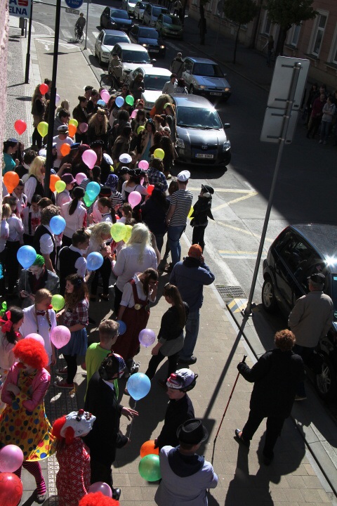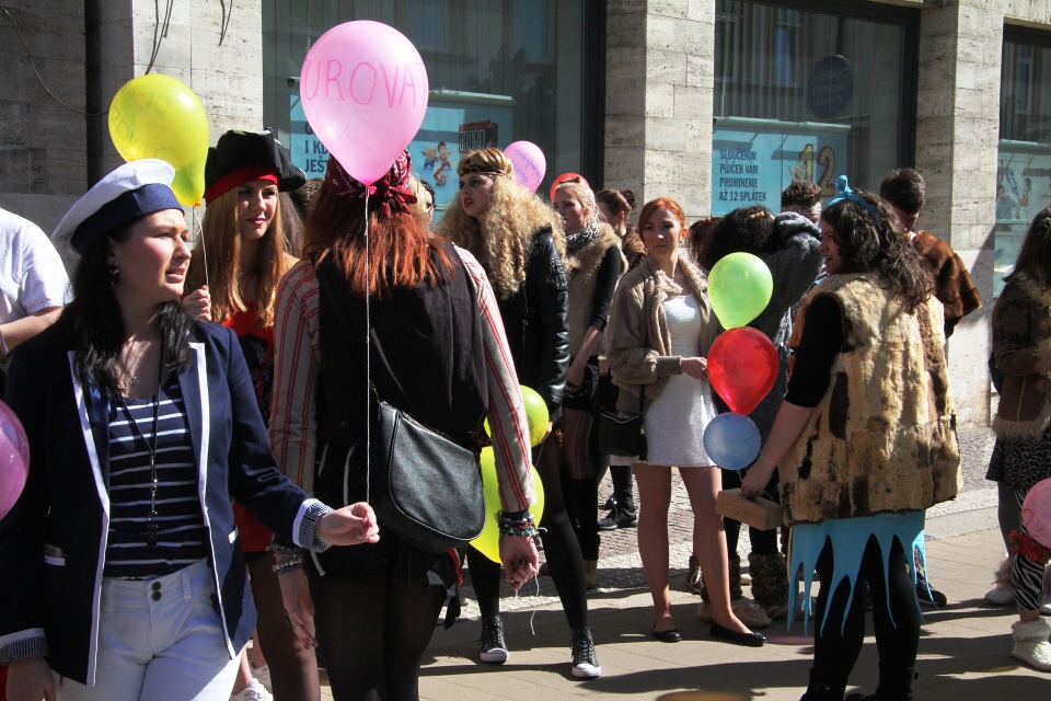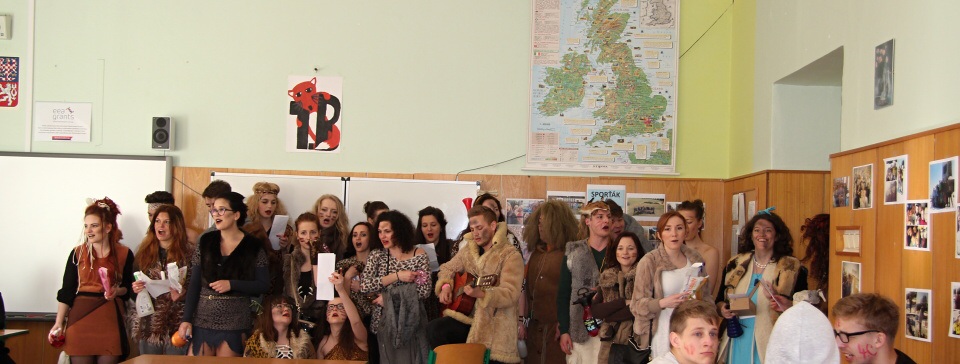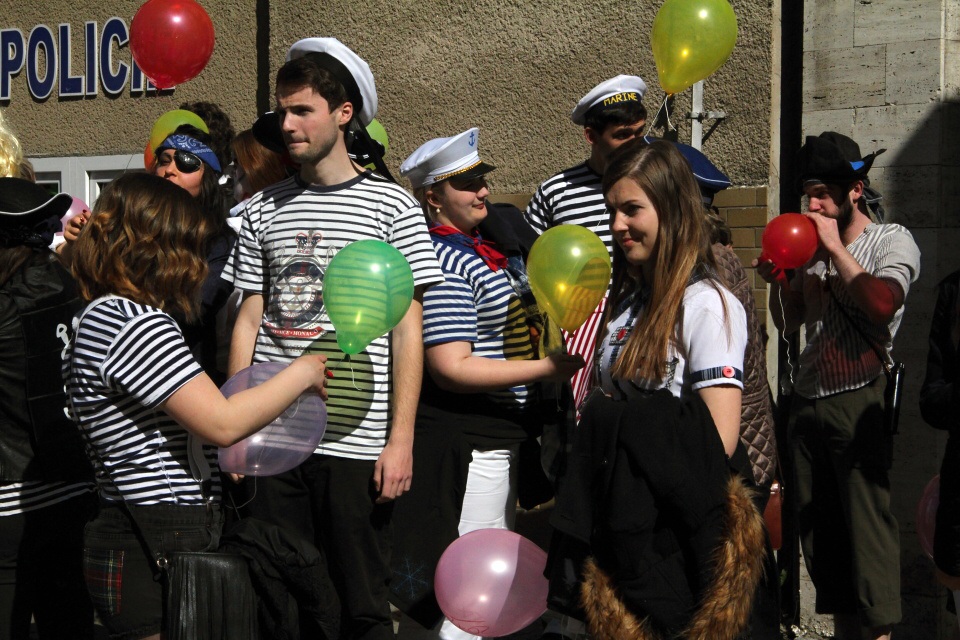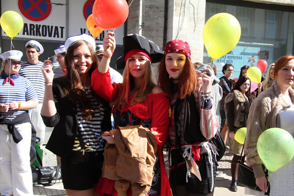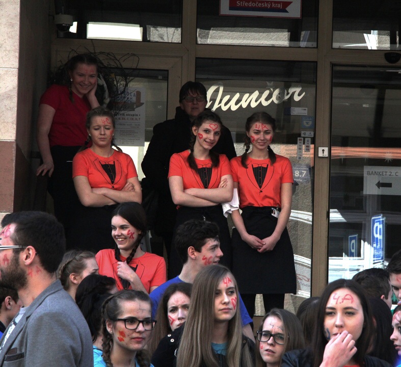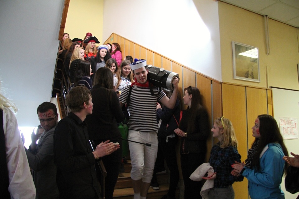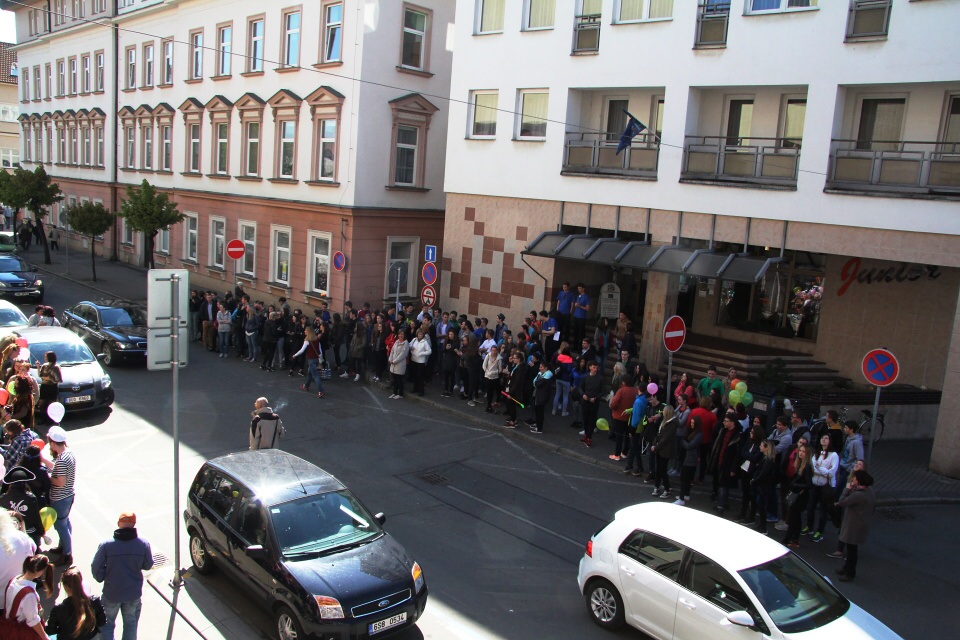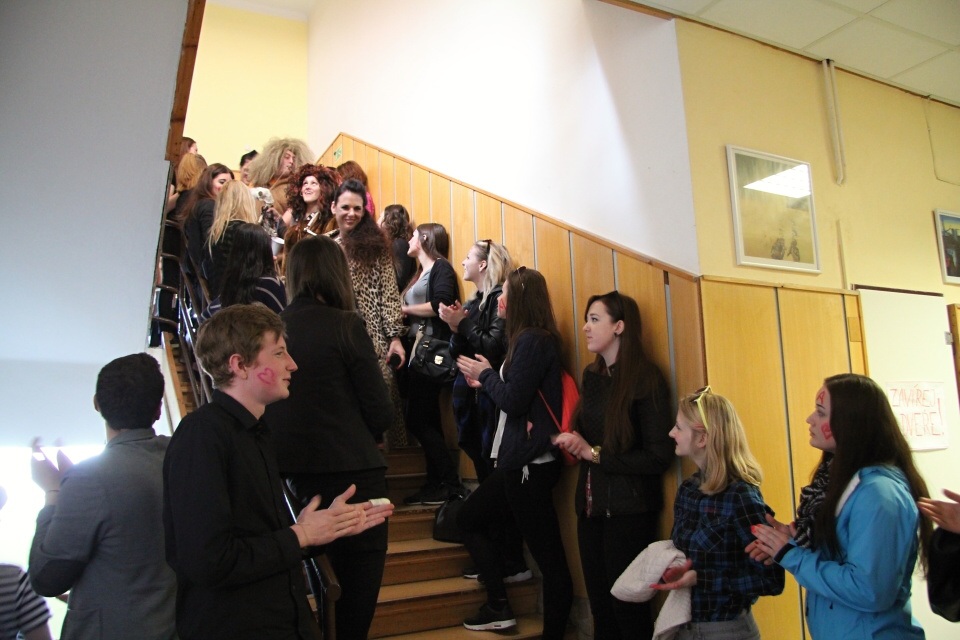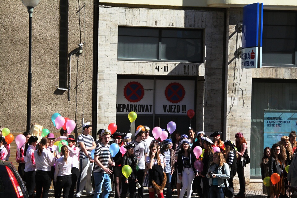 Celá škola se shromáždila před školou a mohly začít studentské oslavy, a to poděbradský Majáles, pořádaný studenty naší školy.