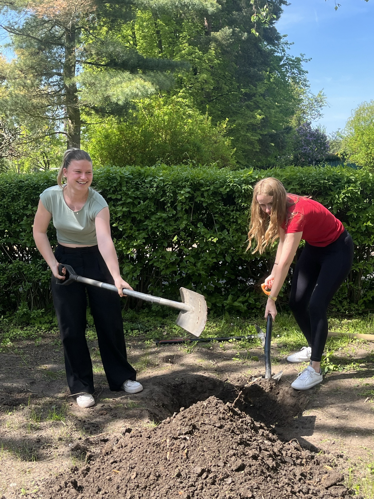Učebnice jsme tentokrát vyměnili za lopaty a pustili se do práce. Každý z nás měl možnost přiložit ruku k dílu – od vykopání jámy, přes samotné zasazení stromu, až po přidání dřevěných tyčí, které nyní slouží jako opora. Překvapilo nás, jak fyzicky náročné sázení stromu může být, ale zvládli jsme to s chutí a úsměvem.