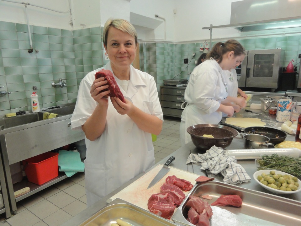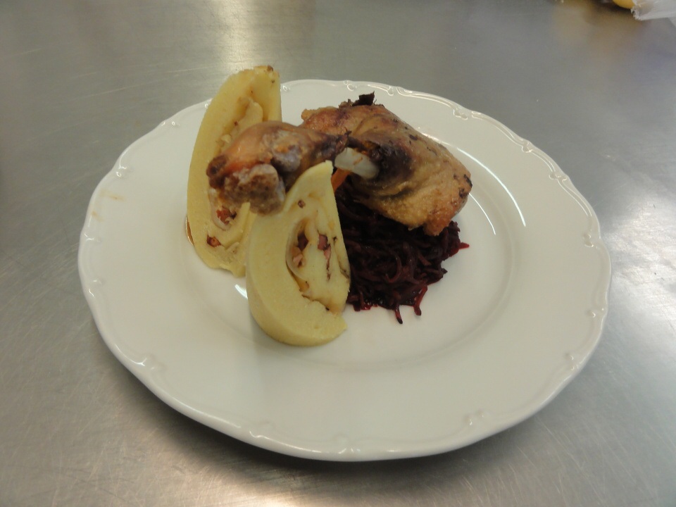 V pátek 6. 2. 2015 na nás čekal už pan lektor Lukáš Limprecht s moderní českou kuchyní. Všichni jsme byli přejedeni z předchozího dne a to na nás čekala hostina o několika chodech. Předkrmem byly nové, moderní šunkové rolky s křenem a okurkové želé, hlavním chodem konfitovaná kachní prsa s knedlíky a červeným zelím, vepřové a jehněčí maso, polévka kulajda a celerový krém a jako desert lívance s jablky a hruškami. Škoda jen, že se nepodávalo i vychlazené pivo. Česká kuchyně je česká kuchyně…