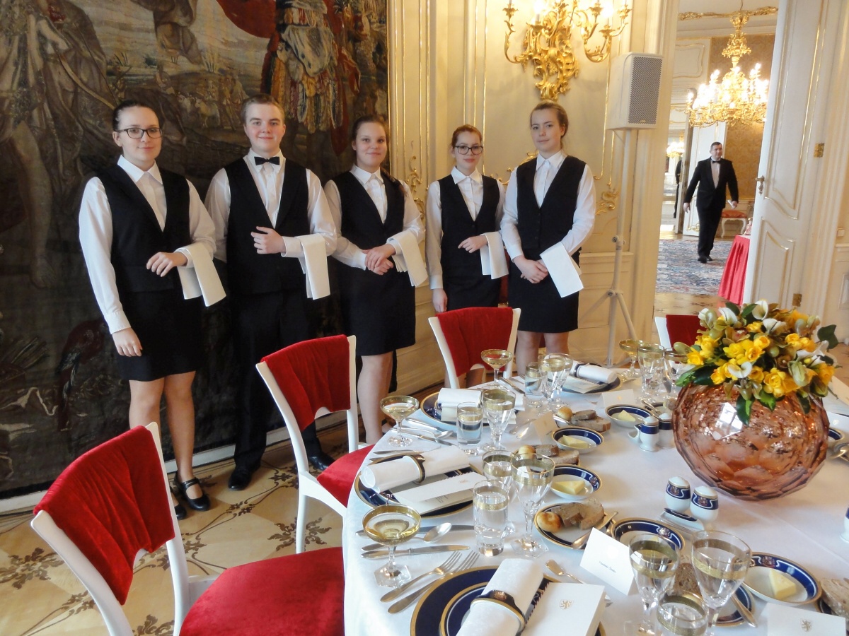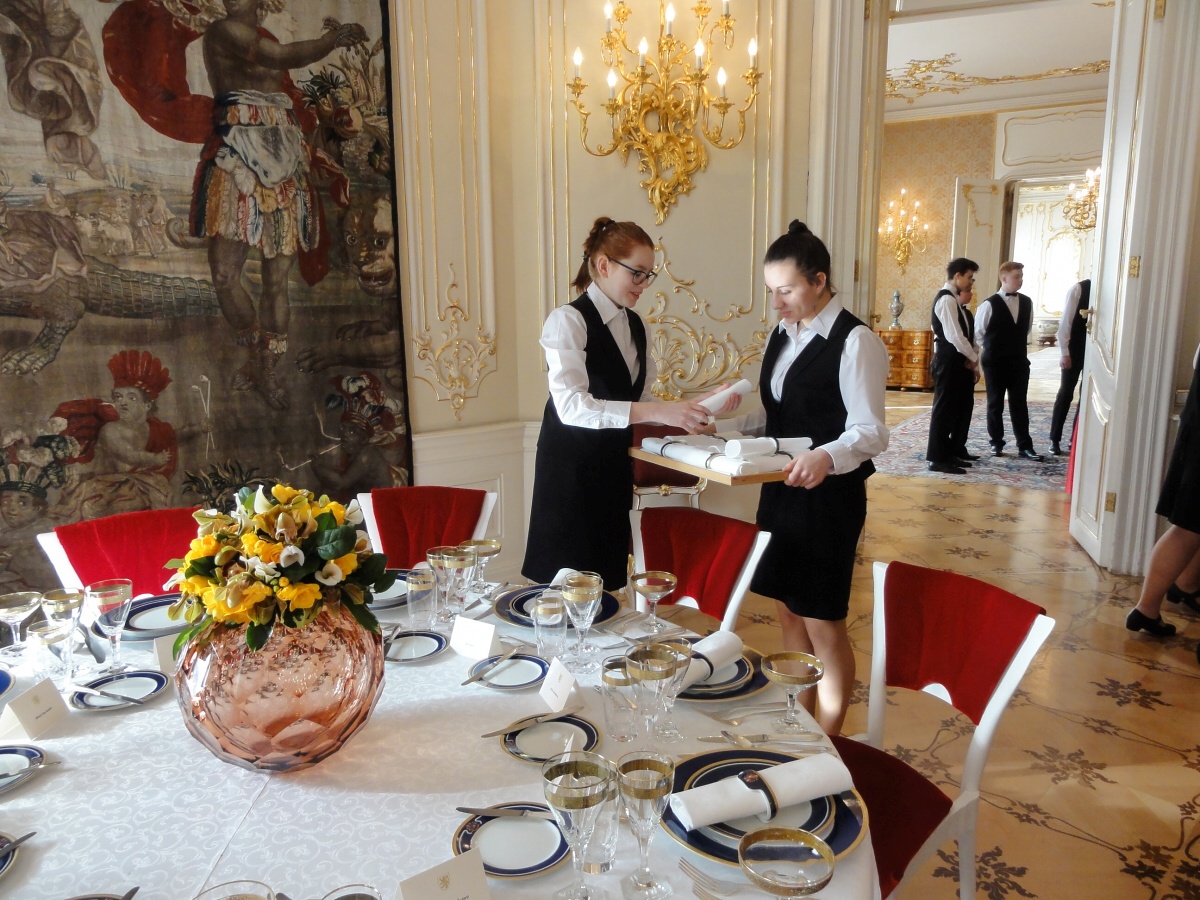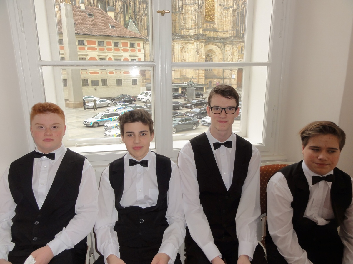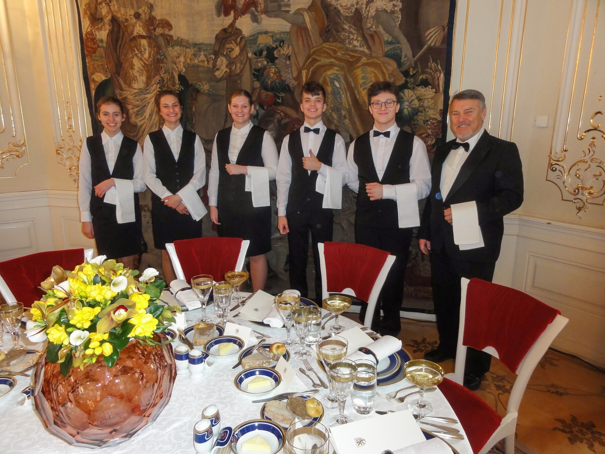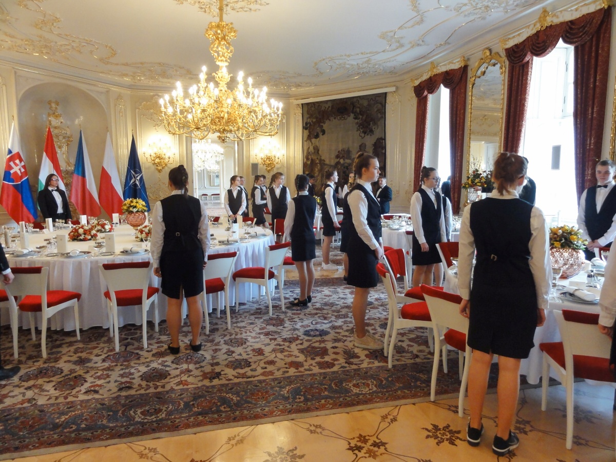 Ráno jsme se všichni sešli u autobusu a v doprovodu paní učitelky Evy Krátké jsme se vydali na cestu. Na Hradě na nás už čekaly spousty policistů a bezpečnostních kontrol, které jsme všichni zdárně absolvovali. Když jsme se převlékli, vyrazili jsme dlouhými chodbami staré budovy Hradu do Hudebního salonu, kde byly už přípravy v plném proudu. Personál byl velmi milý a vstřícný, a tak nám šlo prostírání rychle od ruky. Poté jsme byli rozděleni na jednotlivé úseky a probíhal nácvik samotné obsluhy. Protože to byla pro většinu z nás první velká akce, nevyhnuli jsme se velkému stresu, kterým pro většinu bylo glošování, překládání a servis nápojů. Jsme přece jenom v prvním ročníku a tyto dovednosti se budeme ve škole teprve učit a zdokonalovat je. Následoval náš oběd v hradní personální jídelně a pak už samotná obsluha.