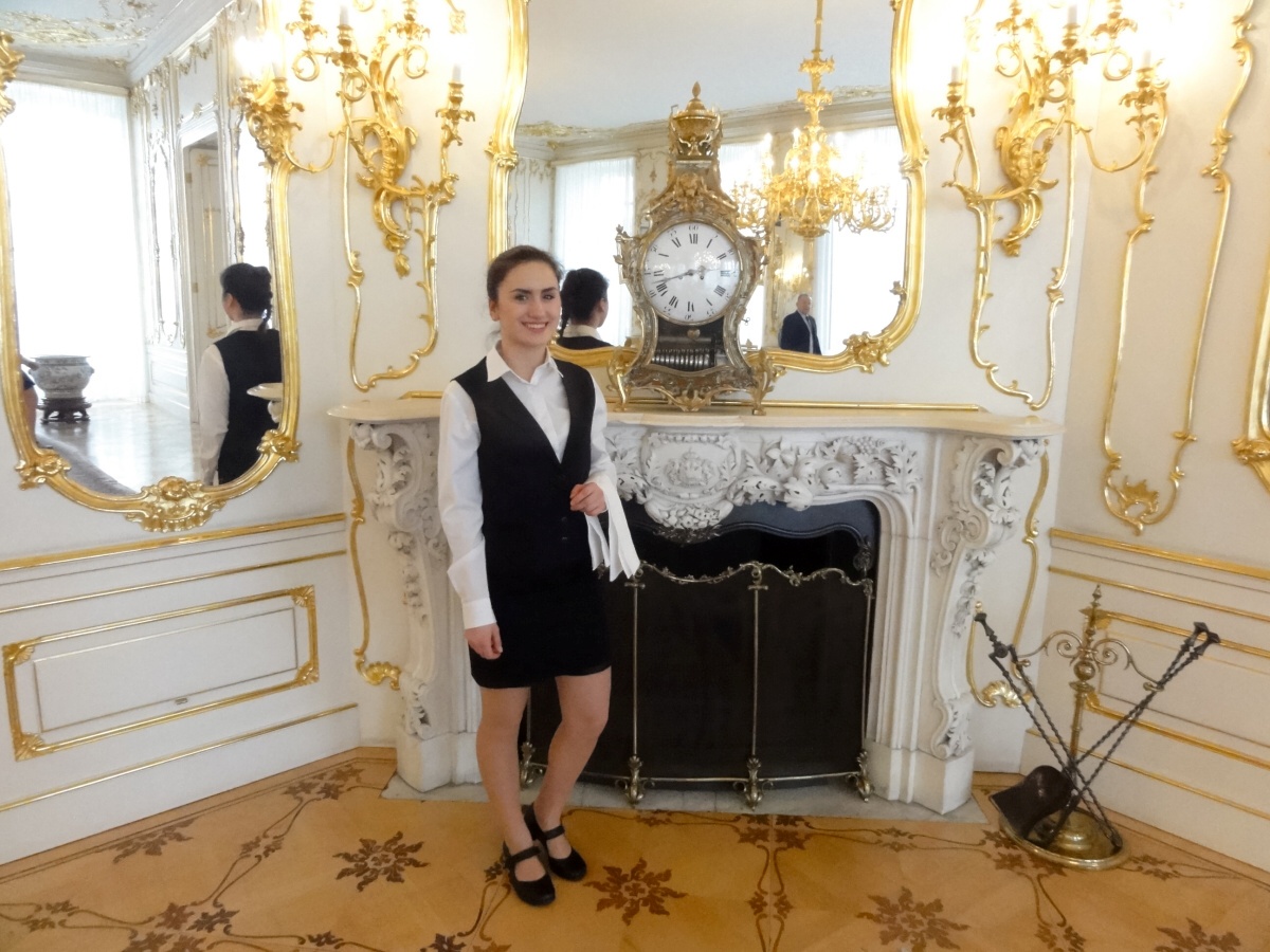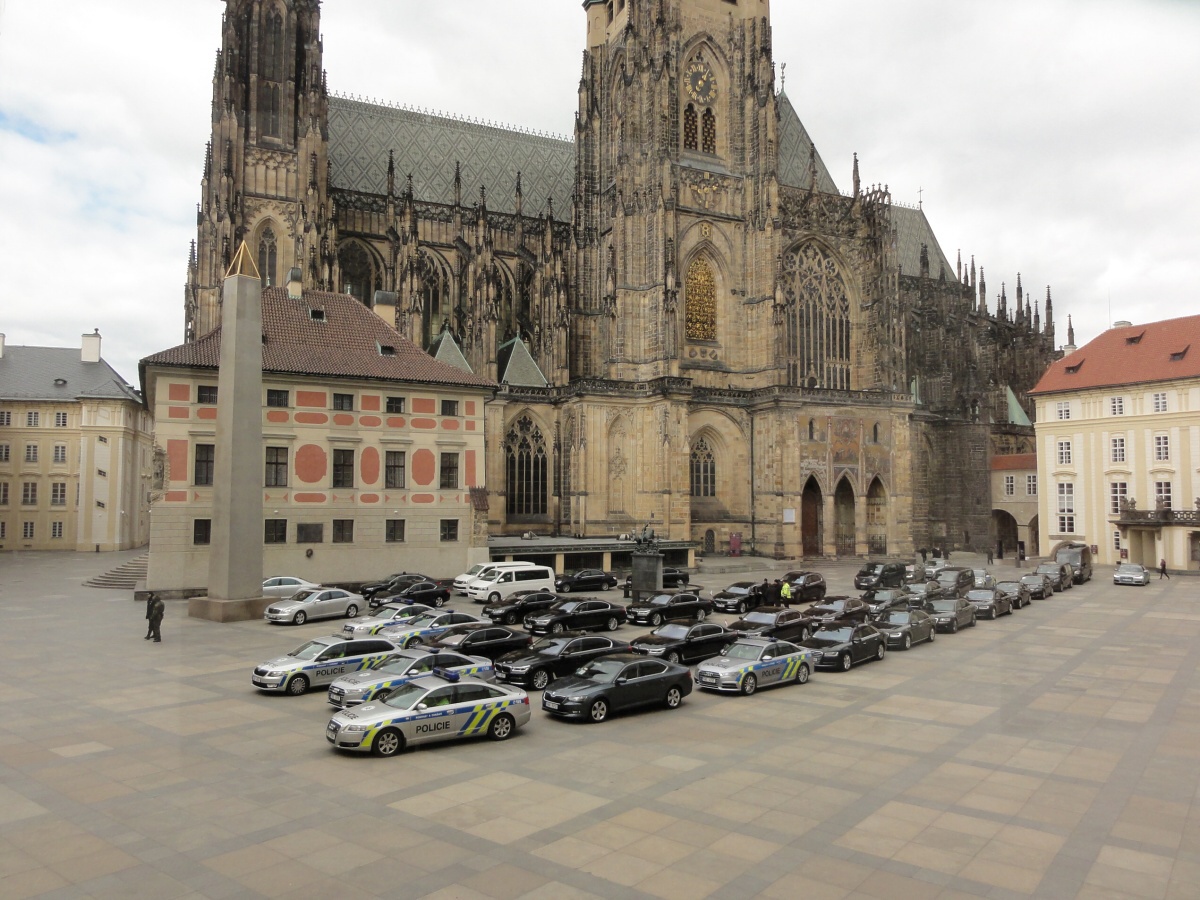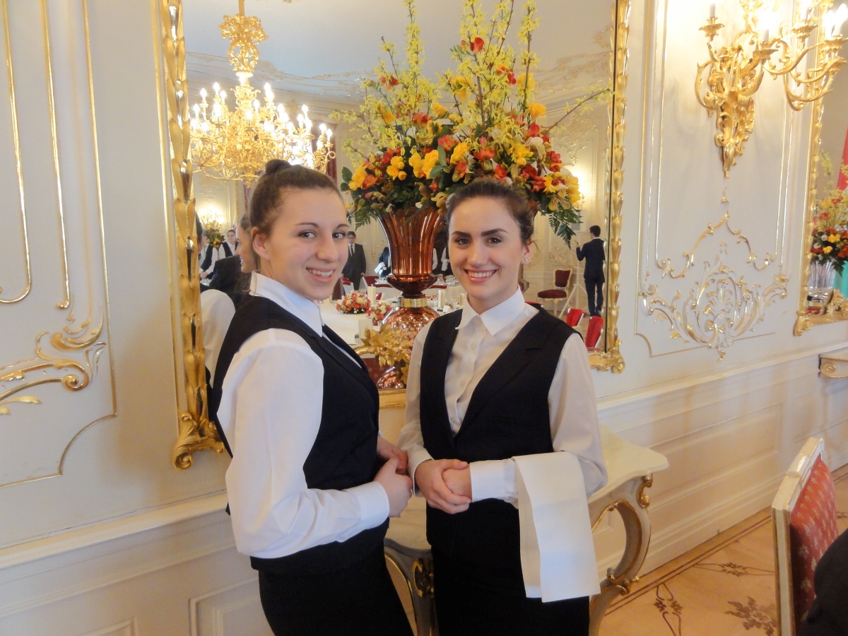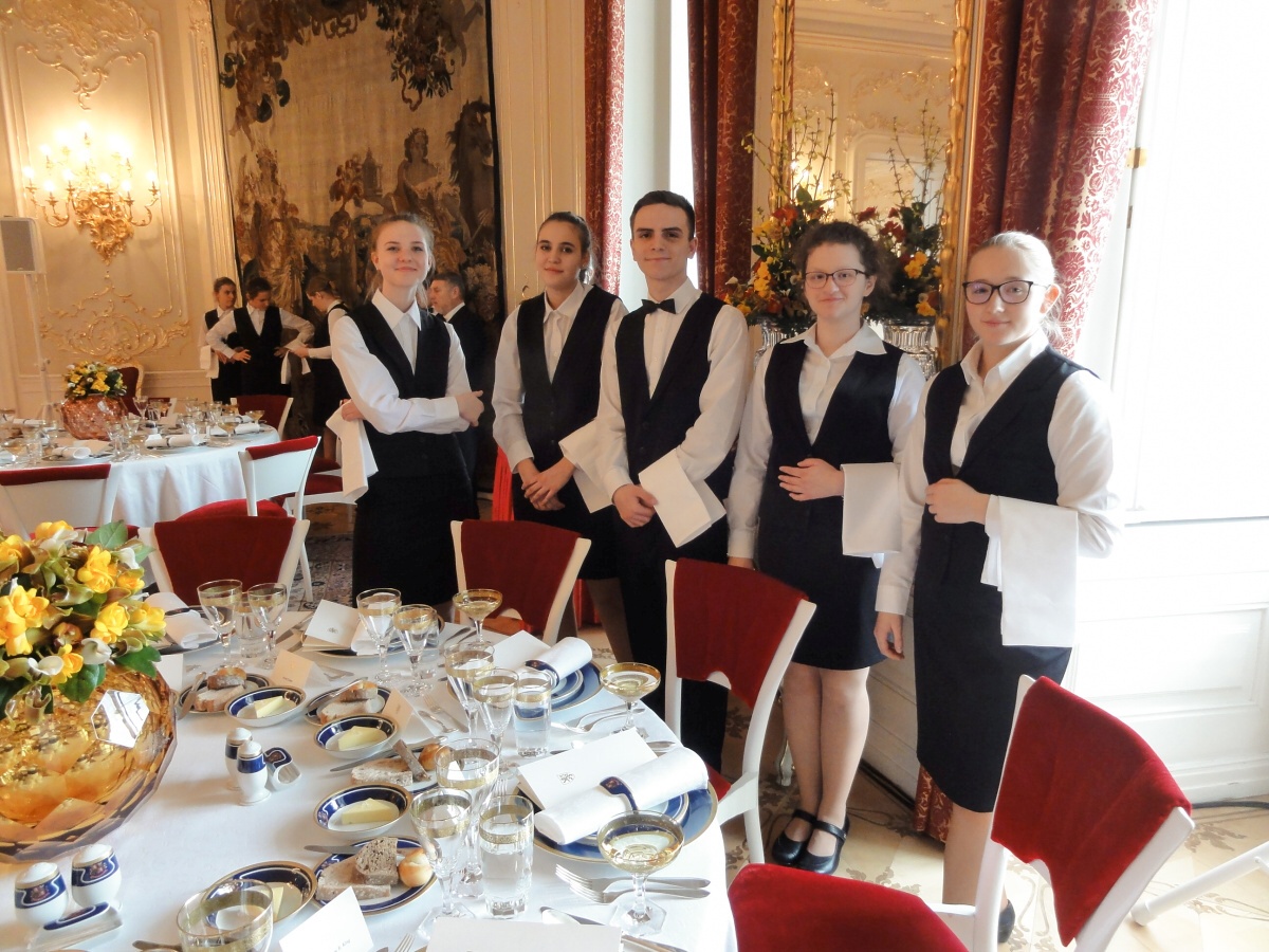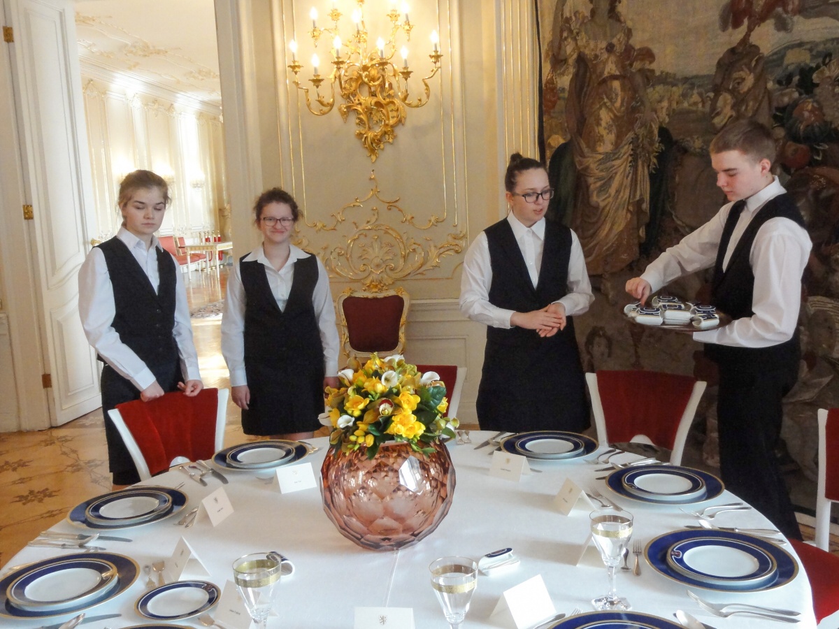 Ráno jsme se všichni sešli u autobusu a v doprovodu paní učitelky Evy Krátké jsme se vydali na cestu. Na Hradě na nás už čekaly spousty policistů a bezpečnostních kontrol, které jsme všichni zdárně absolvovali. Když jsme se převlékli, vyrazili jsme dlouhými chodbami staré budovy Hradu do Hudebního salonu, kde byly už přípravy v plném proudu. Personál byl velmi milý a vstřícný, a tak nám šlo prostírání rychle od ruky. Poté jsme byli rozděleni na jednotlivé úseky a probíhal nácvik samotné obsluhy. Protože to byla pro většinu z nás první velká akce, nevyhnuli jsme se velkému stresu, kterým pro většinu bylo glošování, překládání a servis nápojů. Jsme přece jenom v prvním ročníku a tyto dovednosti se budeme ve škole teprve učit a zdokonalovat je. Následoval náš oběd v hradní personální jídelně a pak už samotná obsluha.