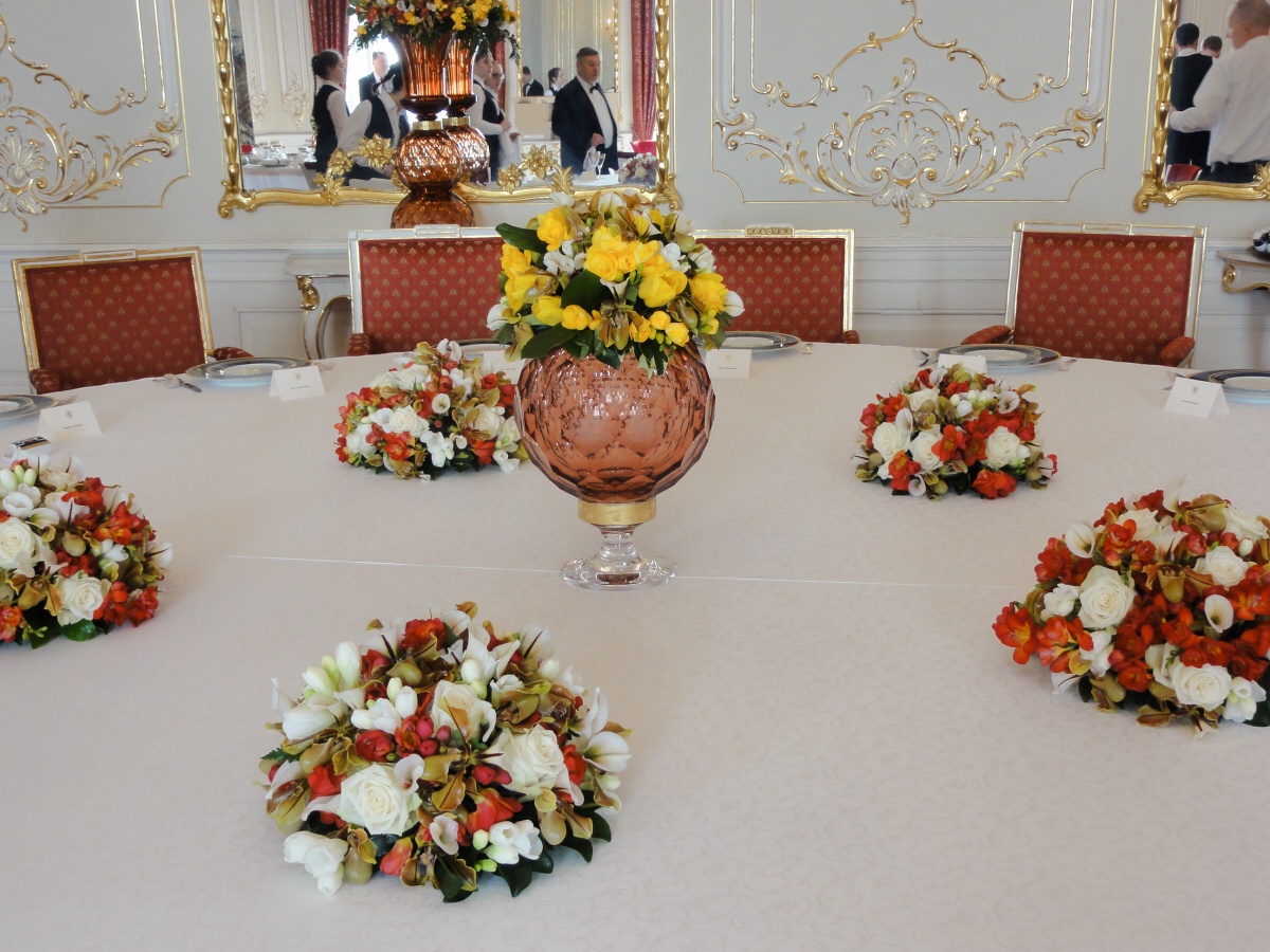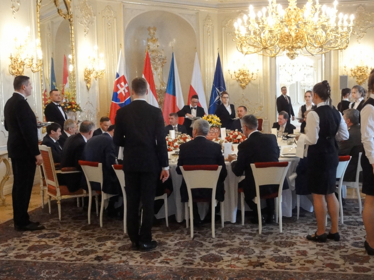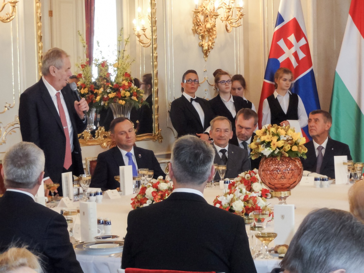 V 12:45 se otevřely dveře sálu a začali se scházet přední političtí představitelé jednotlivých států. Mohli jsme zde zahlédnout a pak obsluhovat prezidenty, premiéry, ministry i velvyslance. Svou přítomností akci poctila i bývalá ministryně zahraniční USA paní Madeleine Albrightová. Nakonec přišli i všichni čtyři prezidenti. Celý oběd začal proslovem pana Miloše Zemana. Následovala obsluha. I přes náš velký stres z tak odpovědné a odborně náročné práce, jsme vše úspěšně zvládli, dokonce i glošování, a to díky trpělivému přístupu naší paní učitelky a veškerého hradního personálu. Po skončení oběda a odchodu všech hostů jsme museli ještě uklidit a vrátit salon do původního stavu. Pak už jsme se jen rozloučili, převlékli a někdy v 15:30 jsme opouštěli prostory Hradu zcela vyčerpaní, ale šťastní a obohacení o první velkou gastronomickou akci v našem životě, kterou jsme zvládli na jedničku s hvězdičkou (podle vyjádření vedení hradního servisu).