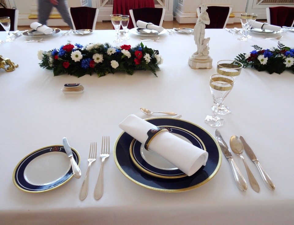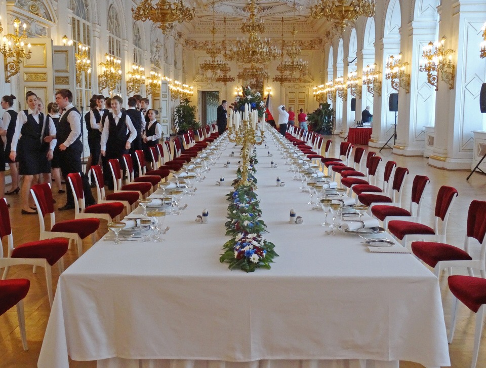 V osm hodin večer jsme už byli všichni připraveni u tabule a netrpělivě čekali na příchod pana prezidenta. Ten se ovšem zpozdil a dorazil i se všemi hosty až někdy okolo čtvrt na devět. Když všichni zasedli k tabuli, přišel na řadu proslov obou prezidentů následovaný hymnami obou států. Bylo vidět, že spousta z nás má trému, ale doufali jsme, že nic nepokazíme a vše bude probíhat hladce. To se samozřejmě nepovedlo. Každý si sice říkal, že to bude v pohodě, že nic nezkazí, ale nečekaně jsem to byl já, kdo to pokazil. Servis předkrmu proběhl v pořádku. Problém nastal při debarasu použitého inventáře po předkrmu. Mimo jiné totiž byl na stole založený talířek na pečivo a menší miska na máslíčko. Ty se měly debarasovat až po hlavním chodu, a jak jste si už určitě domysleli, já je debarasoval už po předkrmu. Naštěstí z toho nebylo nic hrozného, pouze výtka od vedoucího obsluhy. Zbytek večera probíhal hladce.