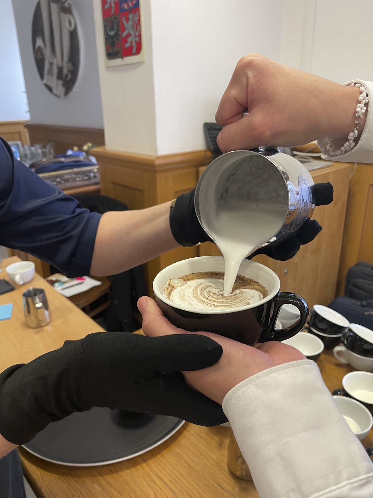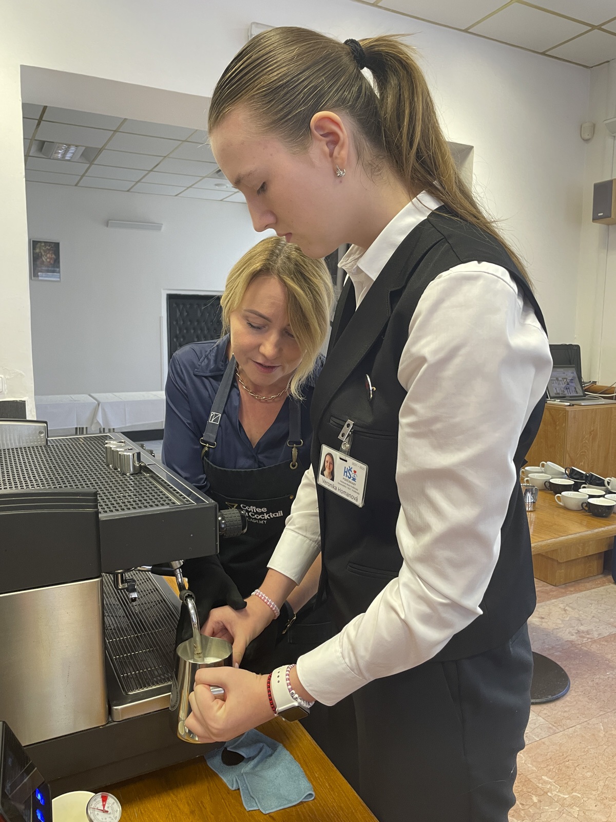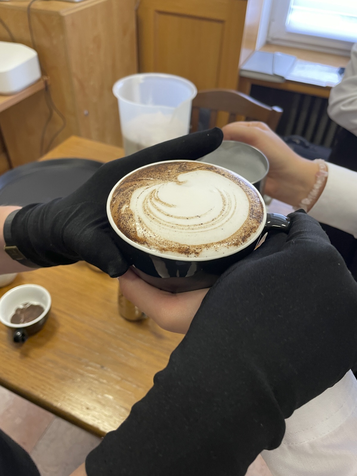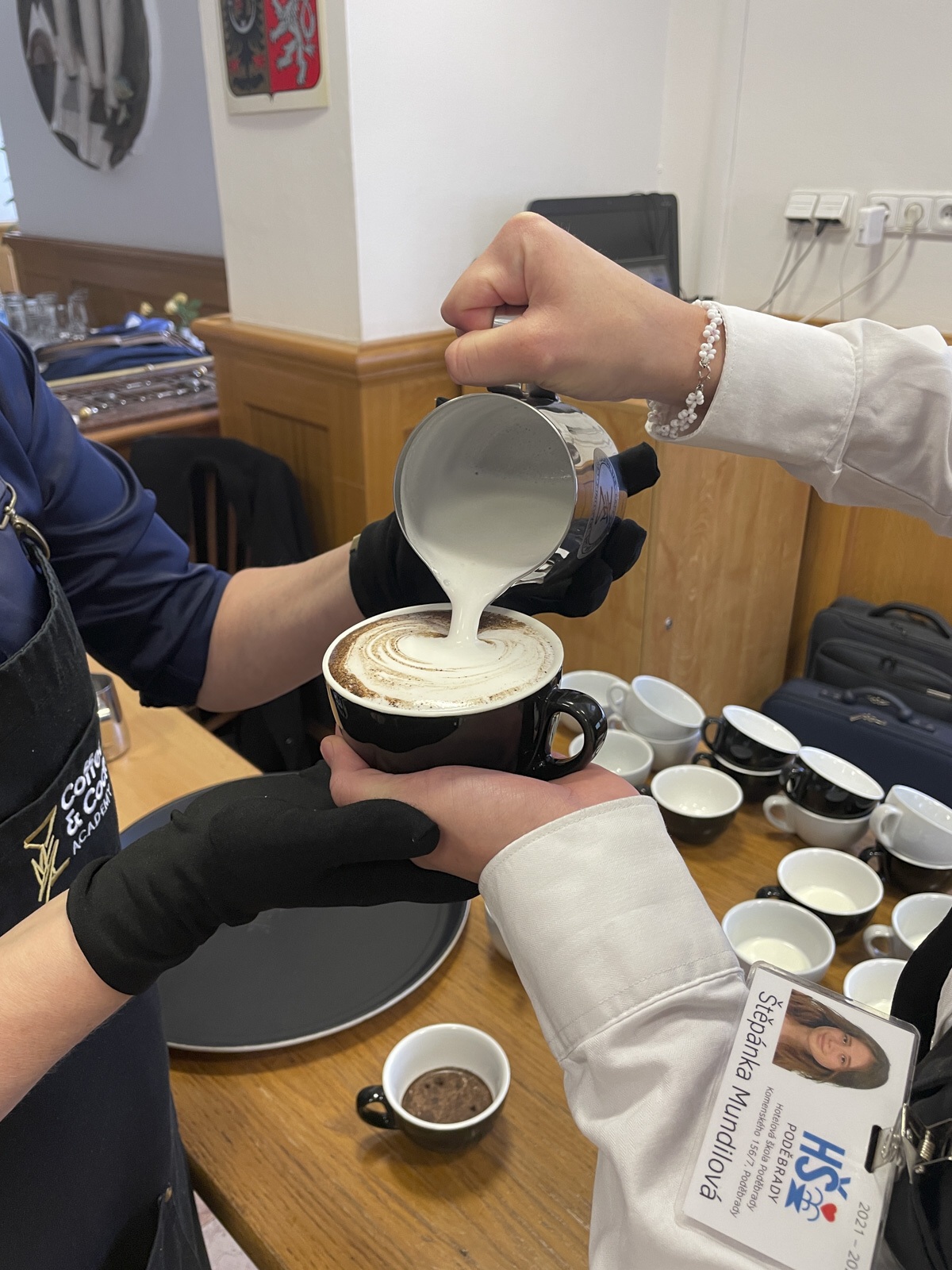 Druhý den byl zaměřený na dodržování hygienických pravidel, šlehání mléčné pěny a dokonalou přípravu cappuccina. Nemohla chybět ani zkouška latte art, kde se studenti z plných sil snažili o nejhezčí jablíčko či rosettu.