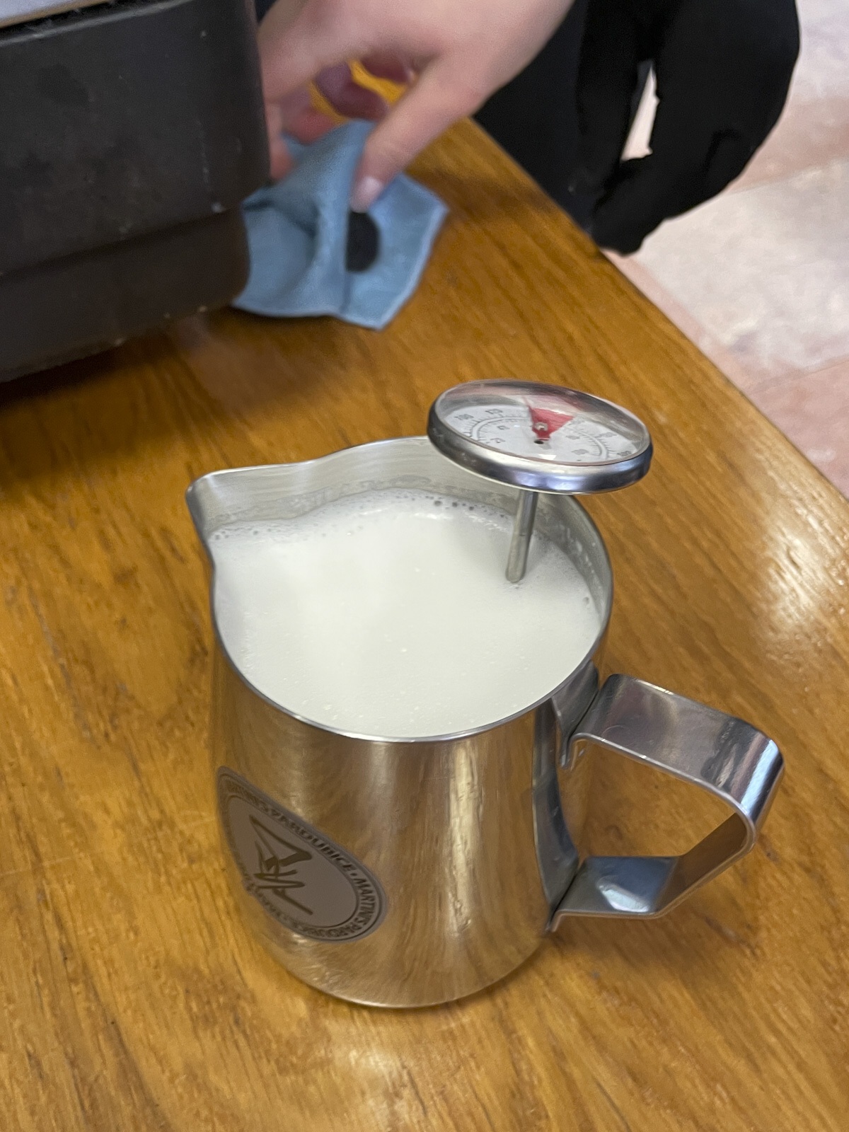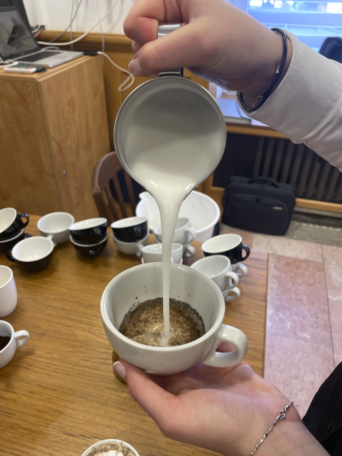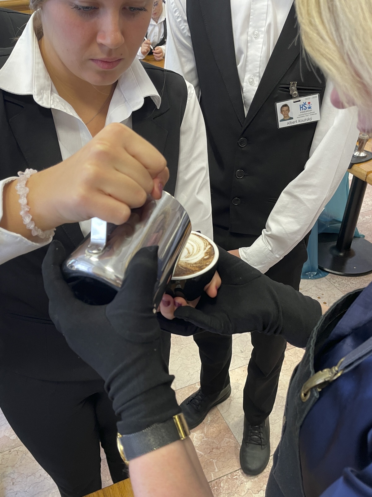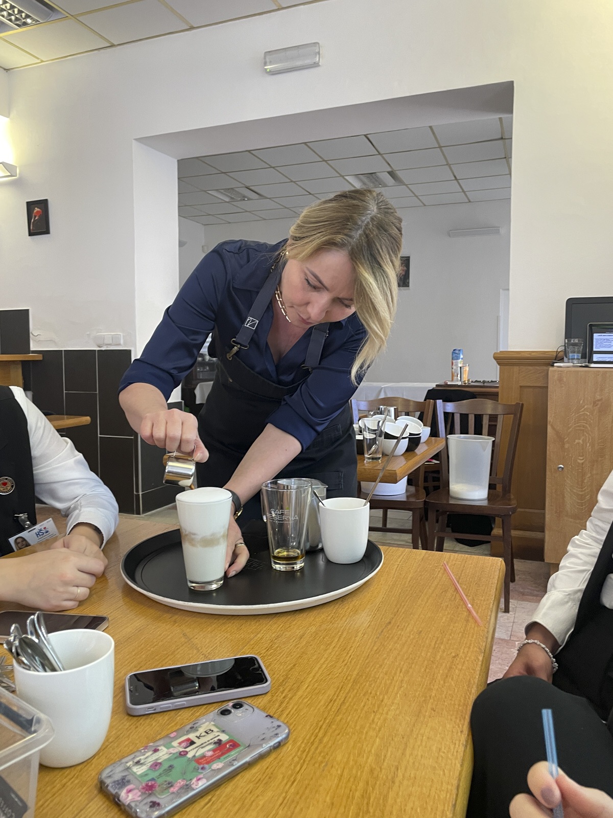 Druhý den byl zaměřený na dodržování hygienických pravidel, šlehání mléčné pěny a dokonalou přípravu cappuccina. Nemohla chybět ani zkouška latte art, kde se studenti z plných sil snažili o nejhezčí jablíčko či rosettu.